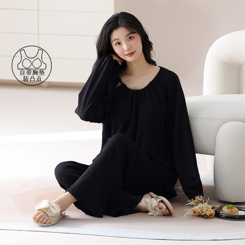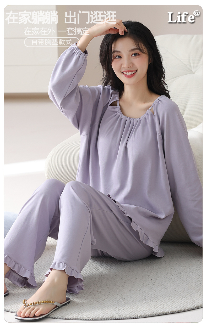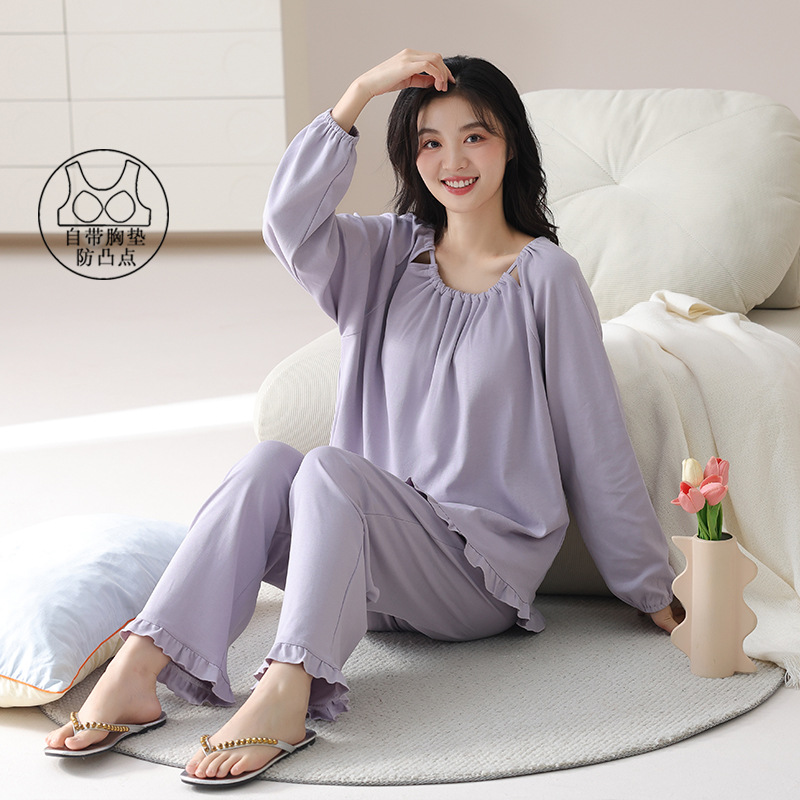 순면 잠옷 여자 가슴 패드 가을 단색 긴 소매 바지 요정 스타일 겉옷 느슨한 홈 의류 세트