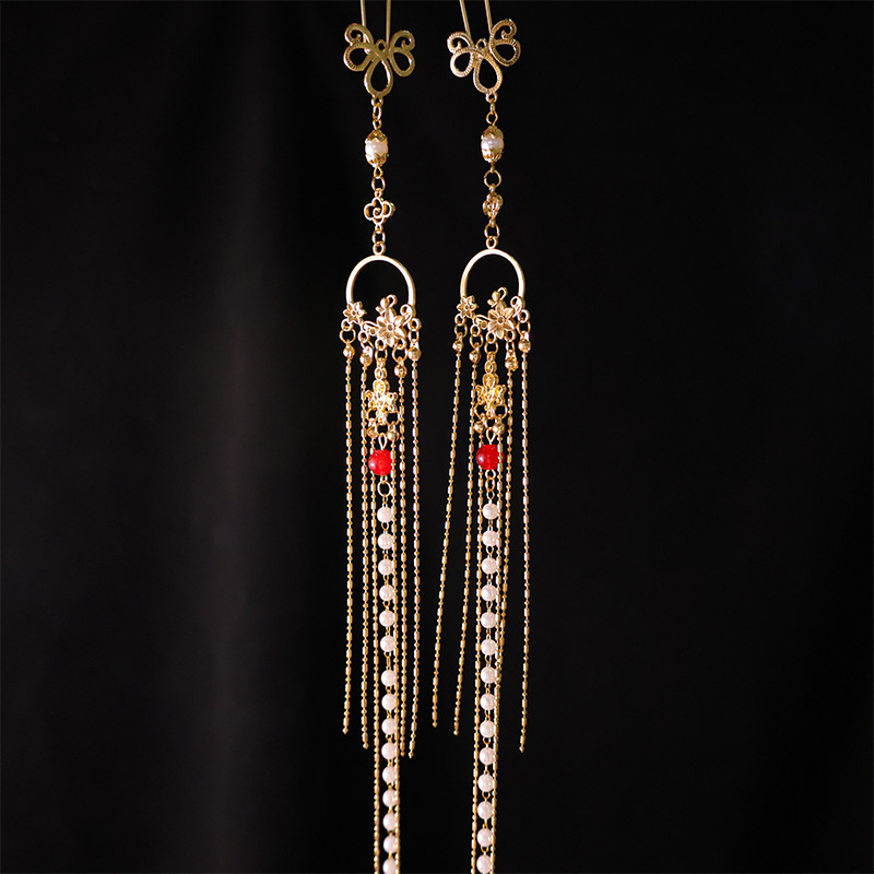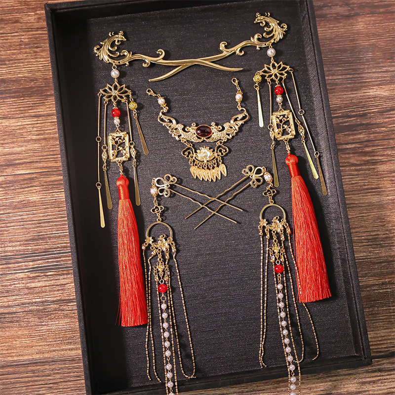 전국 로브 헤어 액세서리 전체 세트 레드 롱 술 단계별 헤어핀 헤드셋 U-헤어핀 웨딩 축제 한후 헤드웨어스토어 가기