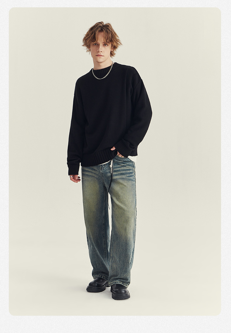 APO 남성복 | 가을과 겨울 크루 넥 스웨터 남성 패션 한국 스타일 접합 느슨한 풀오버 니트 셔츠 긴 소매스토어 가기