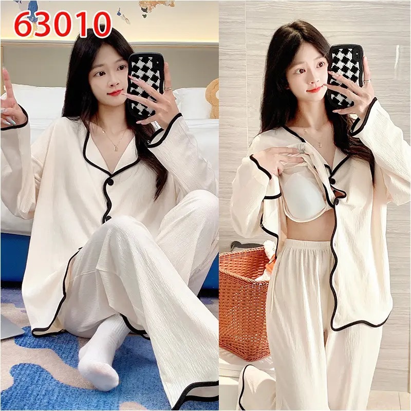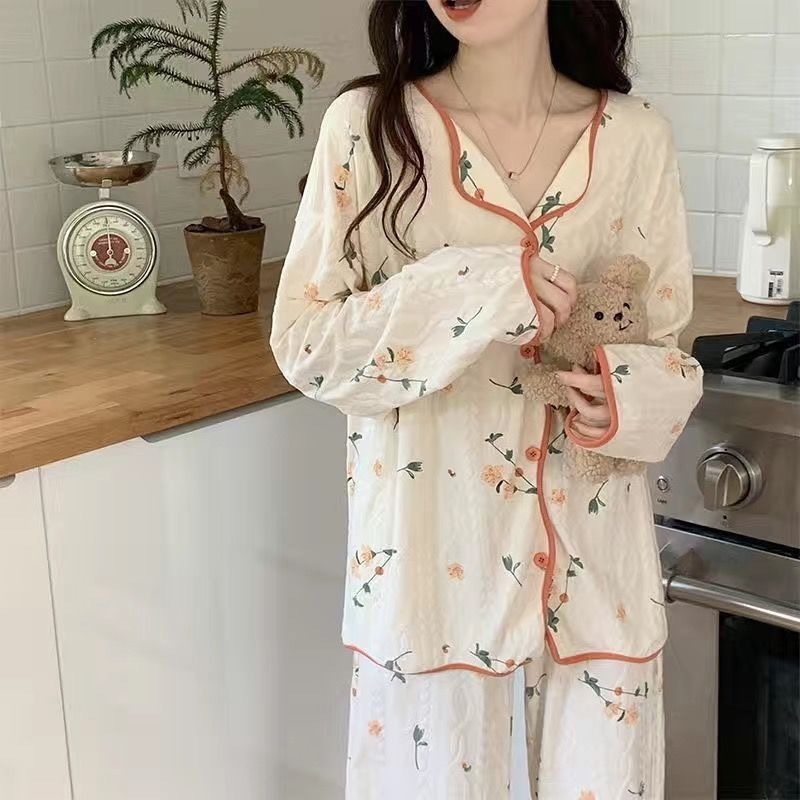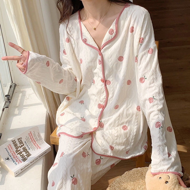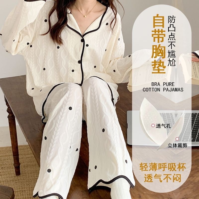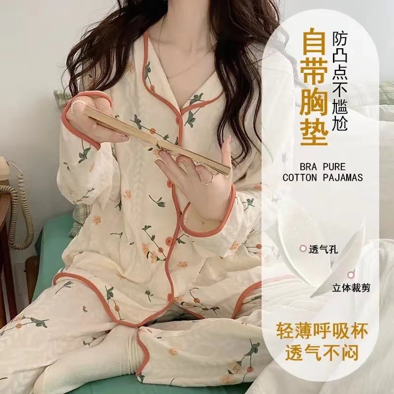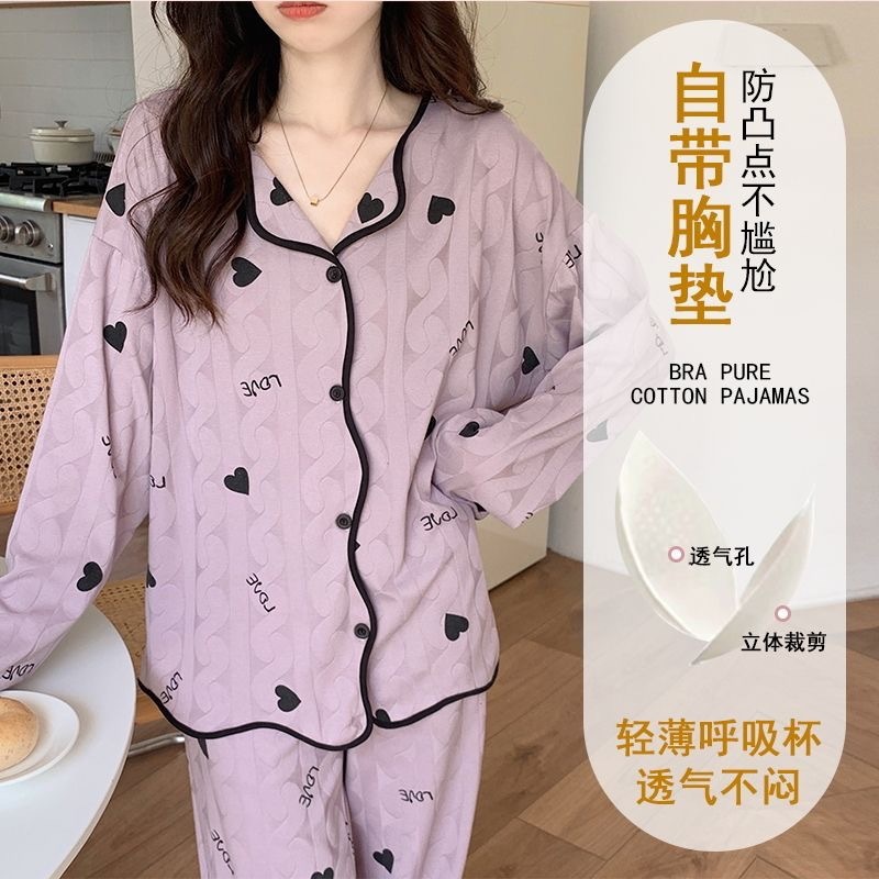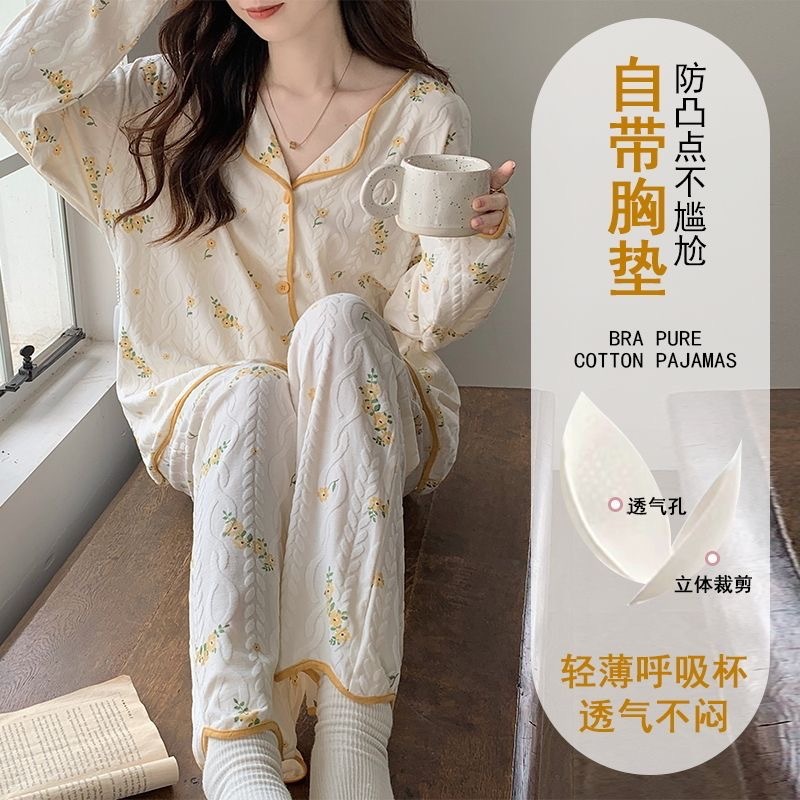 가슴 패드가 내장된 여성용 카디건 면 잠옷, 봄, 가을, 겨울 긴팔 인터넷 연예인 귀여운 인 스타일 홈웨어 세트스토어 가기