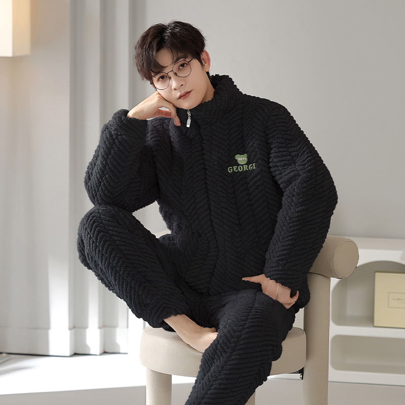 플란넬 파자마 여성의 겨울 3 층 라인드 벨벳 간단한 커플 세트 옷깃 따뜻한 남성 벨벳 홈 옷