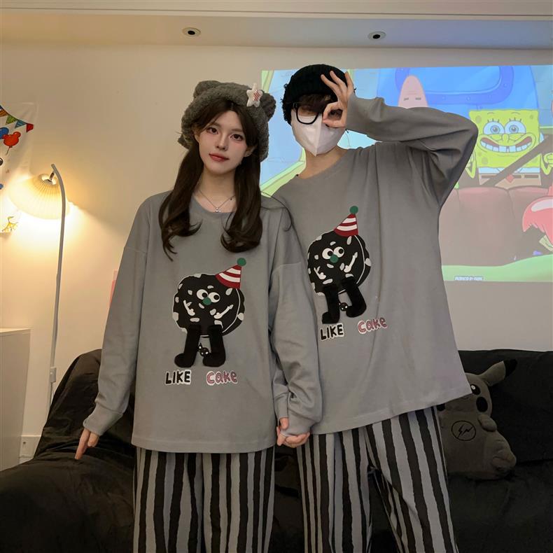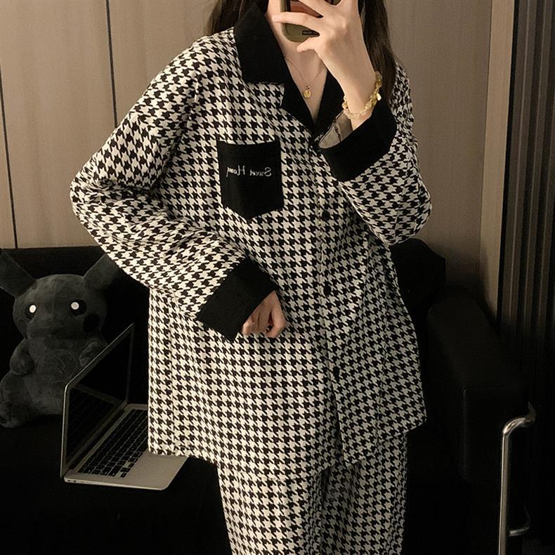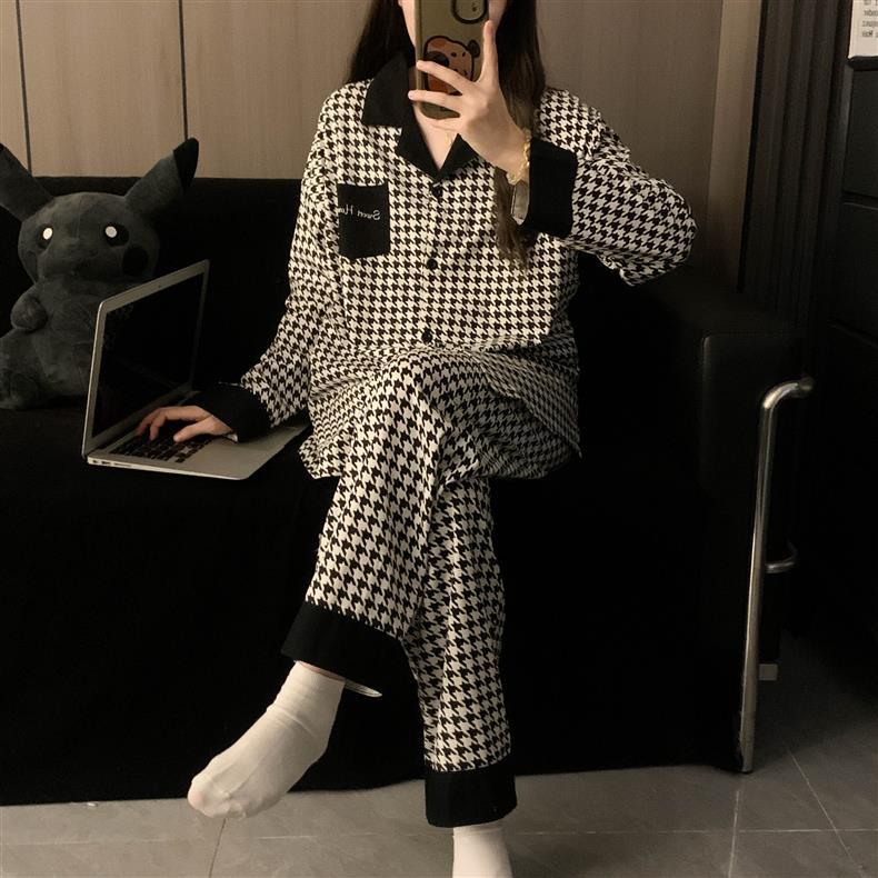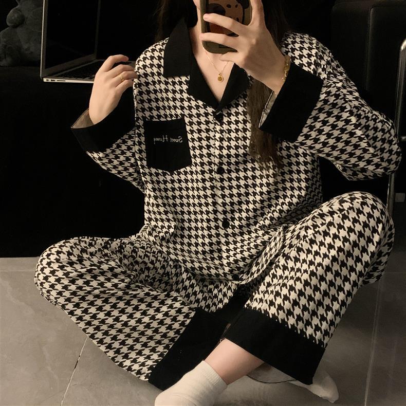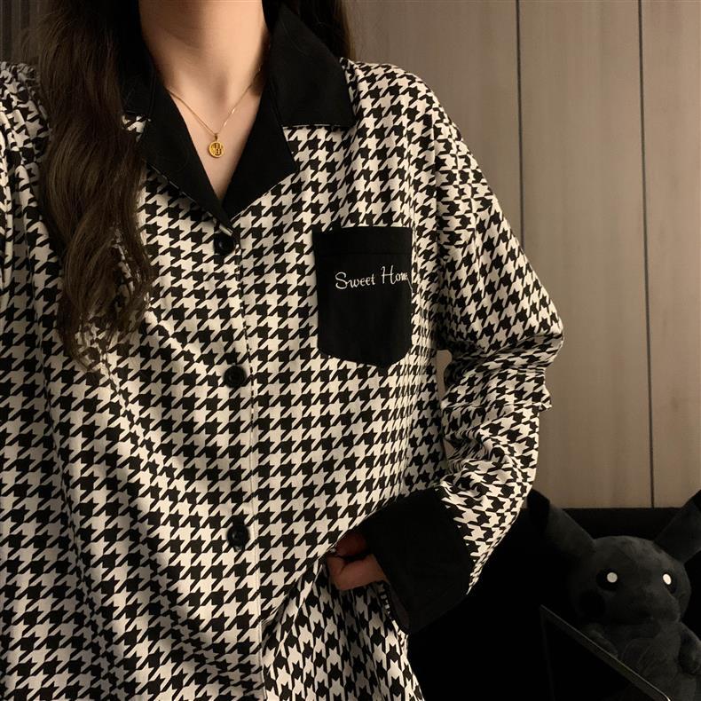 Houndstooth 스타일 Ins 레트로 스타일 커플 파자마 여성 봄과 가을 순수 면 긴 소매 투피스 인터넷 인기 남성 홈 의류스토어 가기