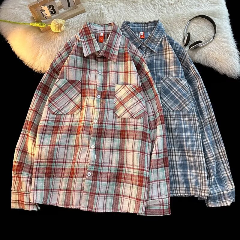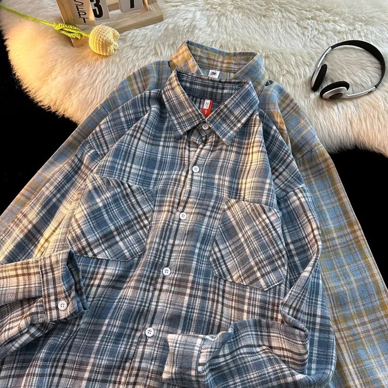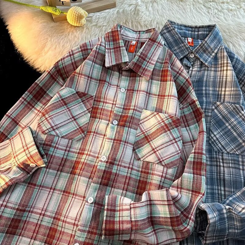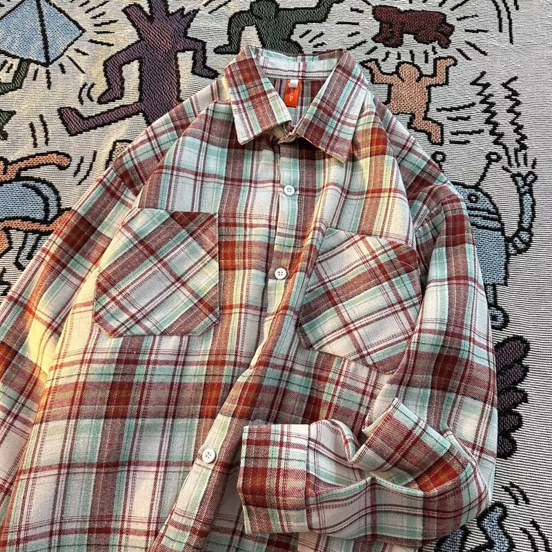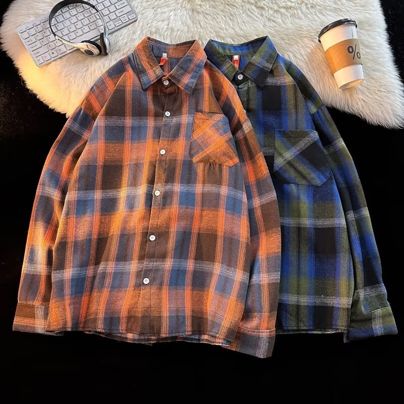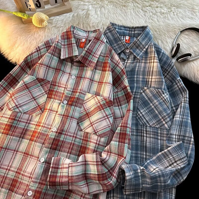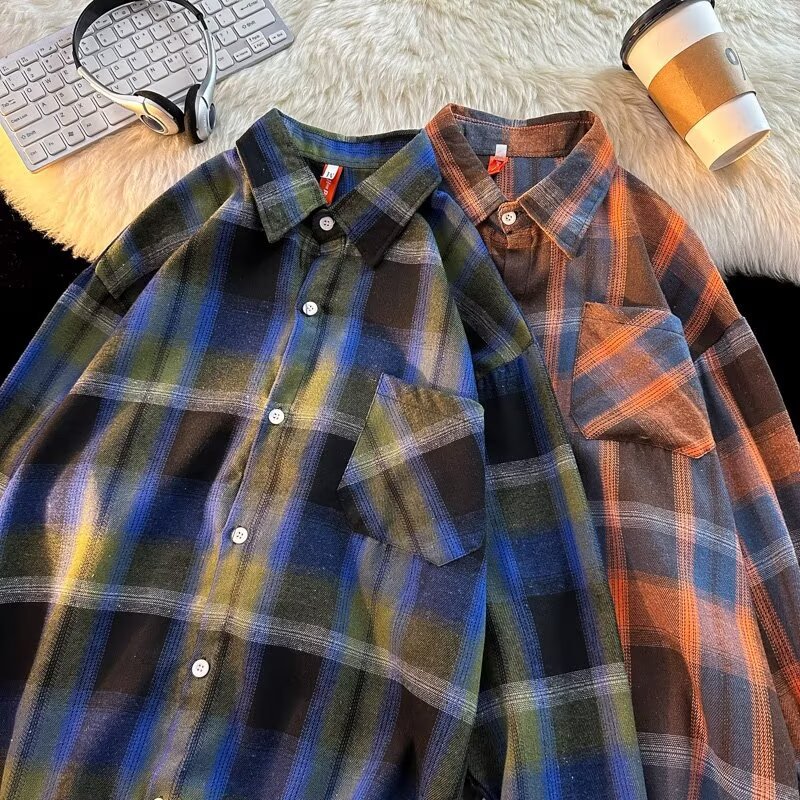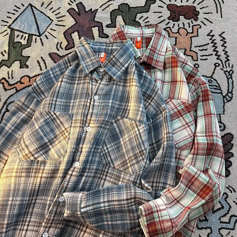 아메리칸 스타일 복고풍 격자 무늬 셔츠 남자의 가을 거리 스타일 느슨한 긴 소매 셔츠 유행과 잘 생긴 캐주얼 커플 재킷