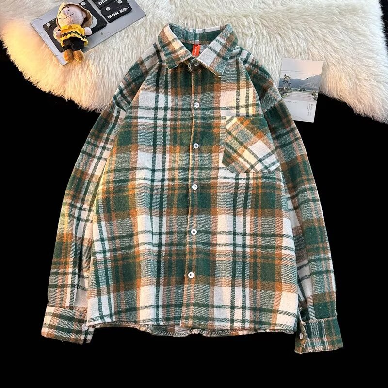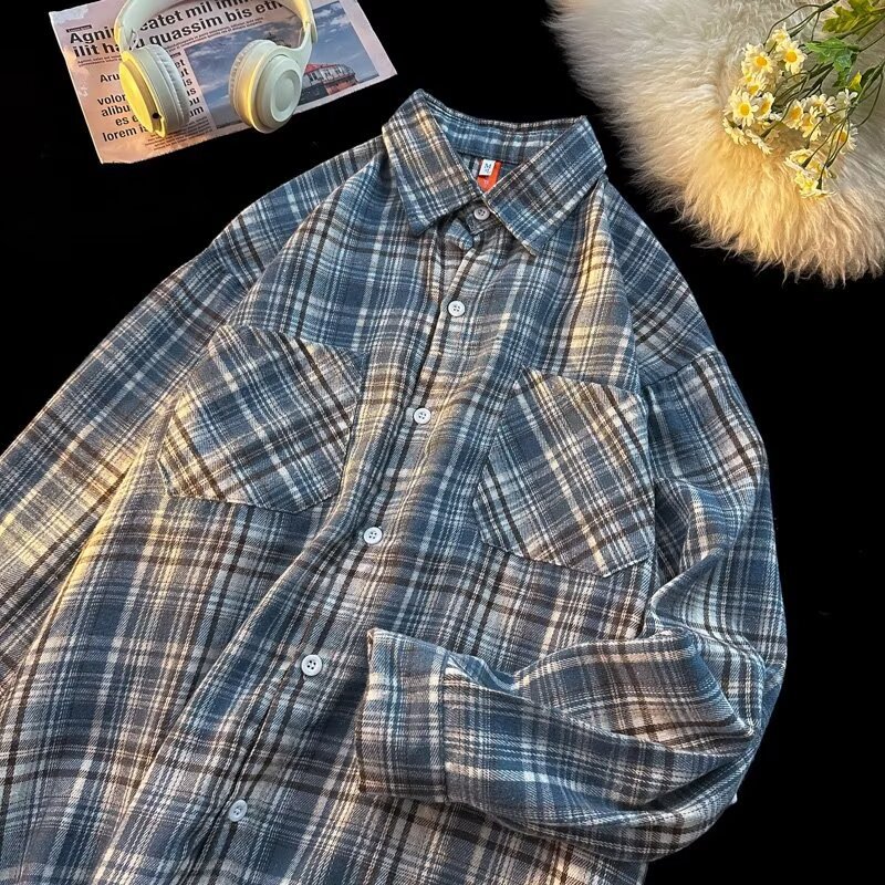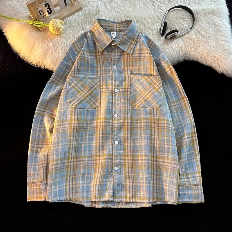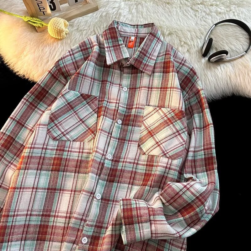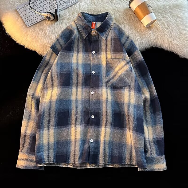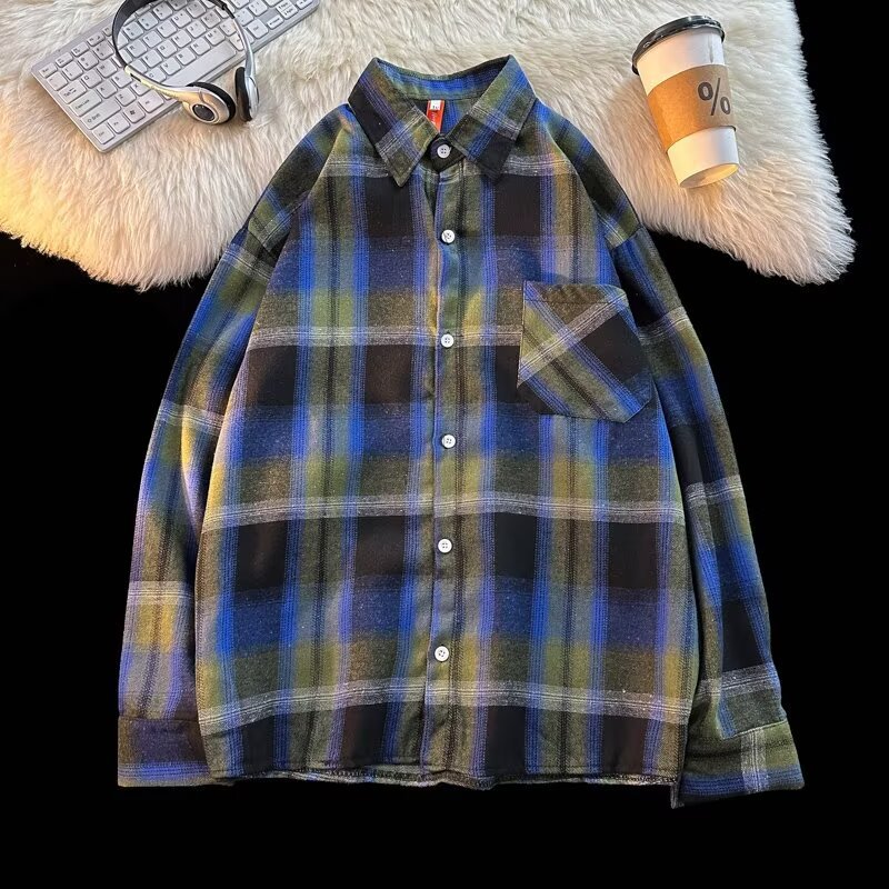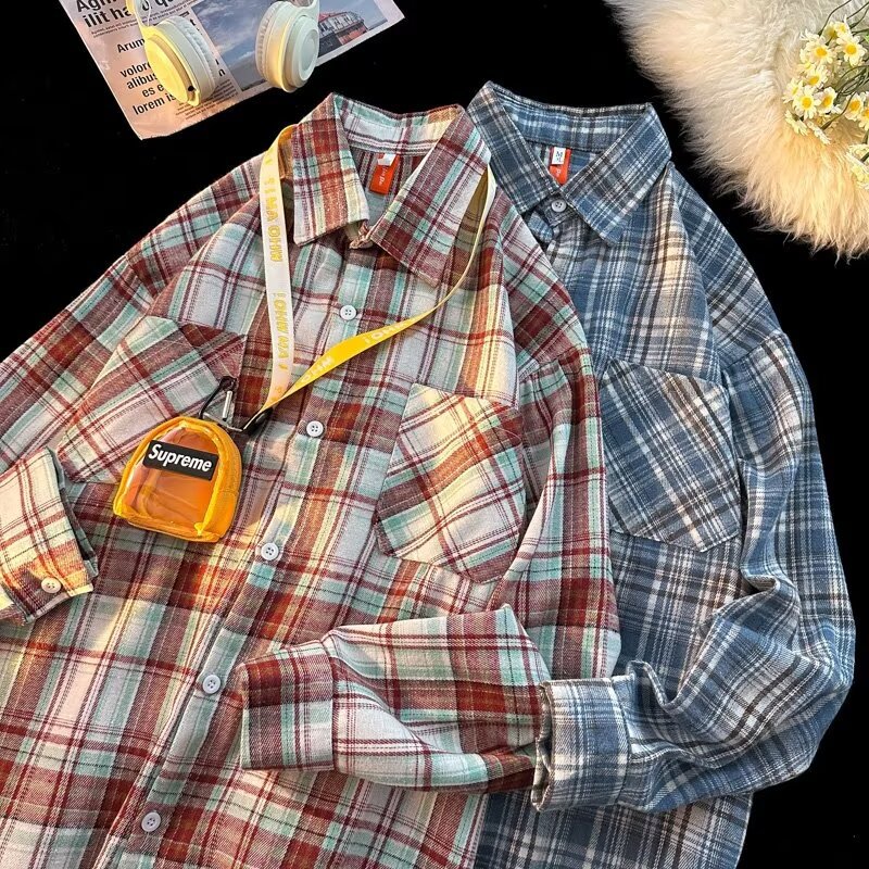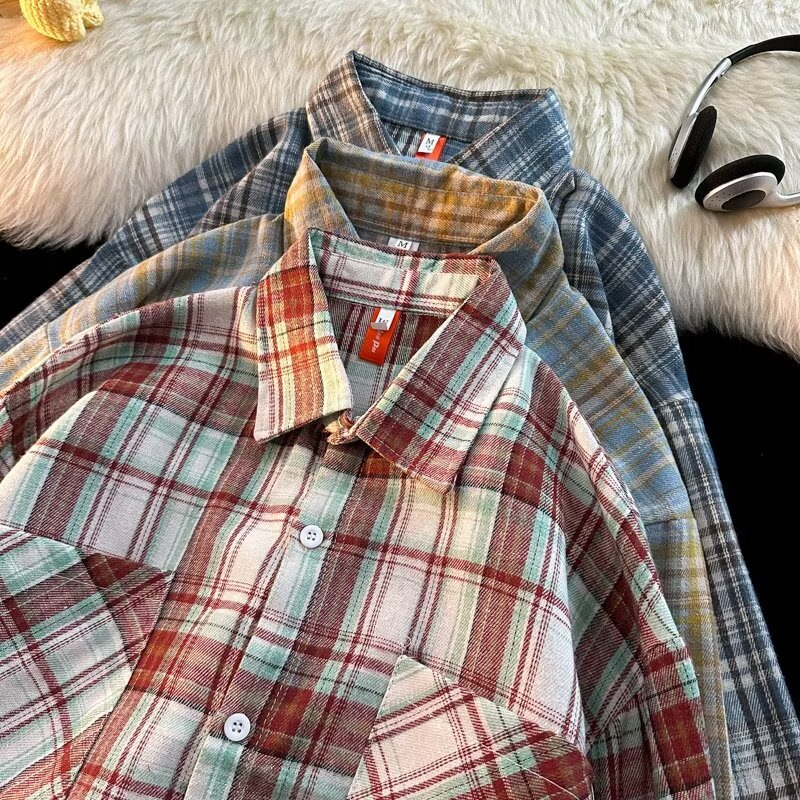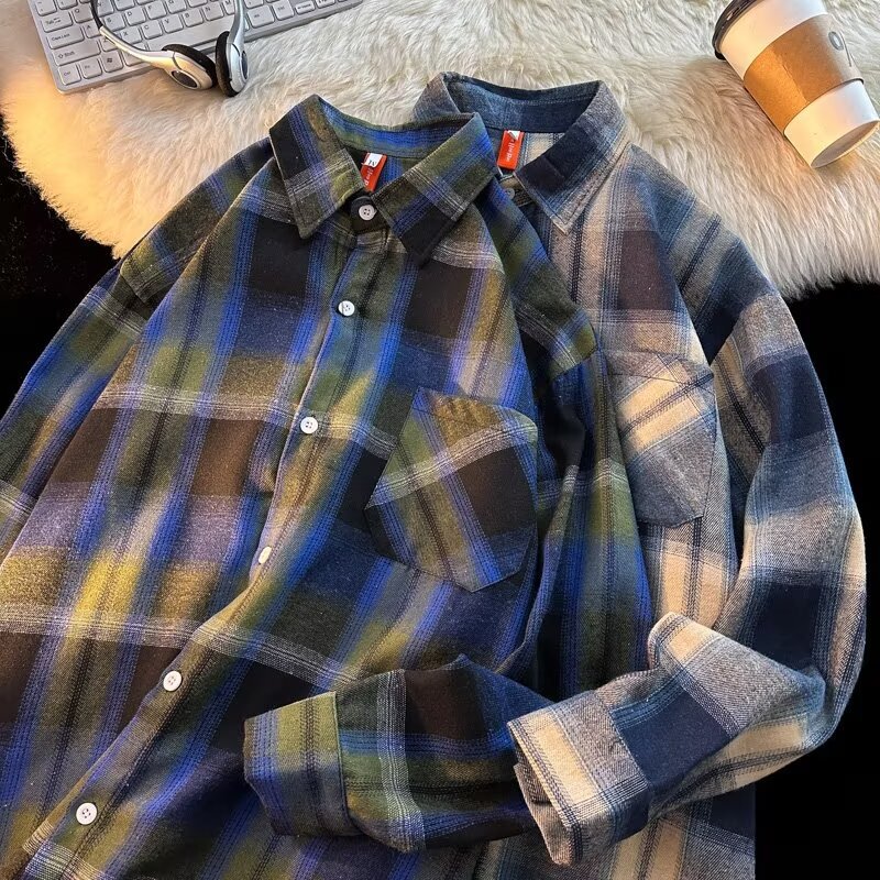 아메리칸 스타일 복고풍 격자 무늬 셔츠 남자의 가을 거리 스타일 느슨한 긴 소매 셔츠 유행과 잘 생긴 캐주얼 커플 재킷