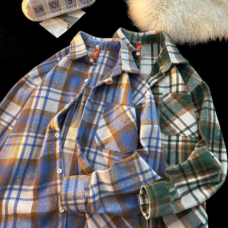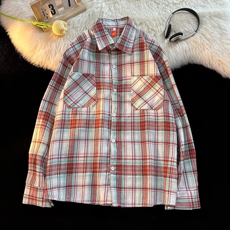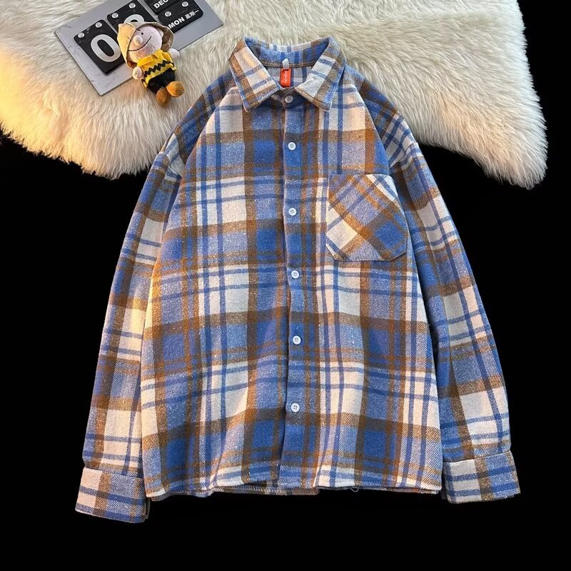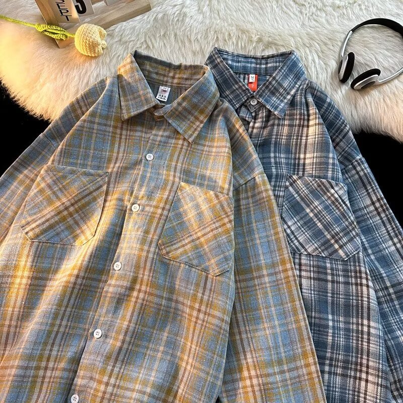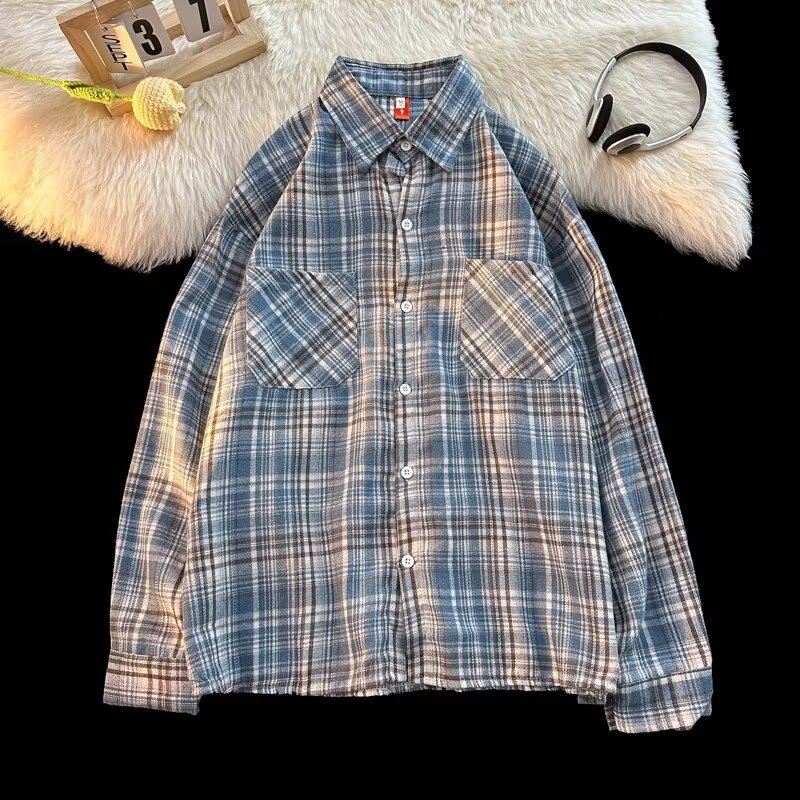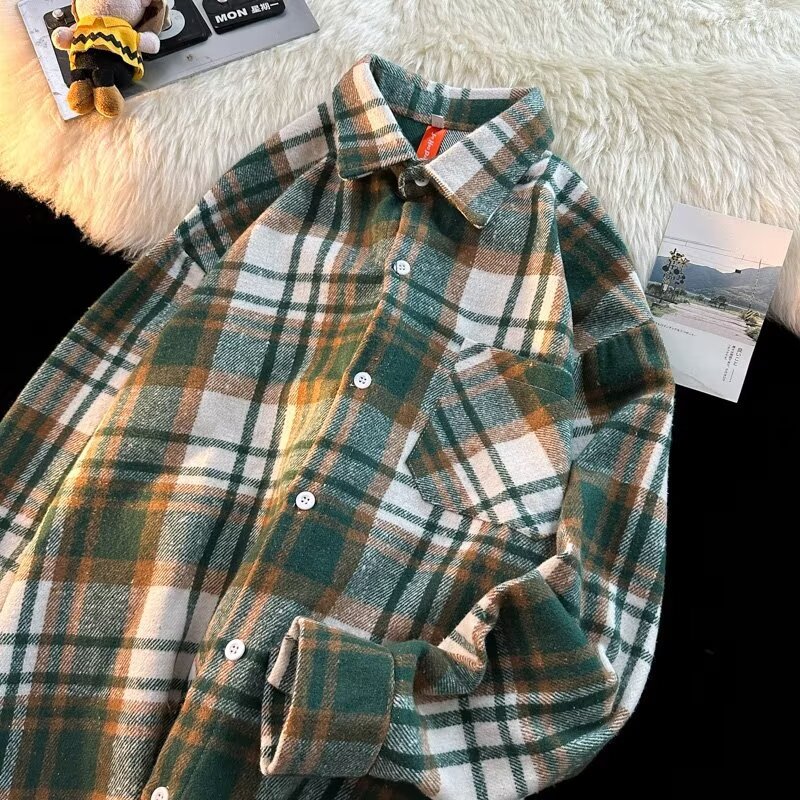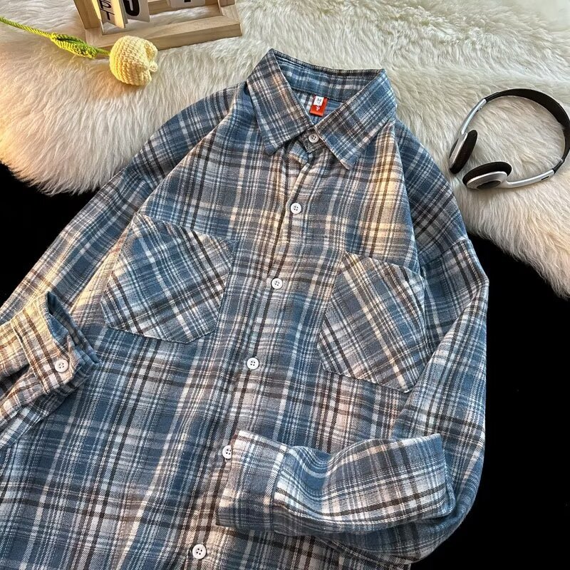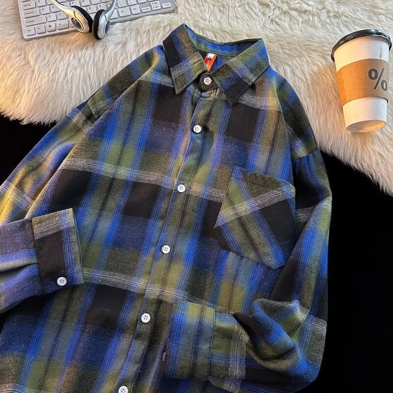 아메리칸 스타일 복고풍 격자 무늬 셔츠 남자의 가을 거리 스타일 느슨한 긴 소매 셔츠 유행과 잘 생긴 캐주얼 커플 재킷
