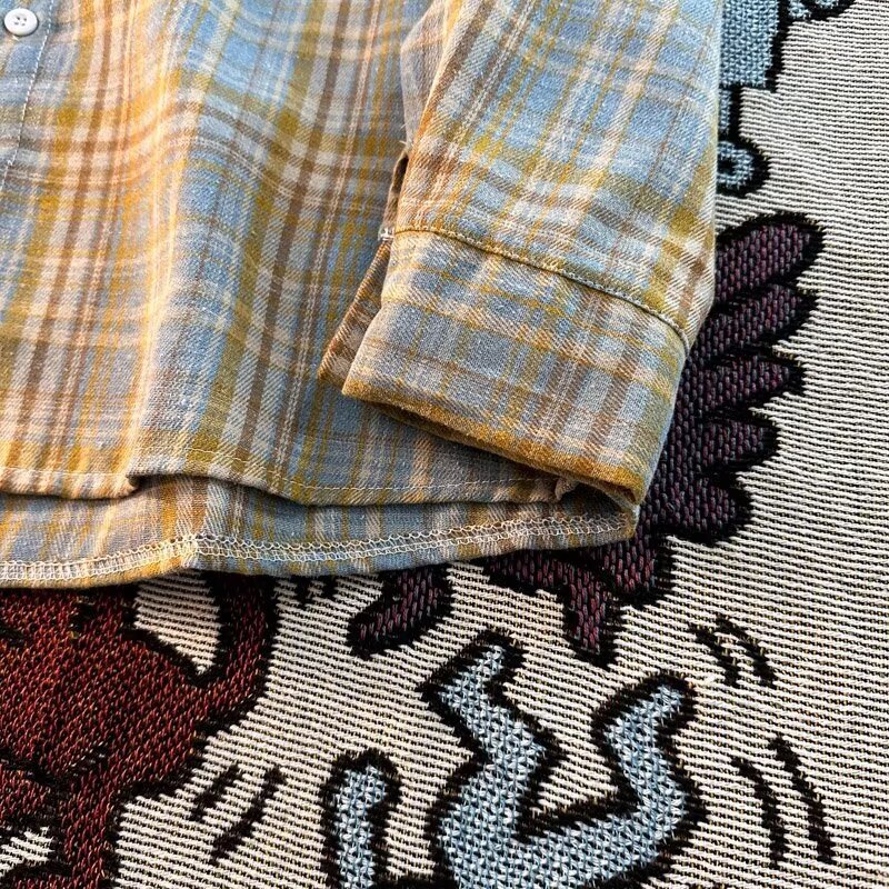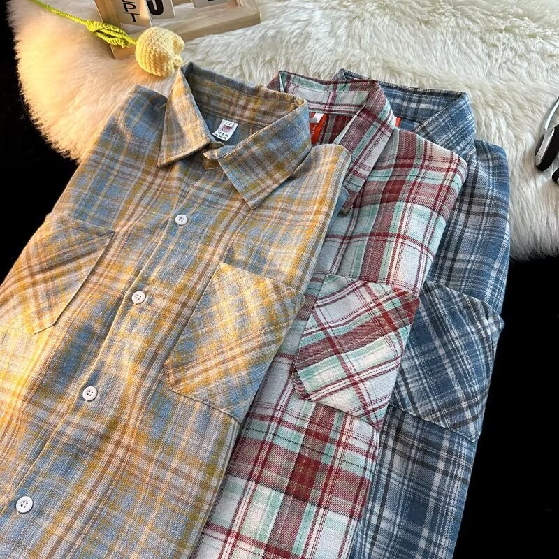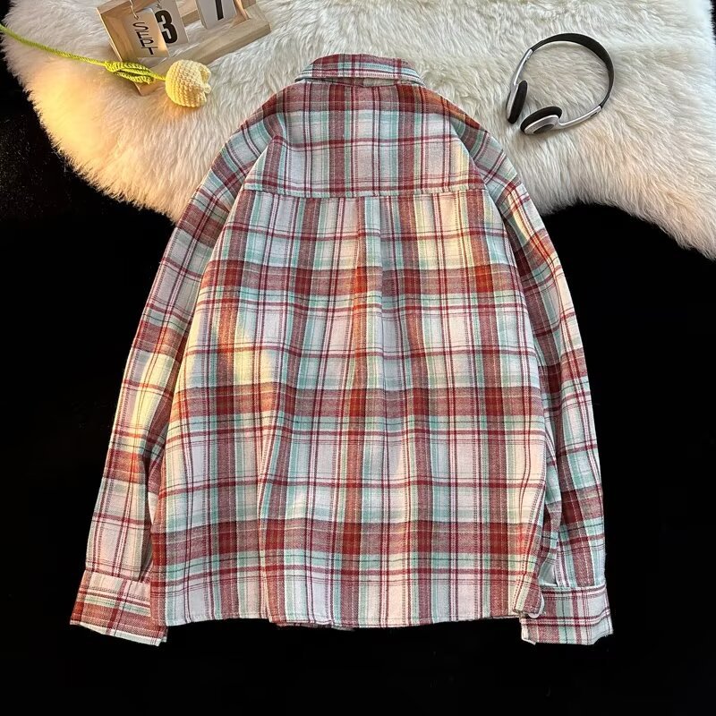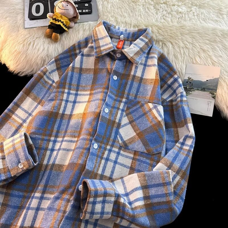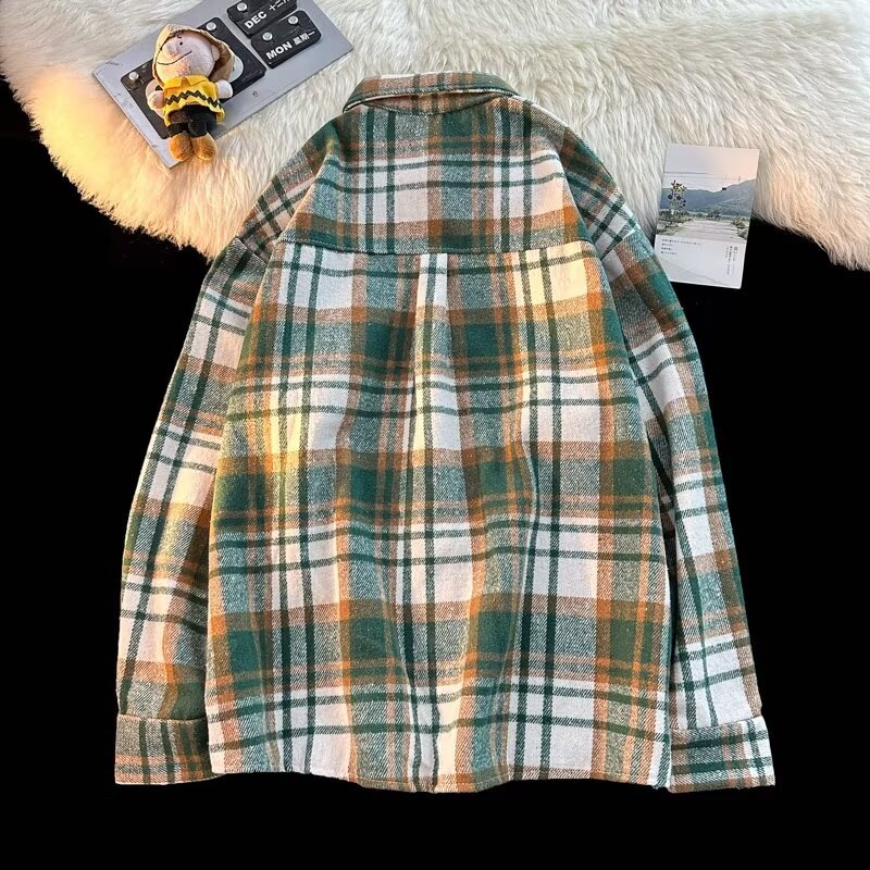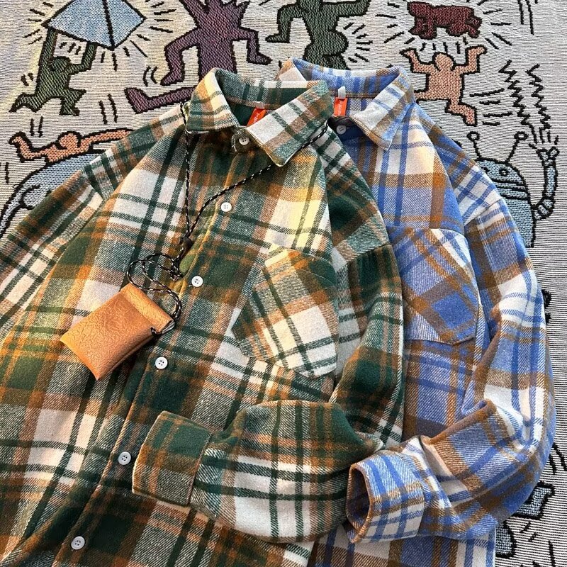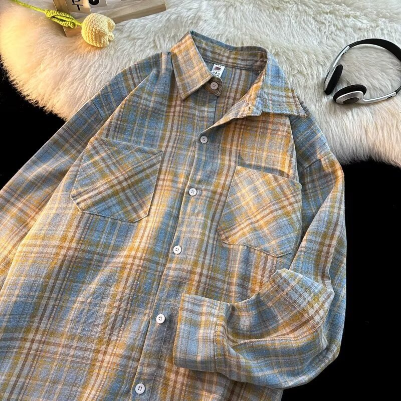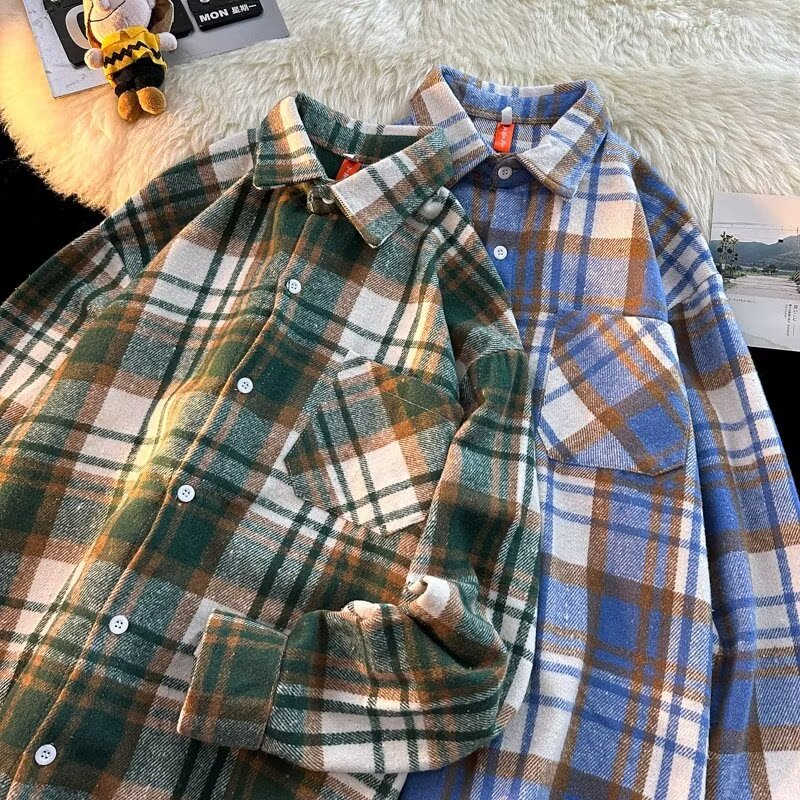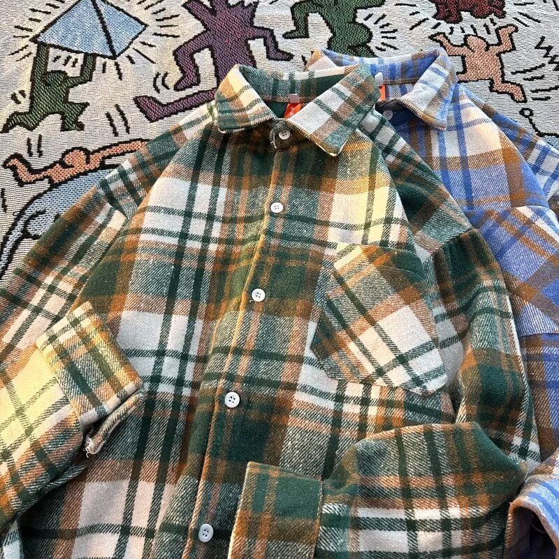 아메리칸 스타일 복고풍 격자 무늬 셔츠 남자의 가을 거리 스타일 느슨한 긴 소매 셔츠 유행과 잘 생긴 캐주얼 커플 재킷