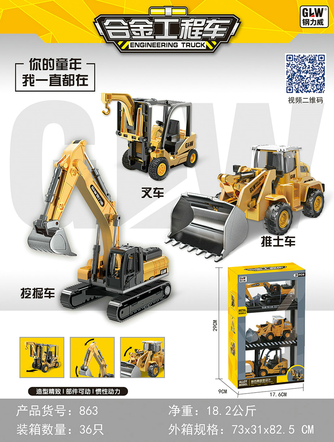 3 로딩 합금 엔지니어링 트럭 굴삭기 863 소년 굴삭기 불도징 지게차 모델 실속 어린이 장난감 도매스토어 가기