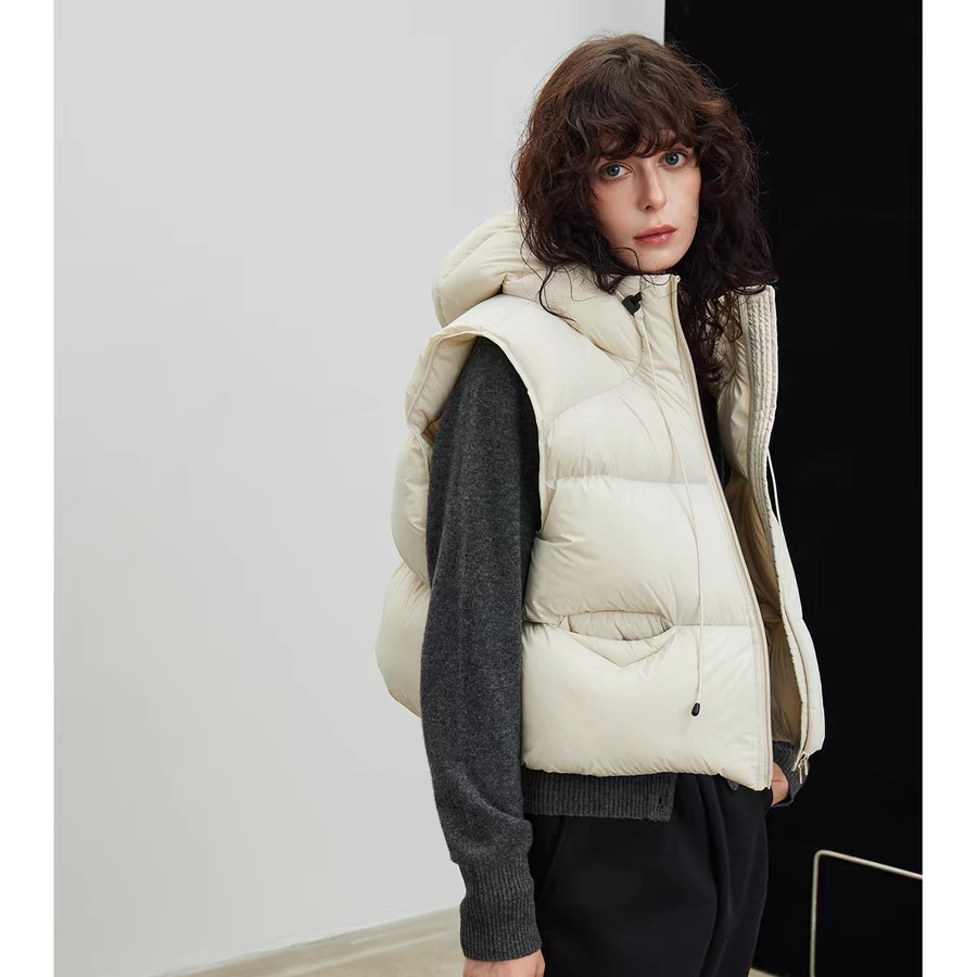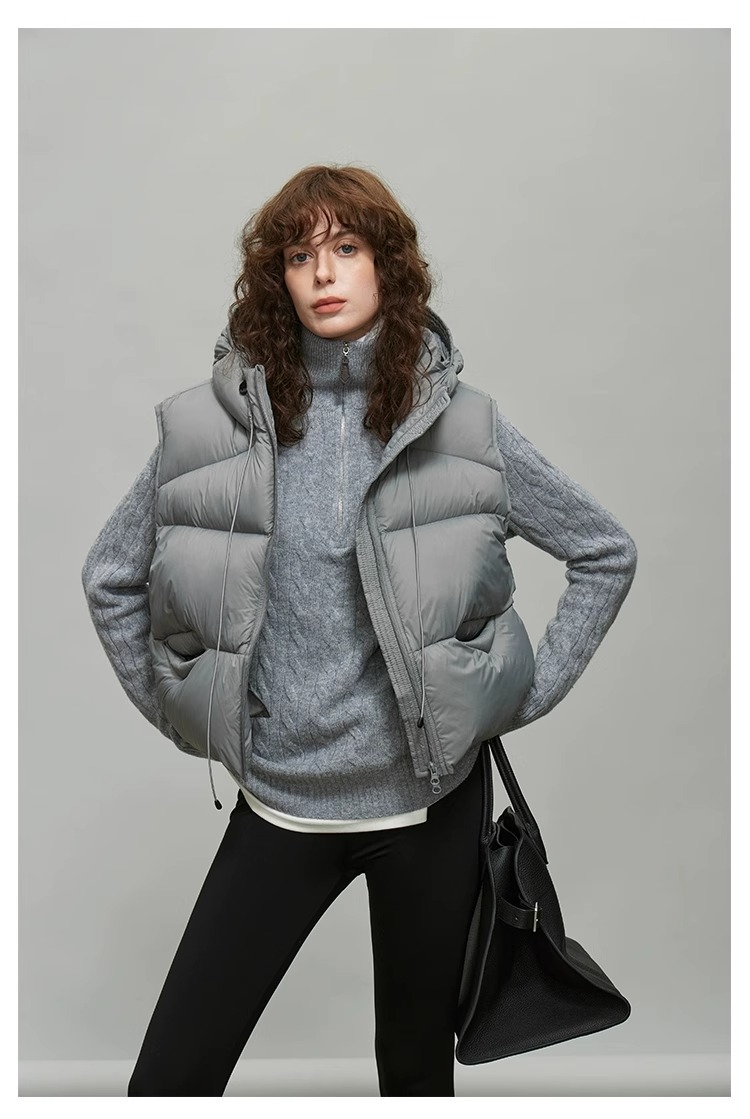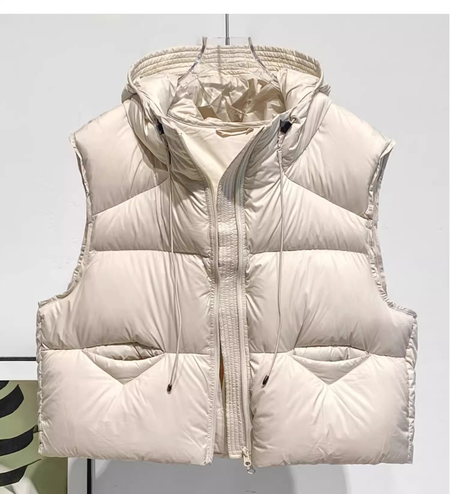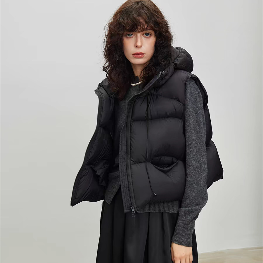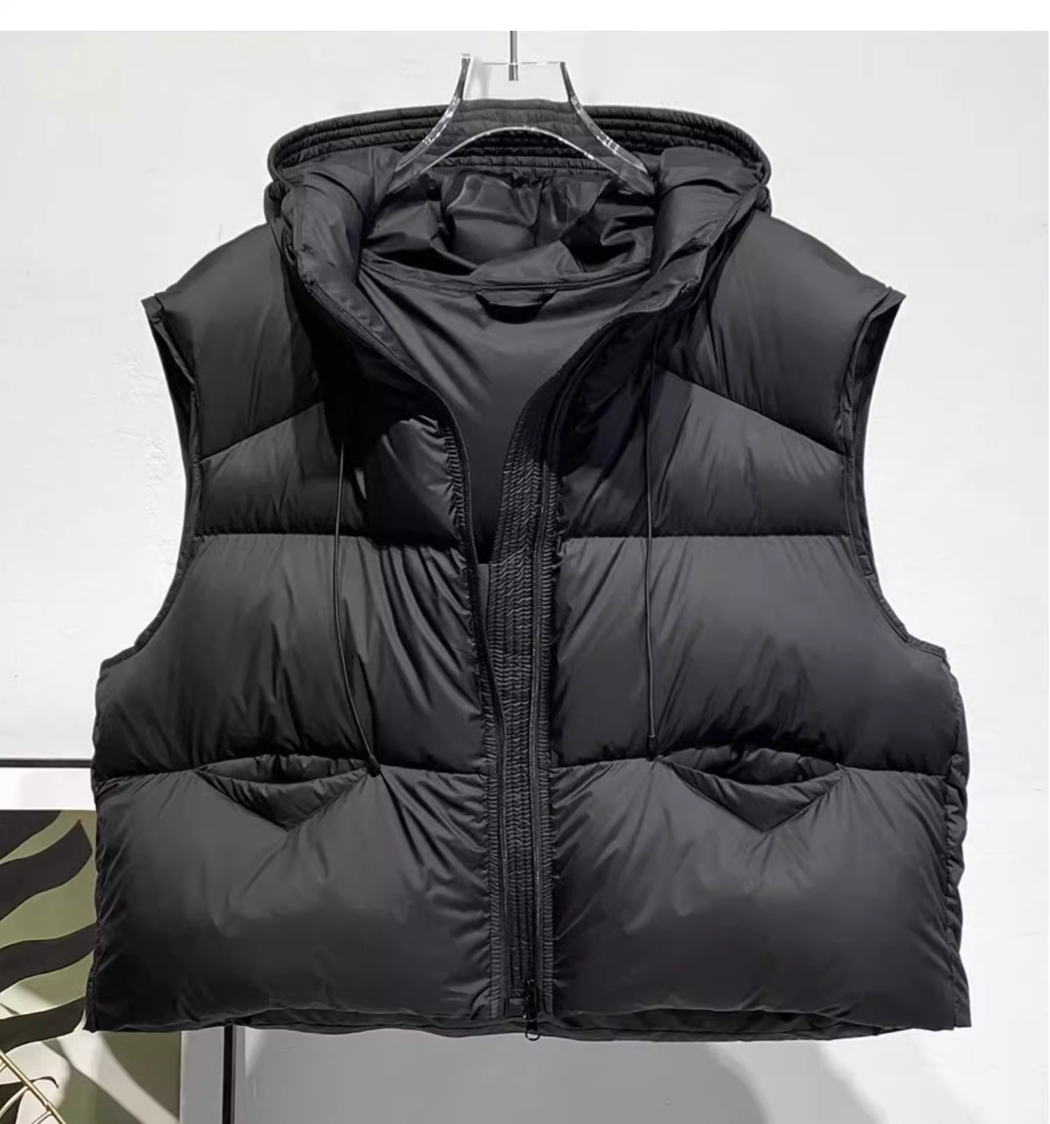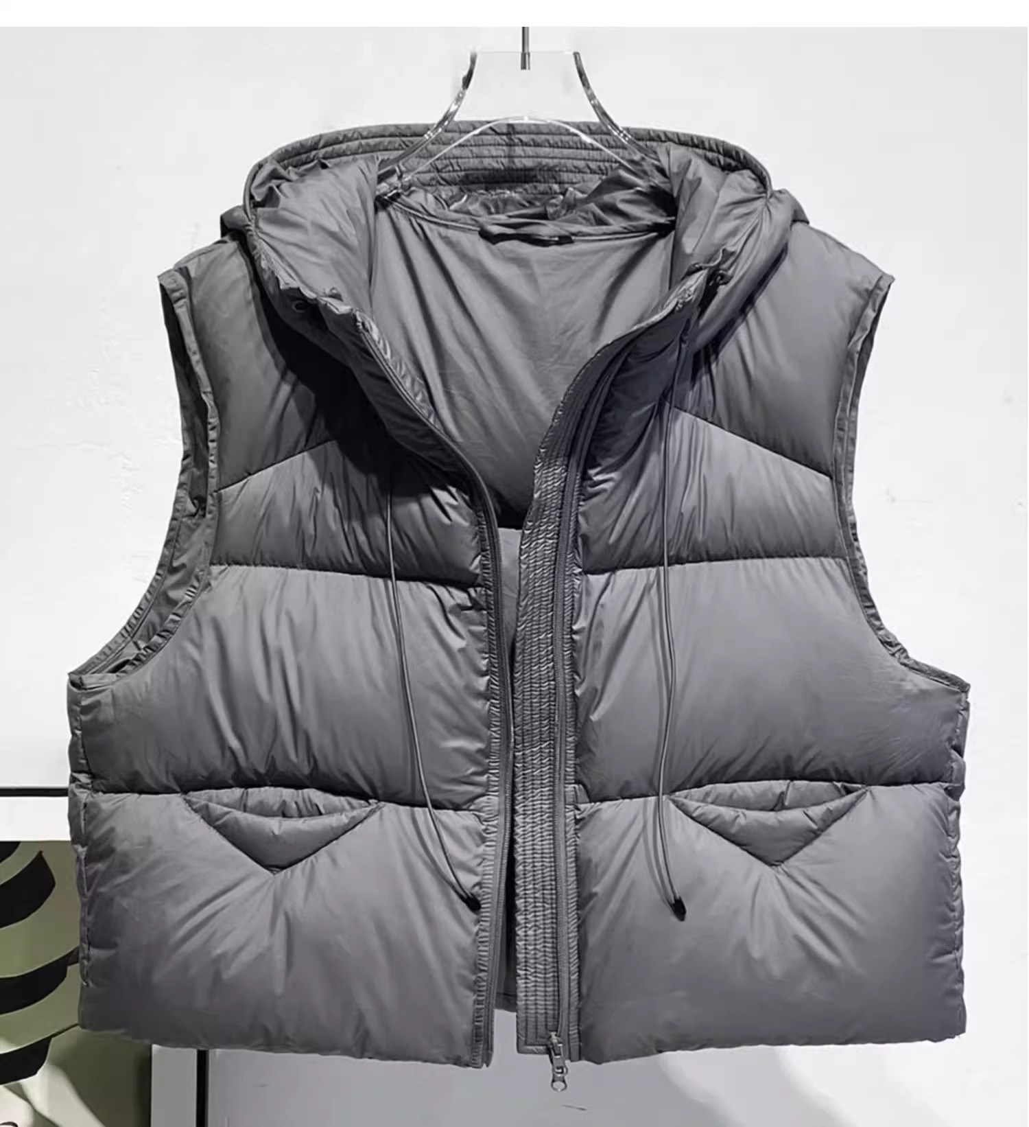 여성용 거위털 다운 조끼 2025 가을 겨울 패션 고급스러운 퍼프 느낌 후드 조끼 외투 두꺼운 조끼 트렌디스토어 가기