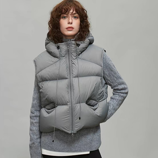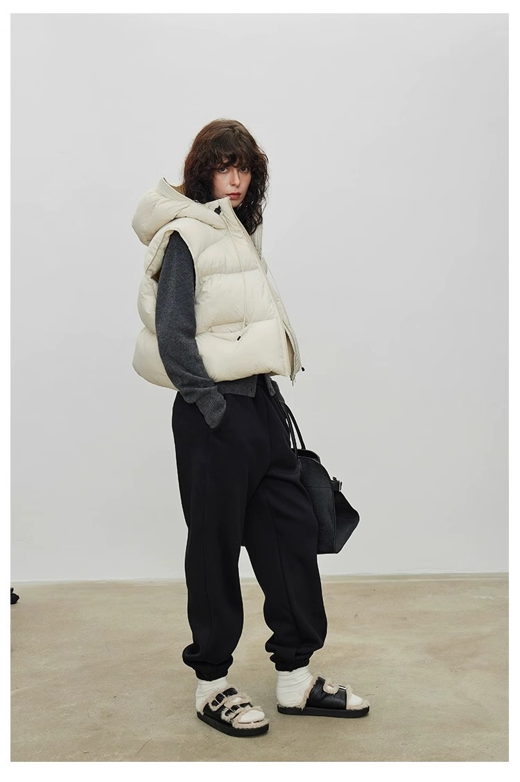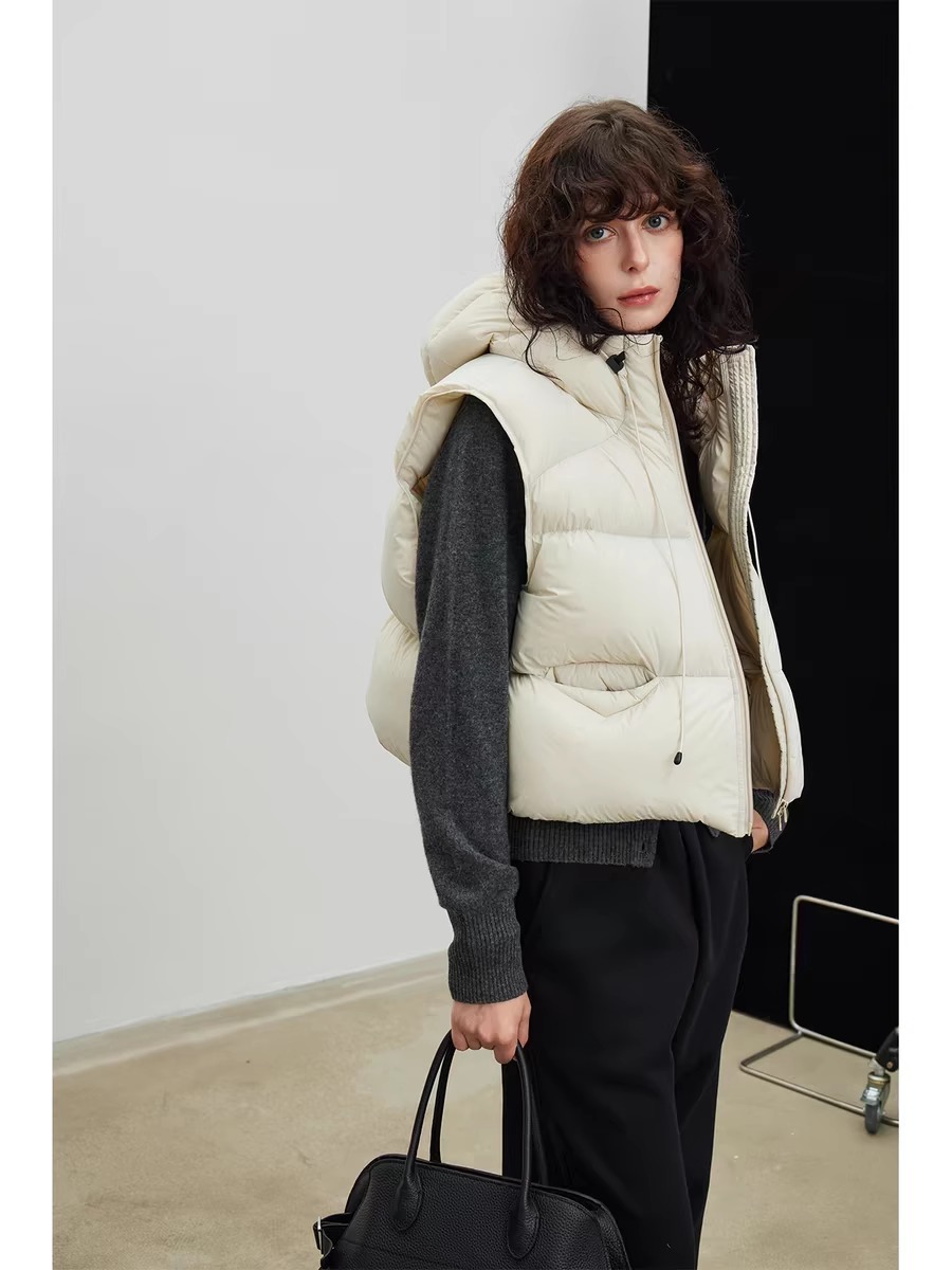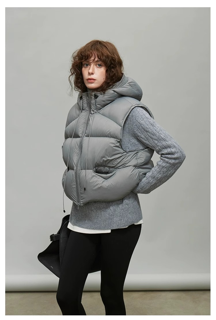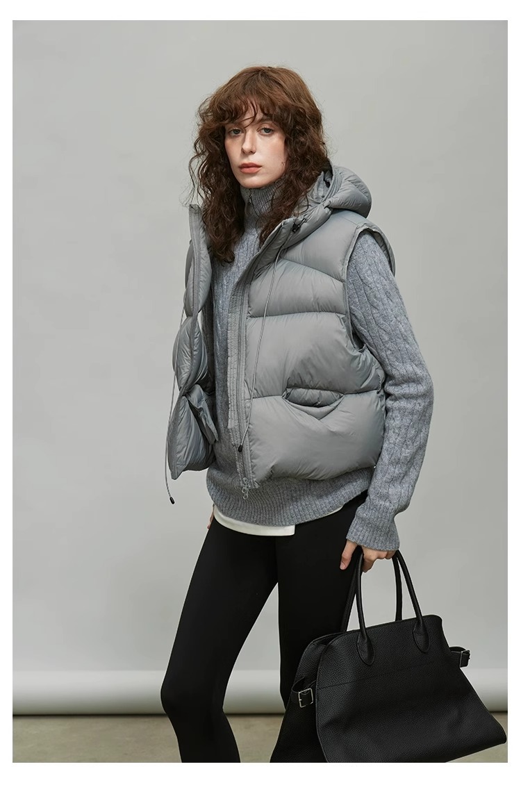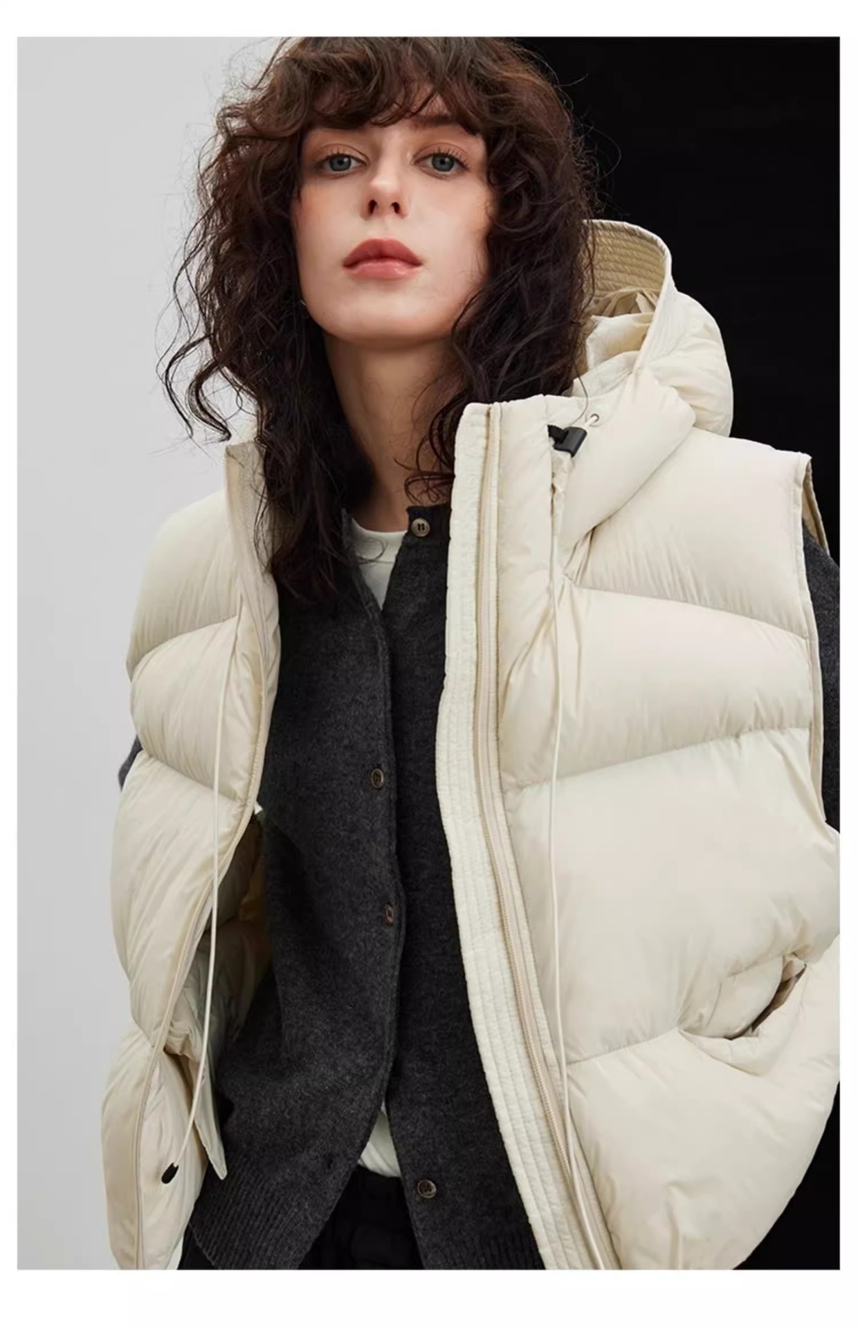 여성용 거위털 다운 조끼 2025 가을 겨울 패션 고급스러운 퍼프 느낌 후드 조끼 외투 두꺼운 조끼 트렌디
