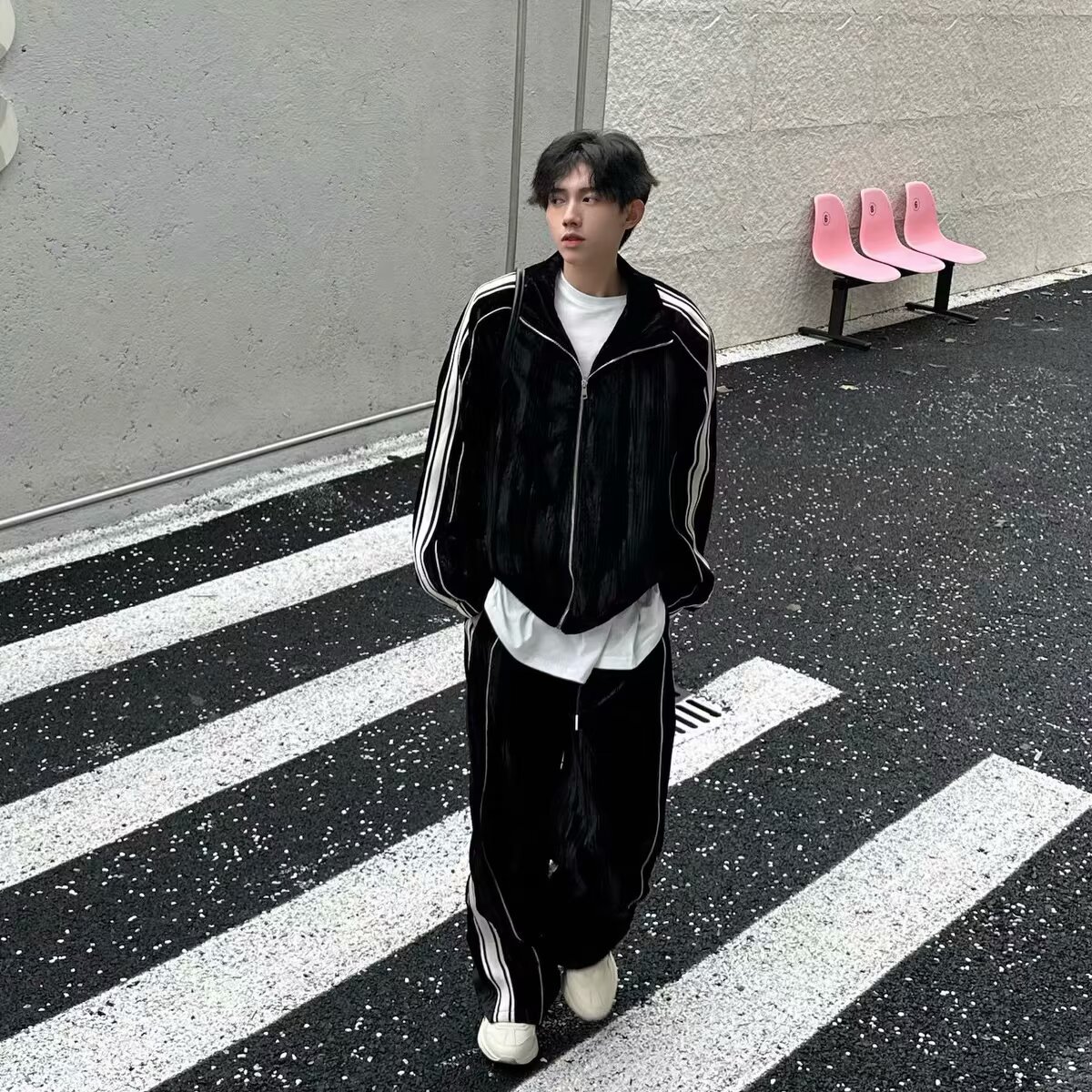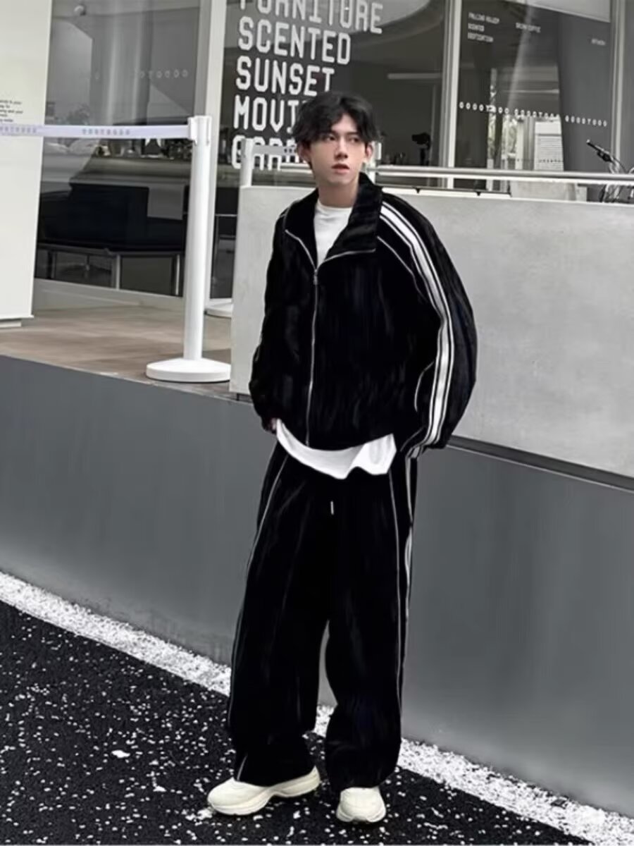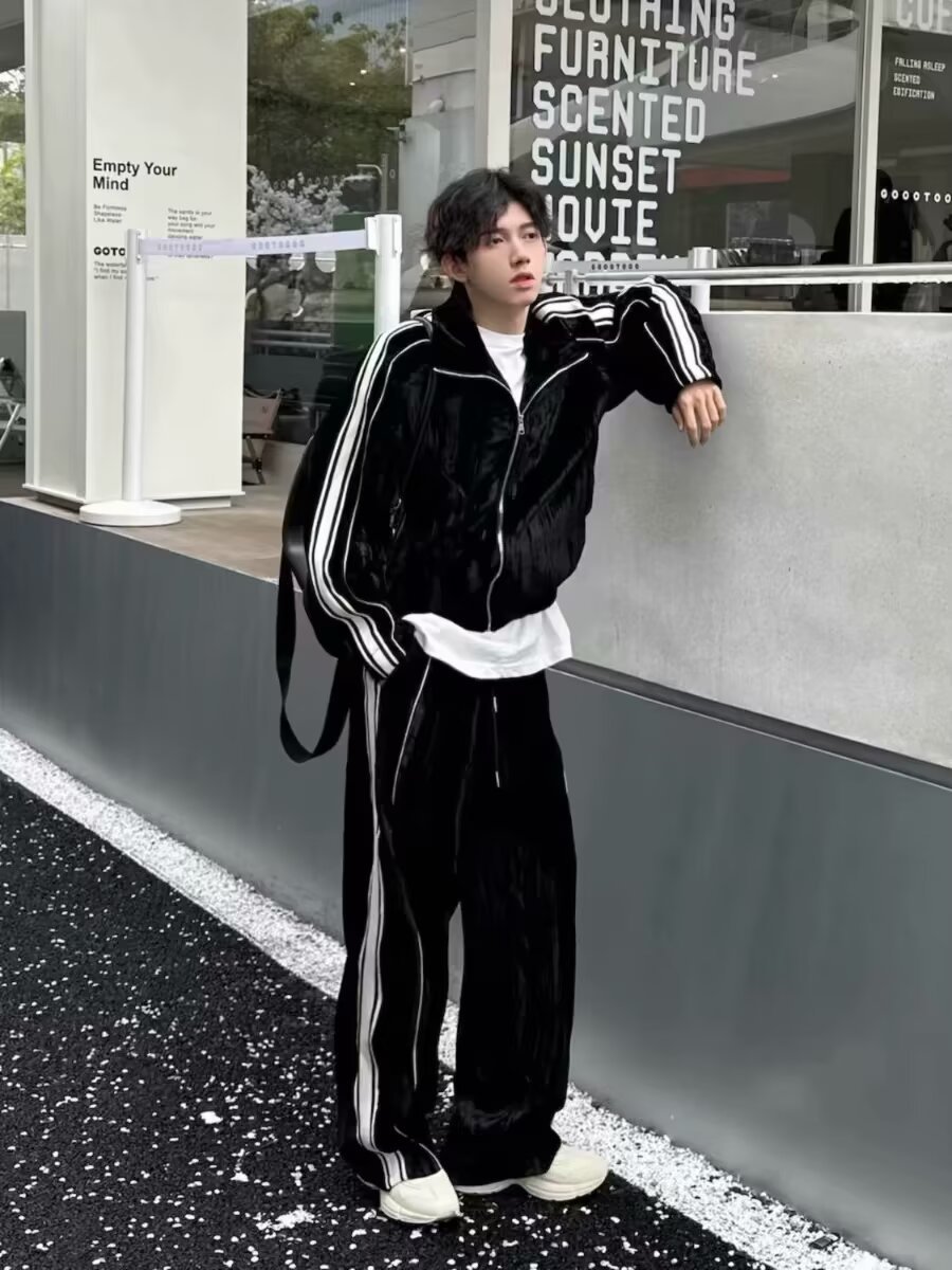 스트라이프 의류 세트 봄과 가을 2024 새로운 패션 느슨한 컬러 매칭 야외 커플 레저 스포츠 투피스 세트스토어 가기