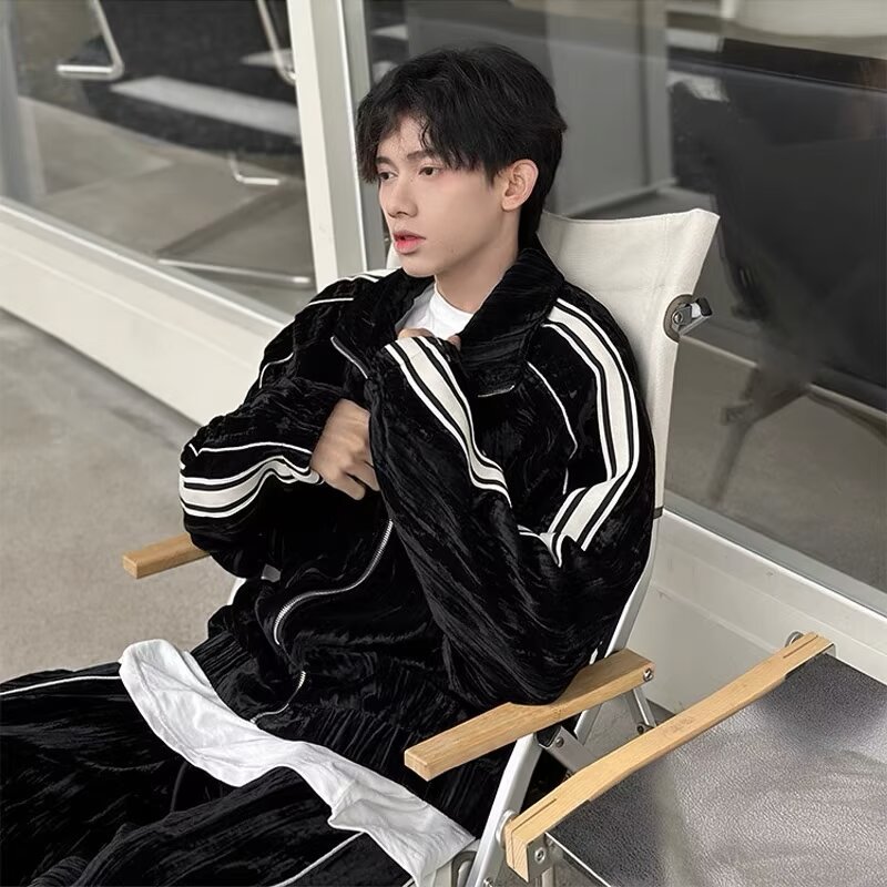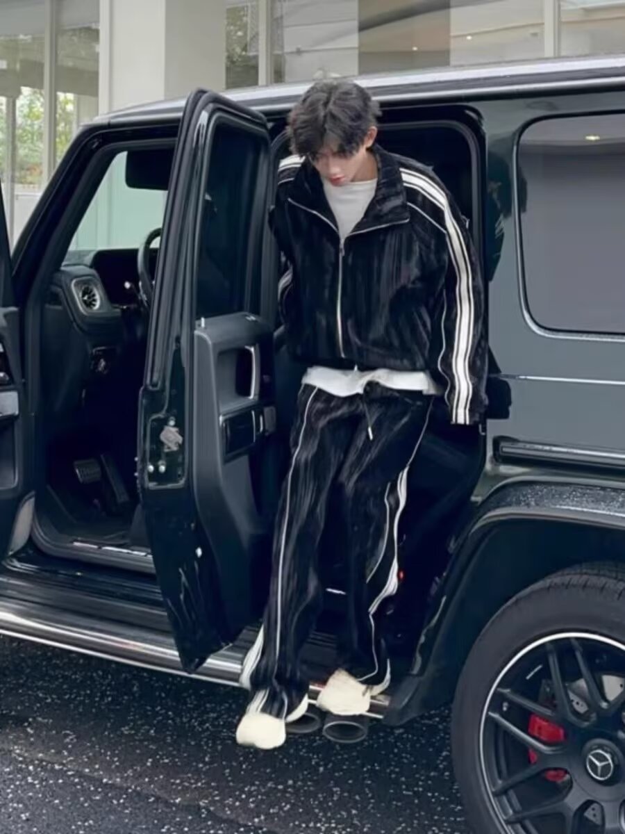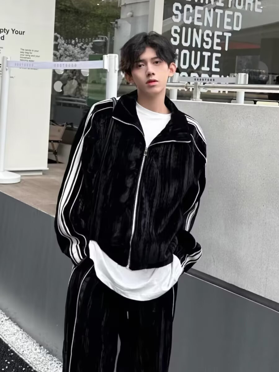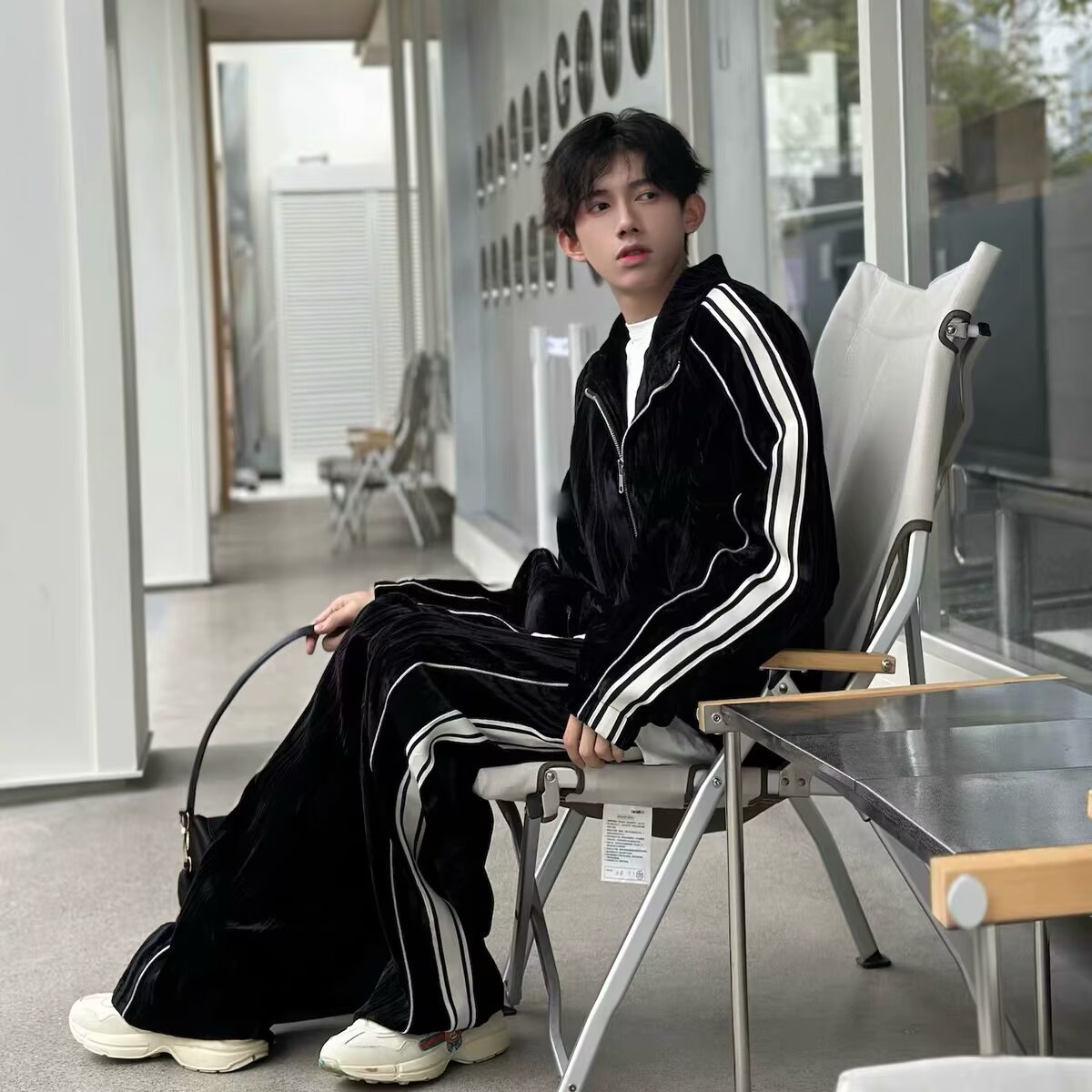 스트라이프 의류 세트 봄과 가을 2024 새로운 패션 느슨한 컬러 매칭 야외 커플 레저 스포츠 투피스 세트스토어 가기