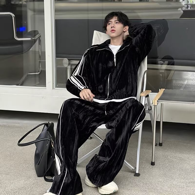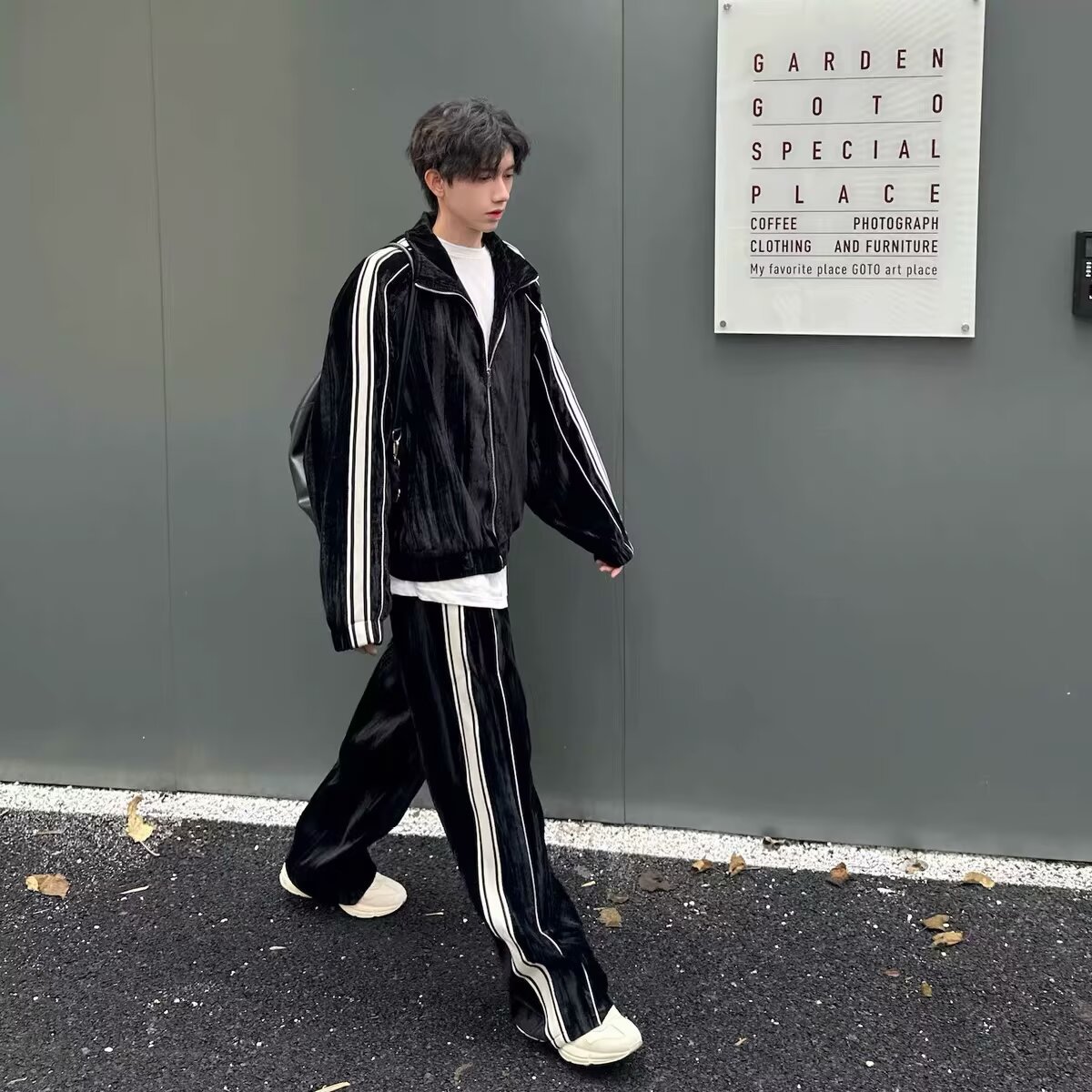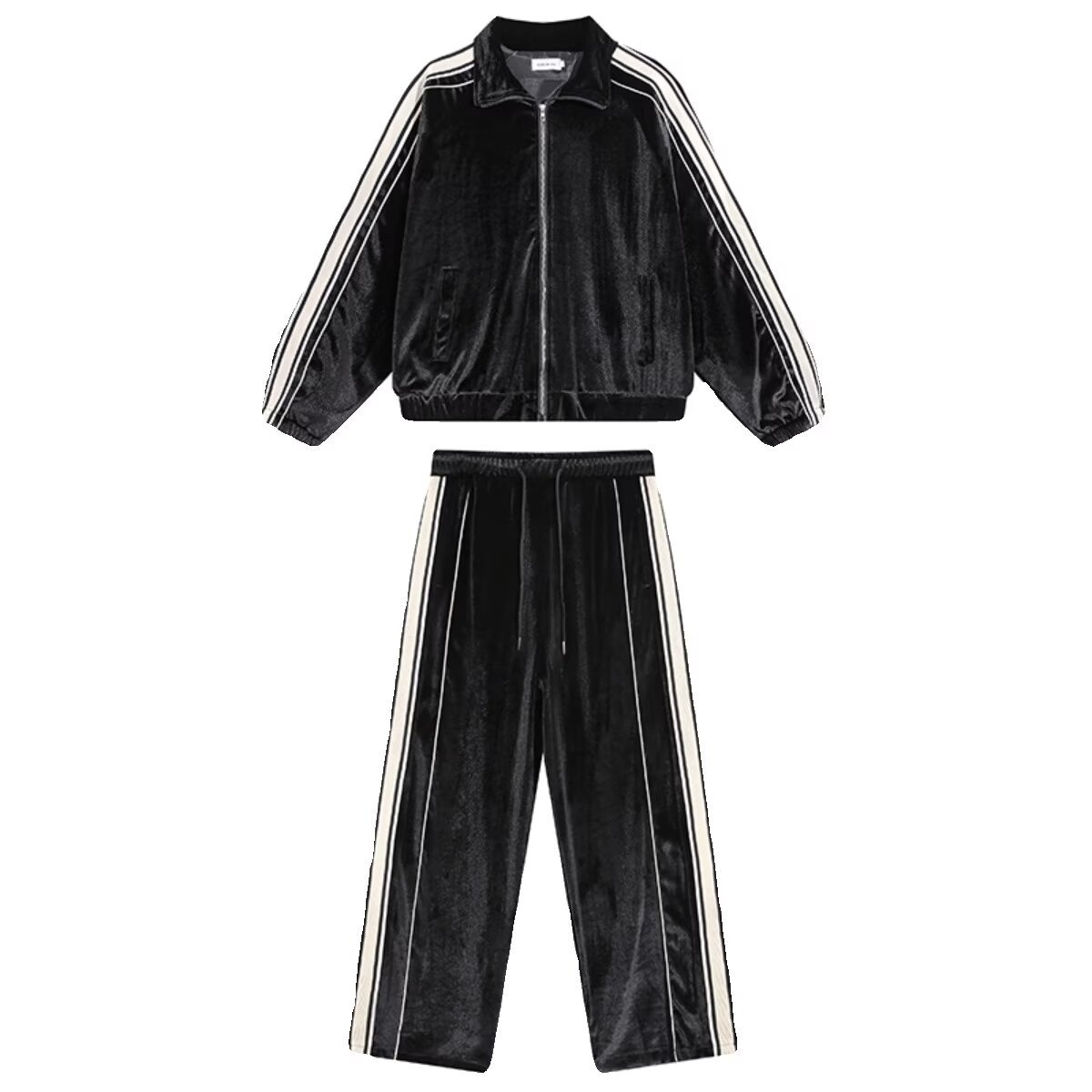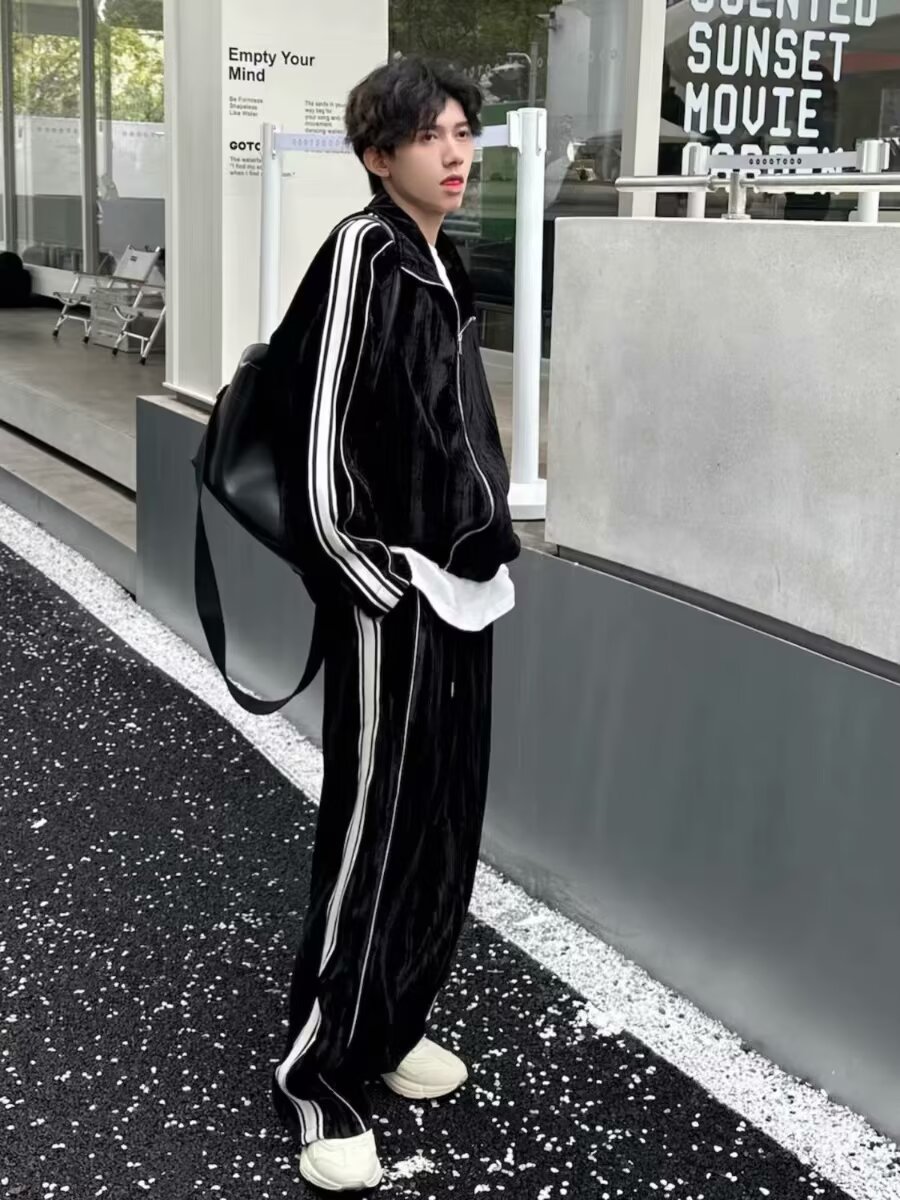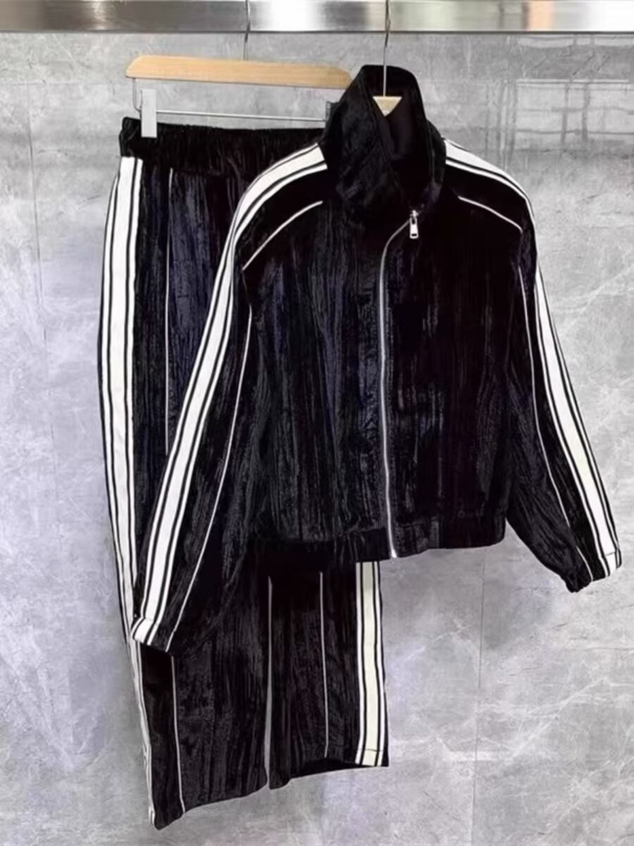 스트라이프 의류 세트 봄과 가을 2024 새로운 패션 느슨한 컬러 매칭 야외 커플 레저 스포츠 투피스 세트