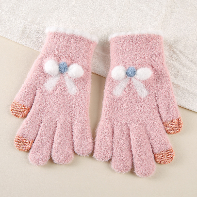 可触屏蝴蝶结手套女秋冬季毛线针织保暖五指可爱学生冬天骑车新款