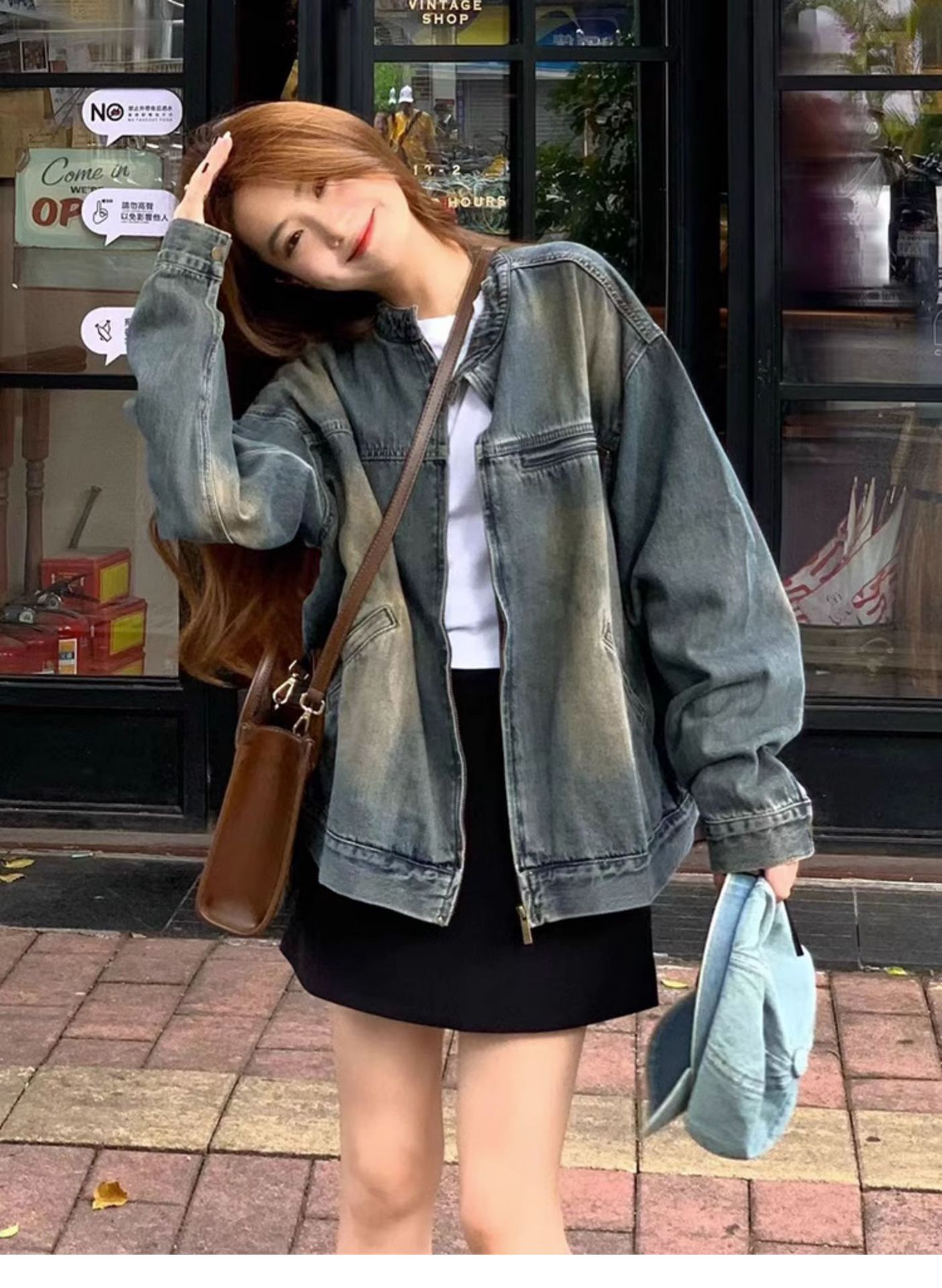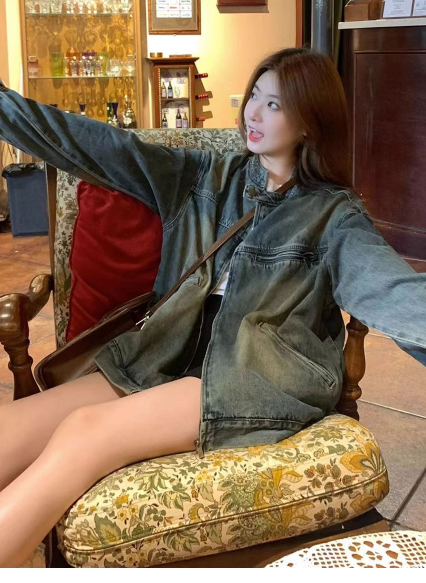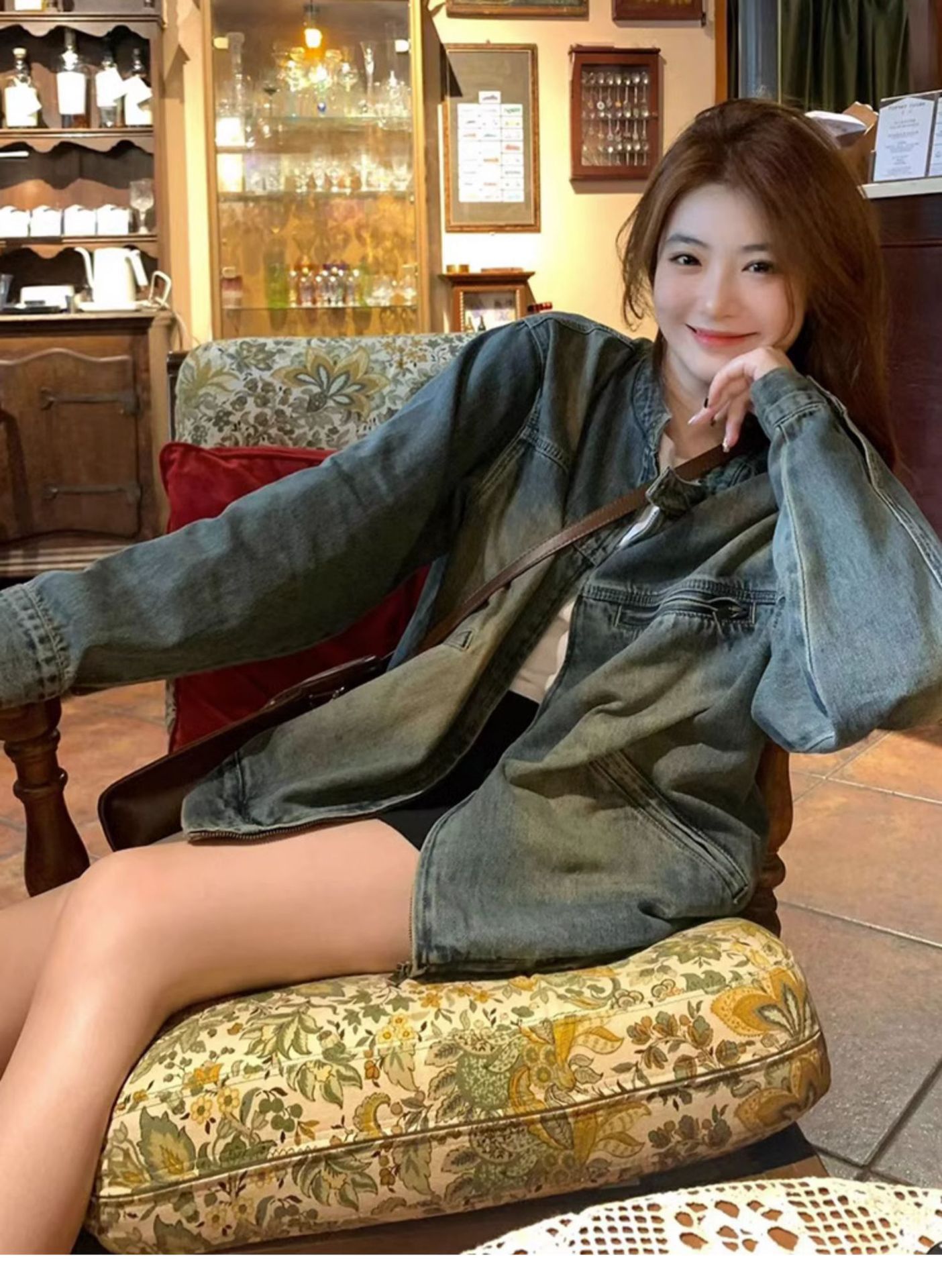 미국 스타일 복고풍 오래 된 데님 코트 여성의 가을과 겨울 2024 새로운 느슨한 작업복 자켓 트렌디스토어 가기