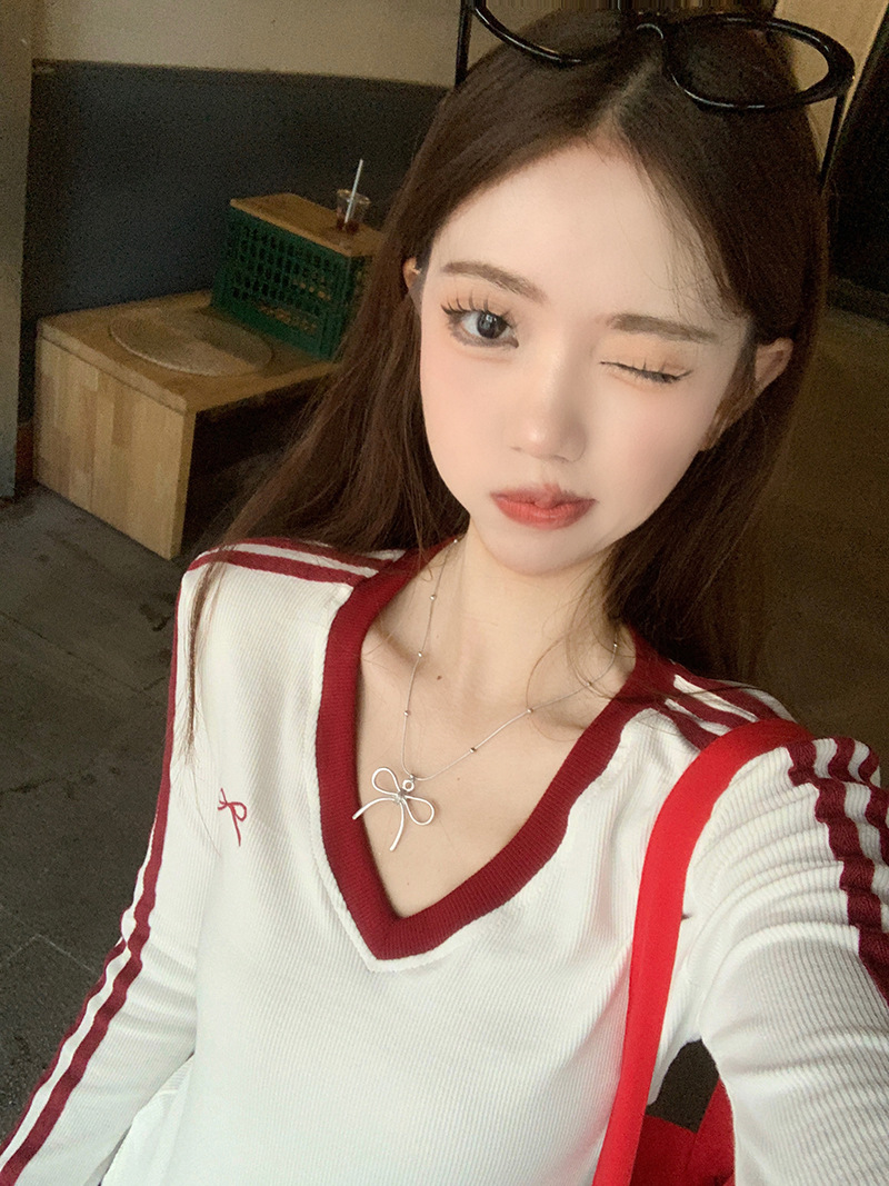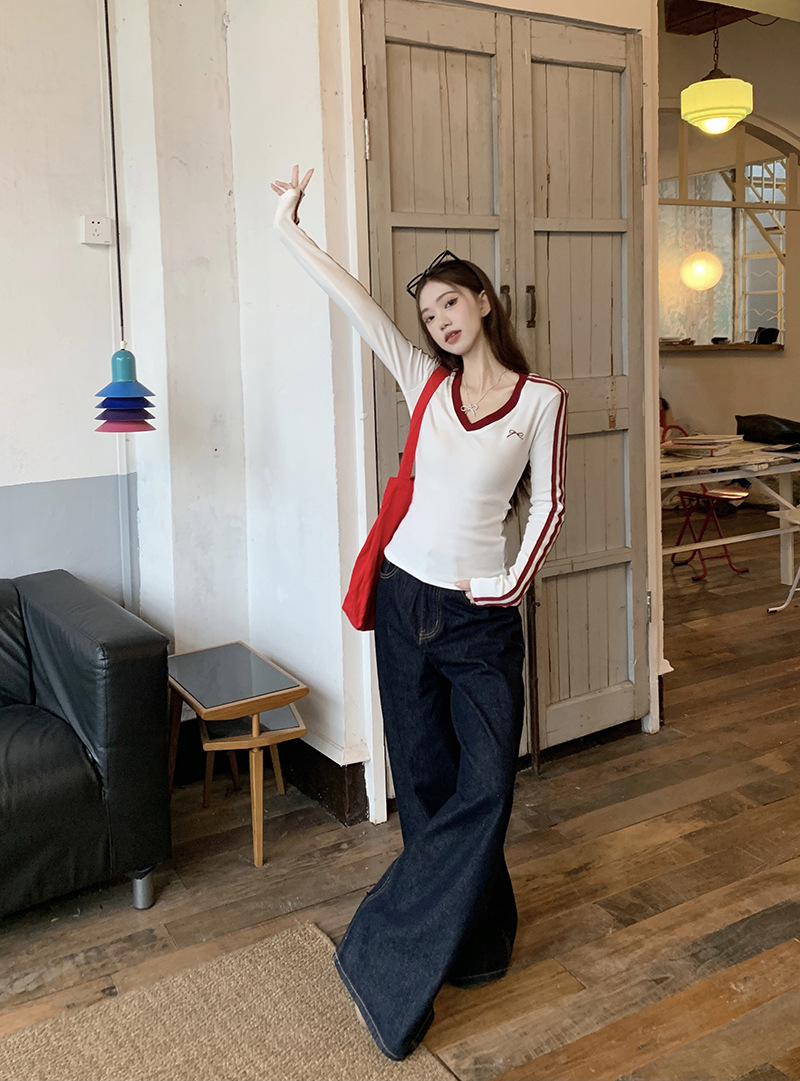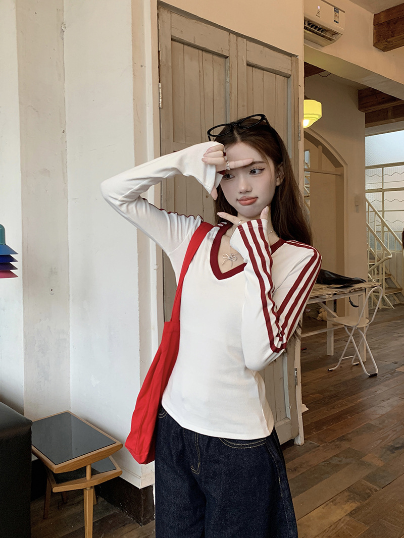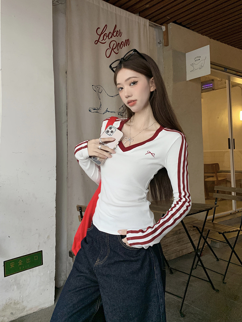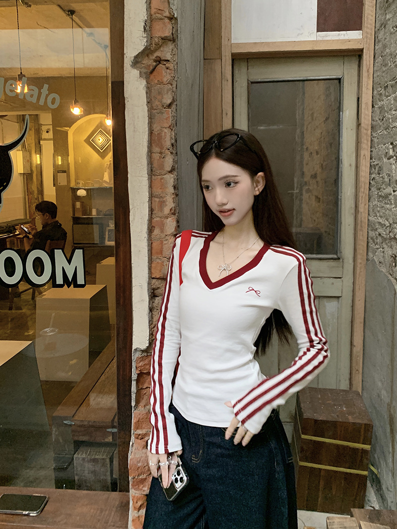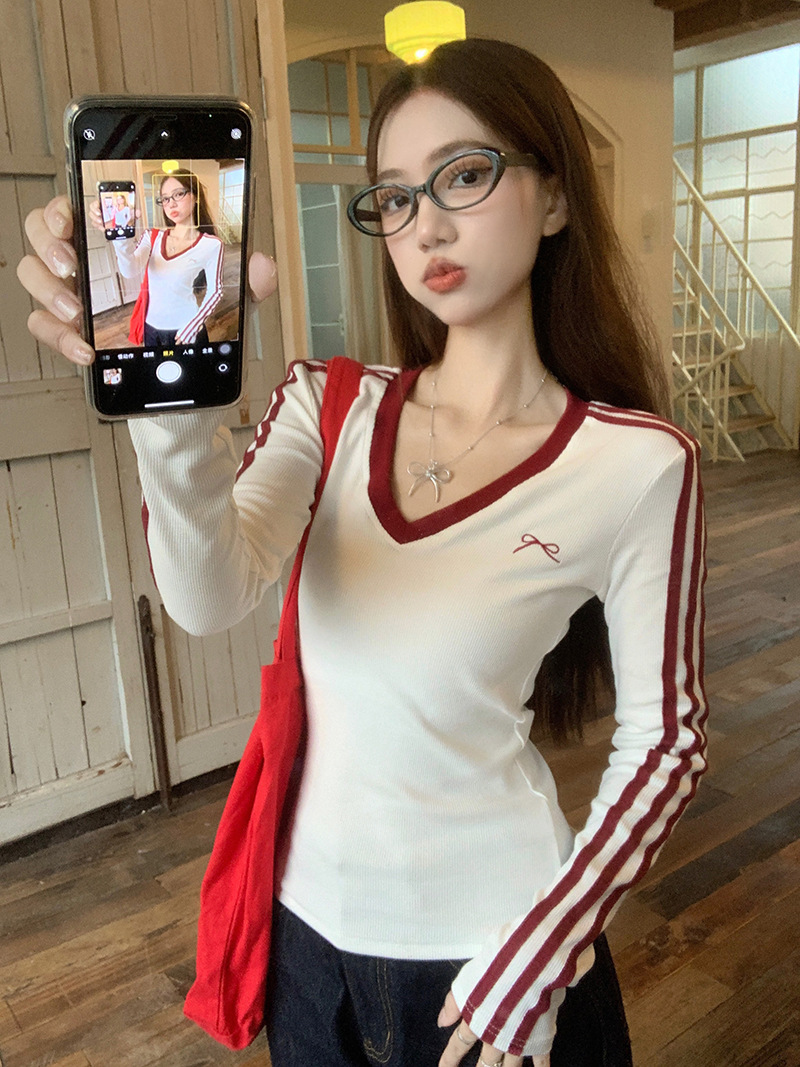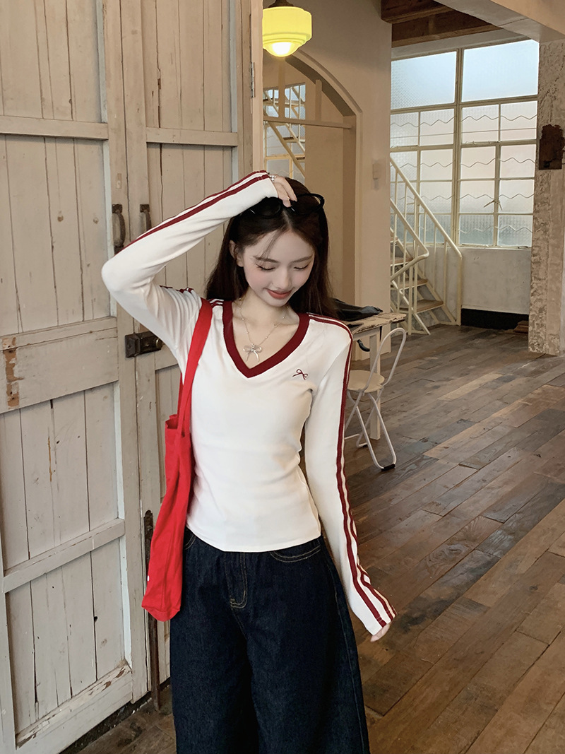 디자인 활 자수 긴 소매 V 넥 화이트 티셔츠 여성용 가을 세련된 컬러 슬림 핏 슬림 핏 풀오버 탑