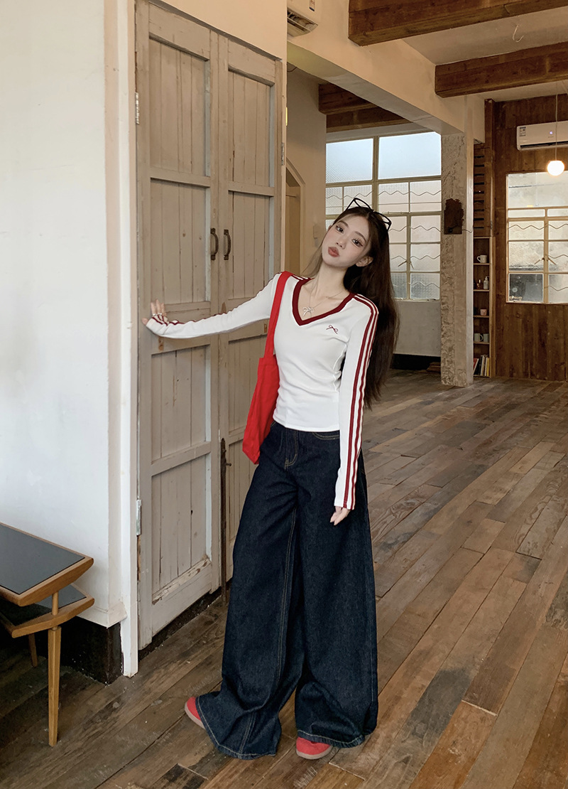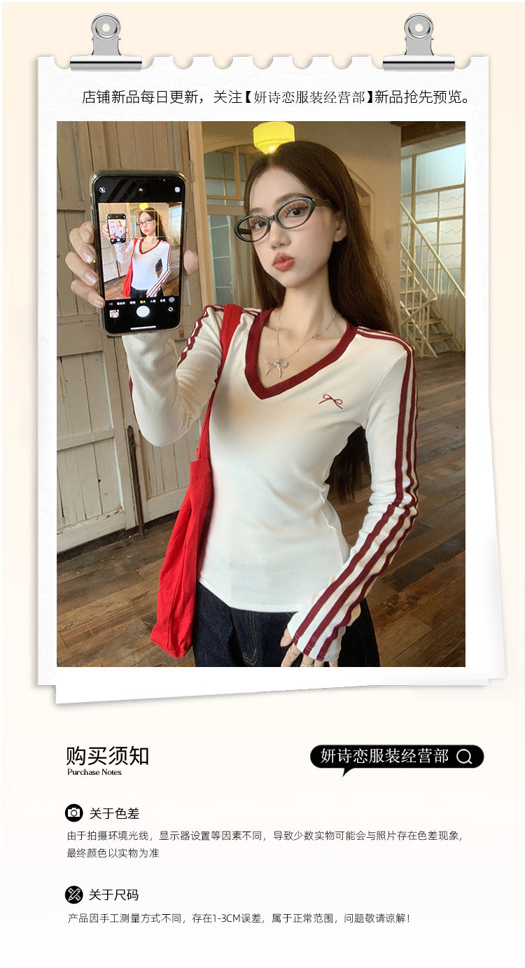 디자인 활 자수 긴 소매 V 넥 화이트 티셔츠 여성용 가을 세련된 컬러 슬림 핏 슬림 핏 풀오버 탑스토어 가기
