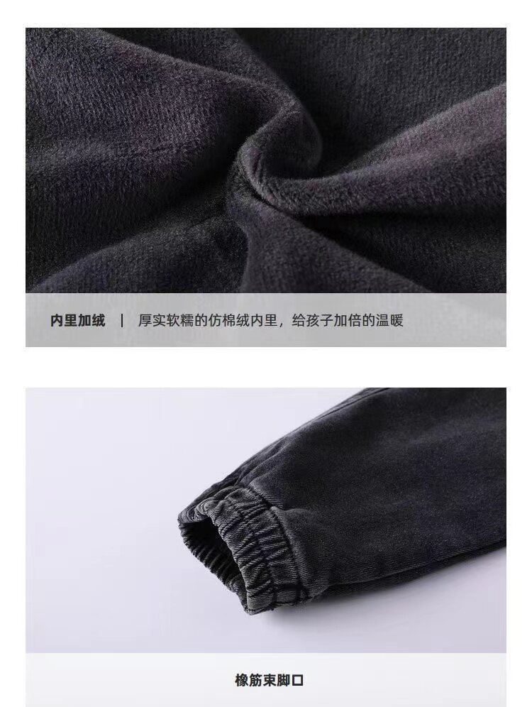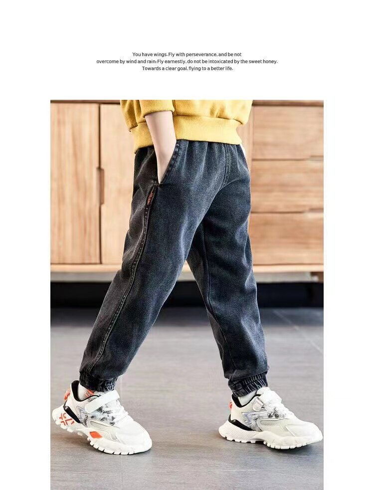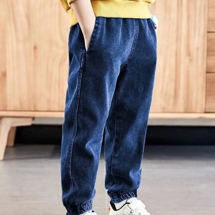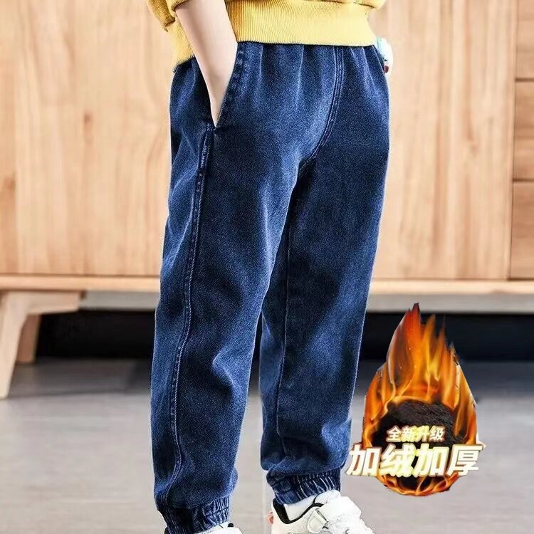 데님 바지 2024 가을과 겨울 새로운 큰 소년 원피스 벨벳 느슨한 패션 기모 따뜻한 데님 바지