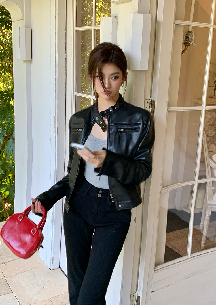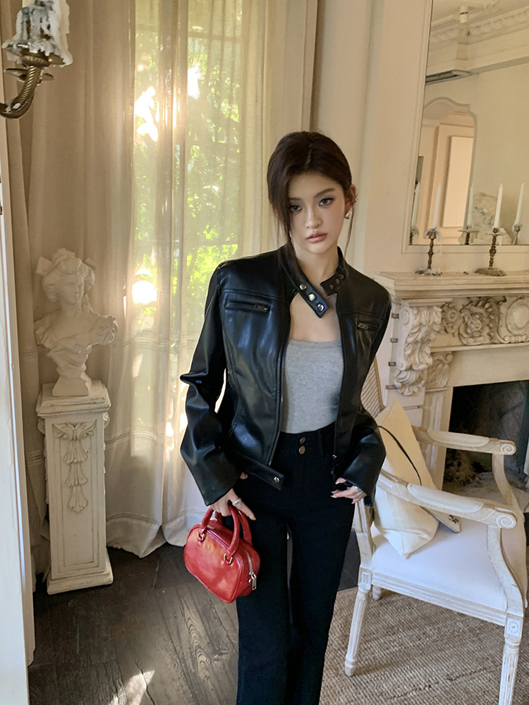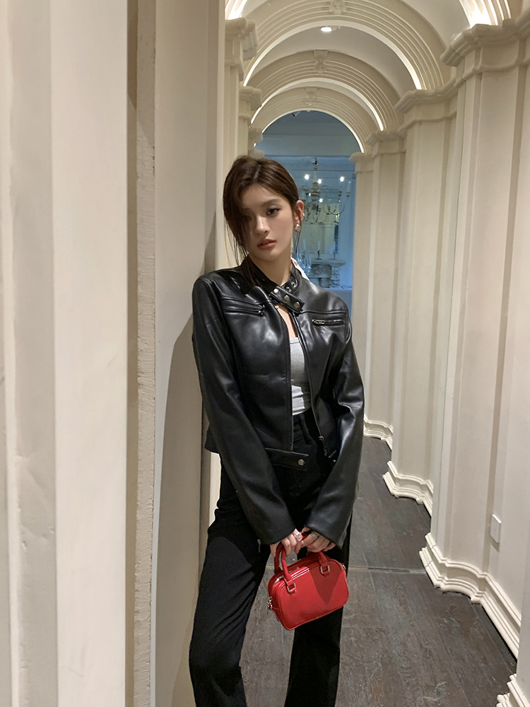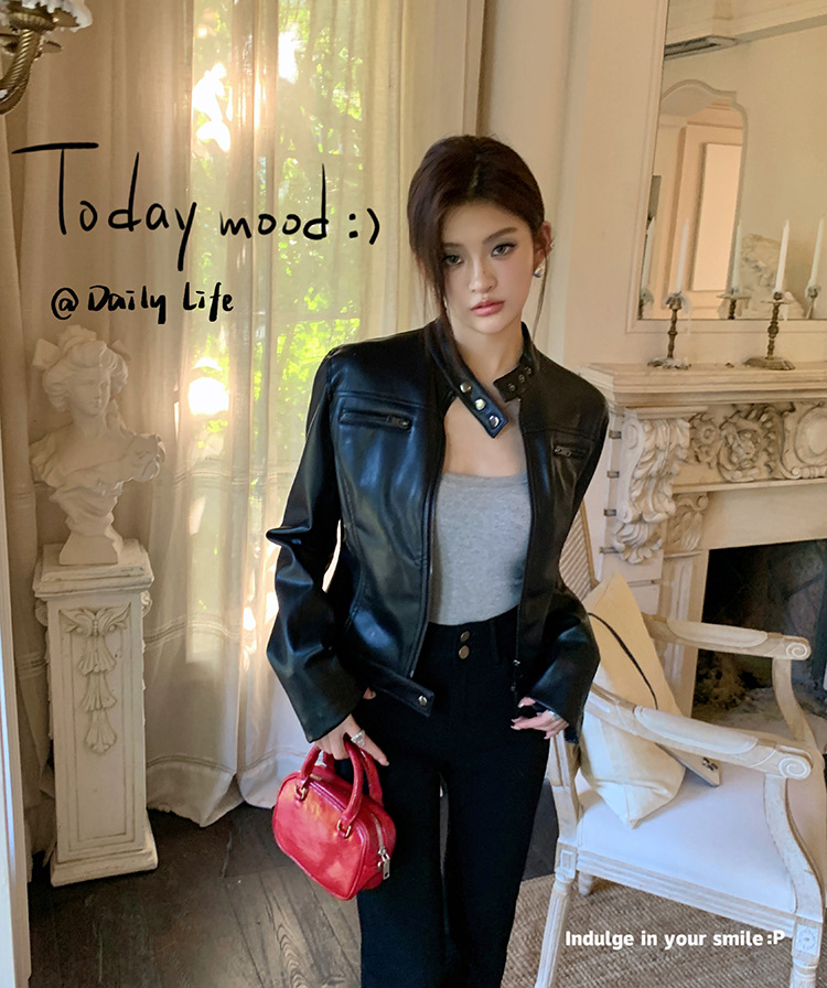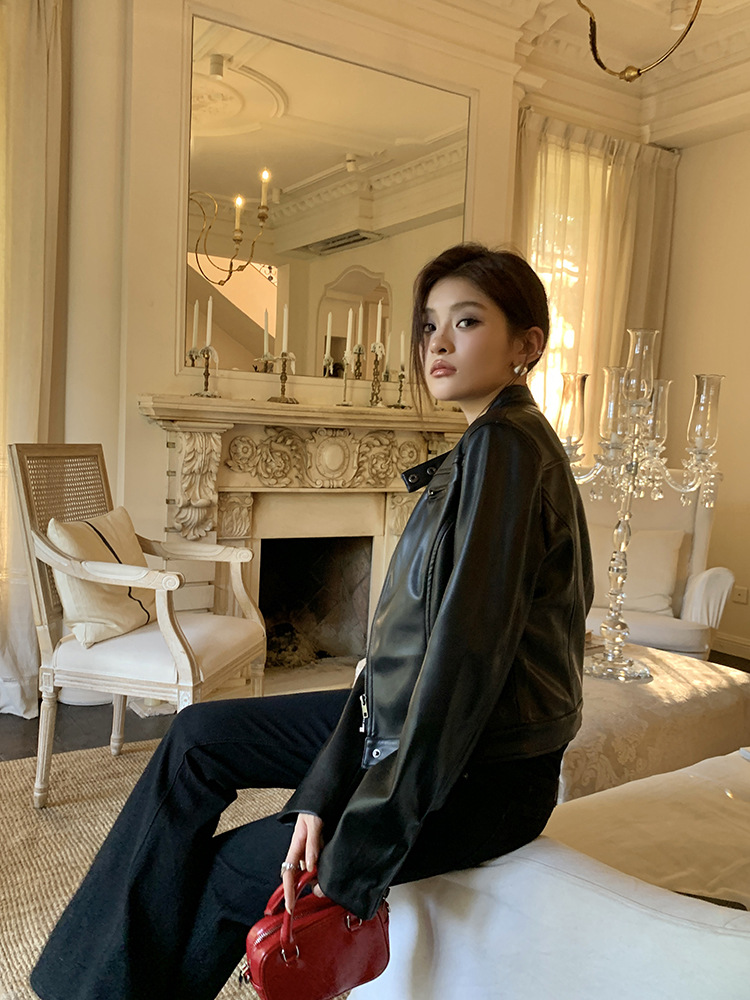 지퍼 재킷 코트 아메리칸 레트로 블랙 쿨 소녀의 수직 칼라 오토바이 짧은 가죽 여성의 하이 엔드 센스 쁘띠스토어 가기
