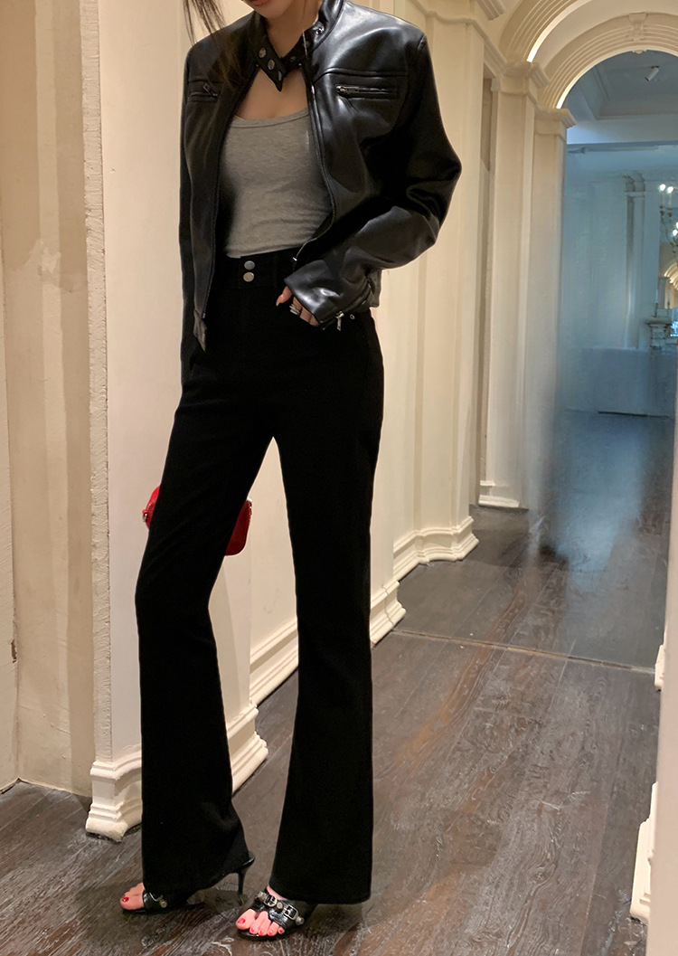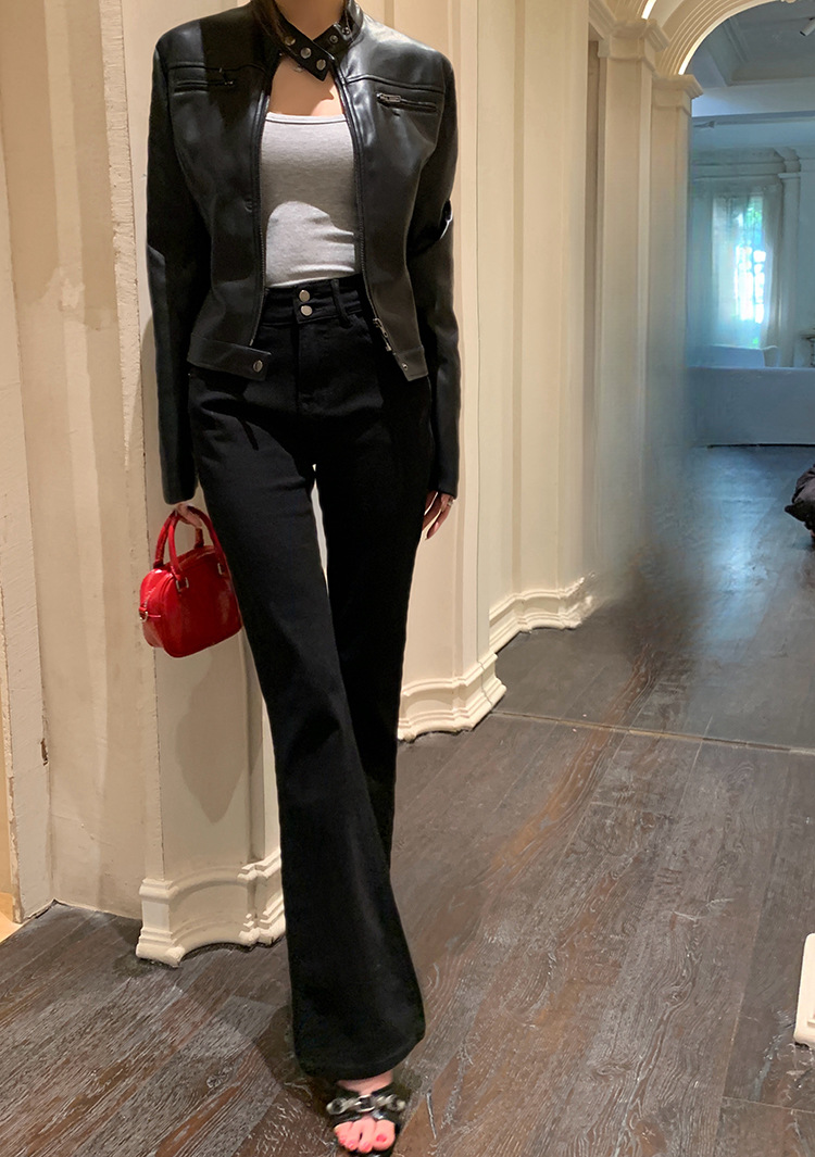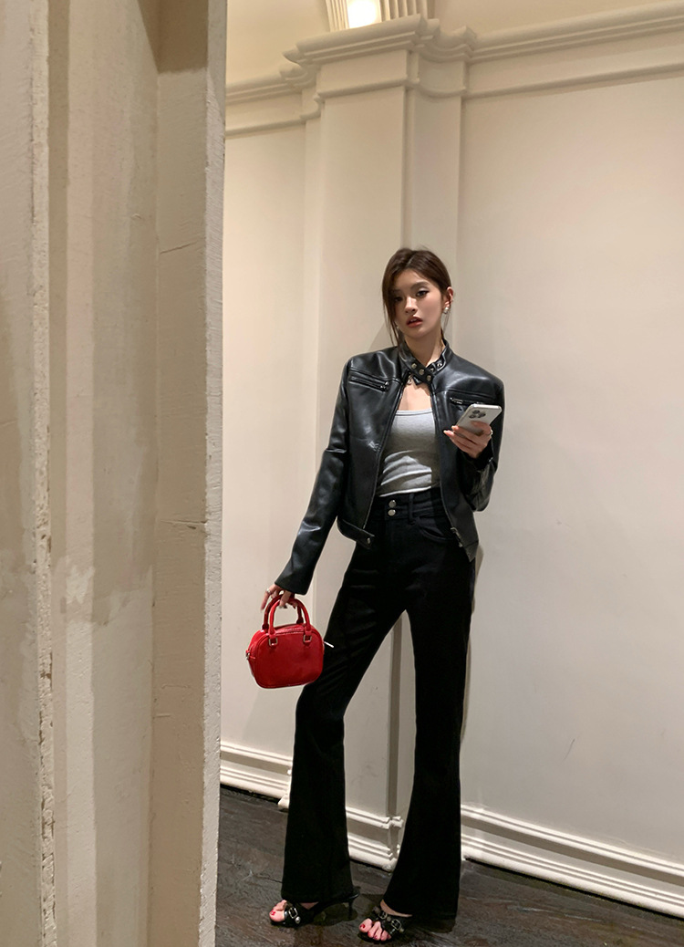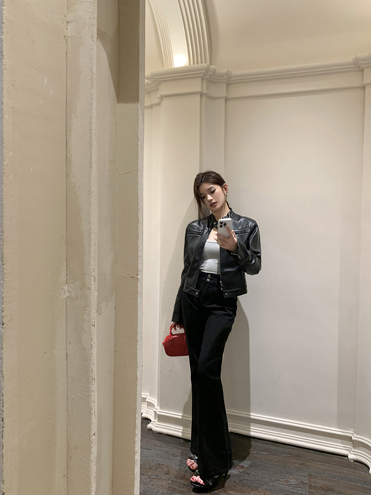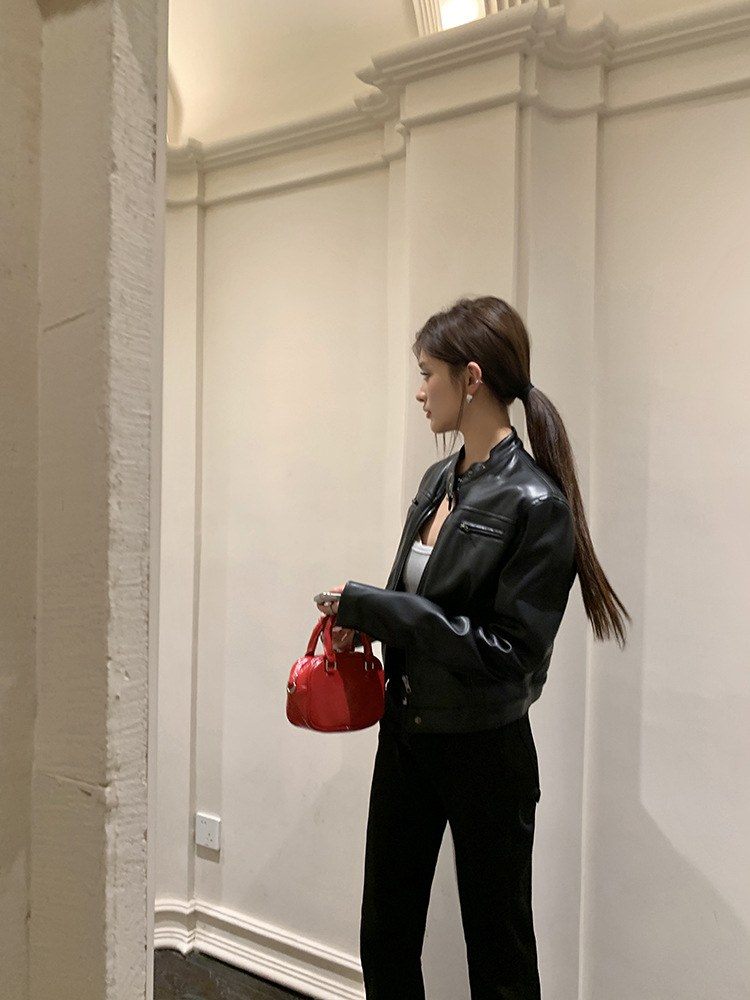 지퍼 재킷 코트 아메리칸 레트로 블랙 쿨 소녀의 수직 칼라 오토바이 짧은 가죽 여성의 하이 엔드 센스 쁘띠스토어 가기