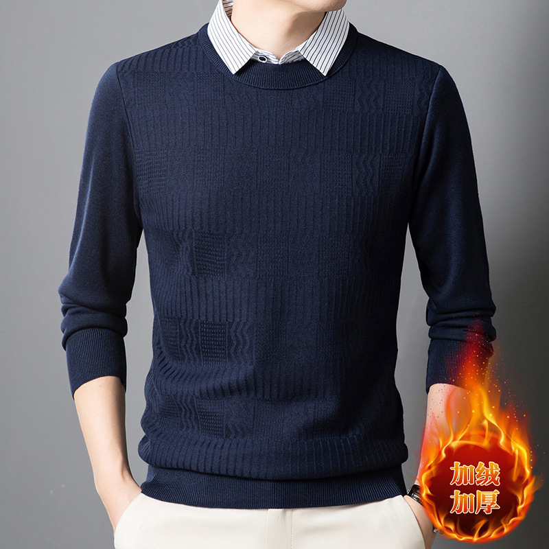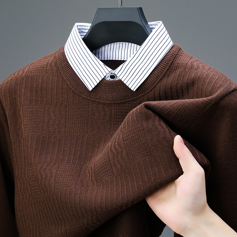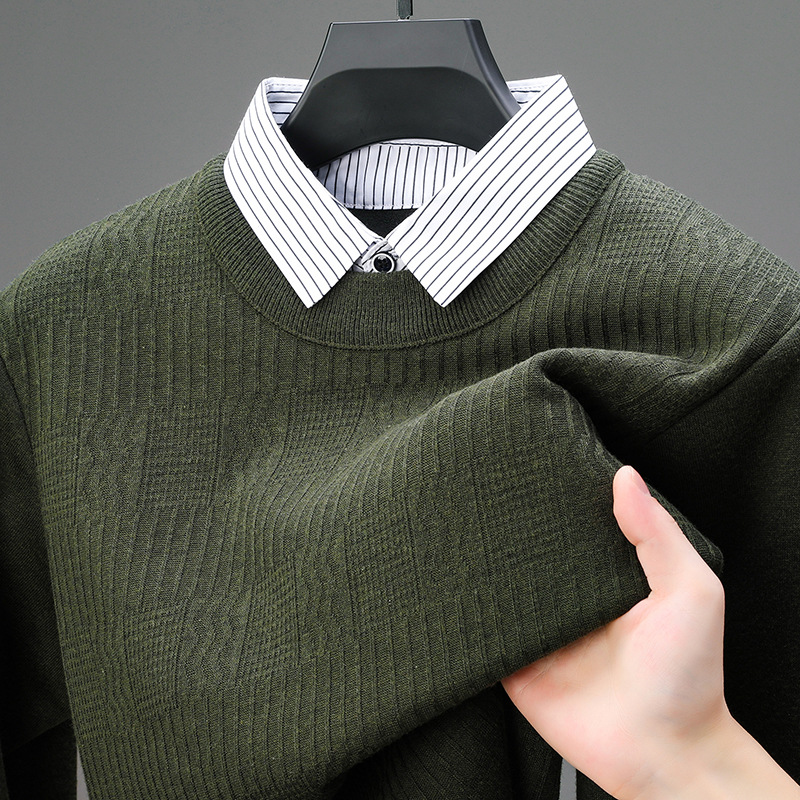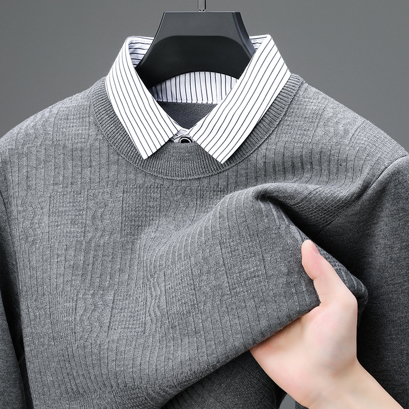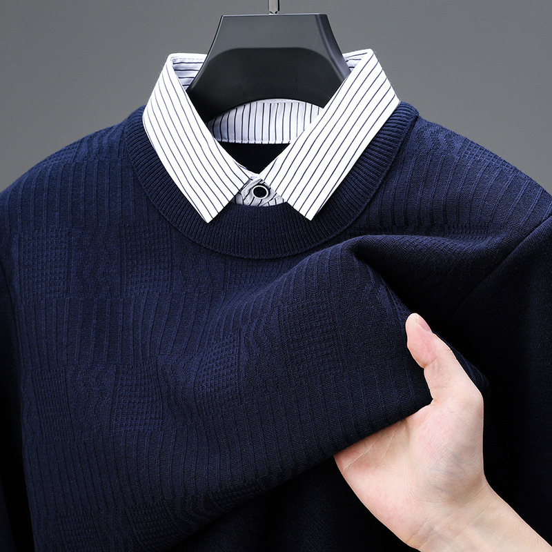 2025 가을 신상 페이크 투피스 울 스웨터 남성용 두꺼운 긴팔 셔츠 칼라 캐주얼 이너웨어 남성 니트웨어