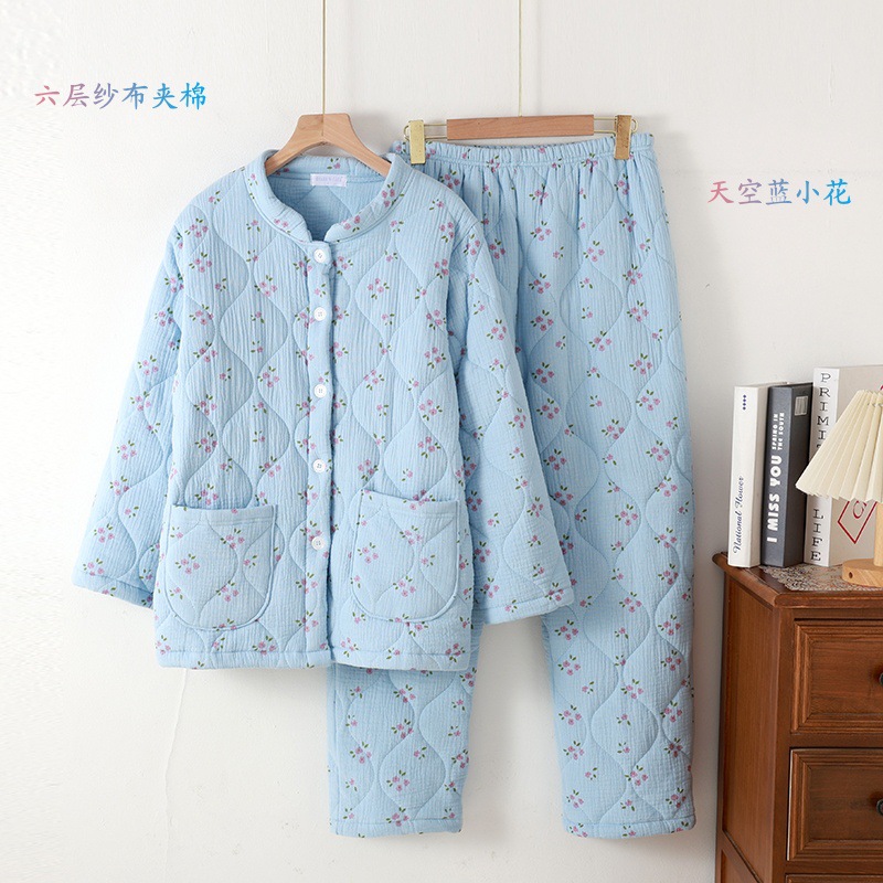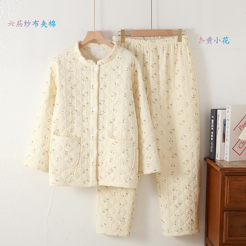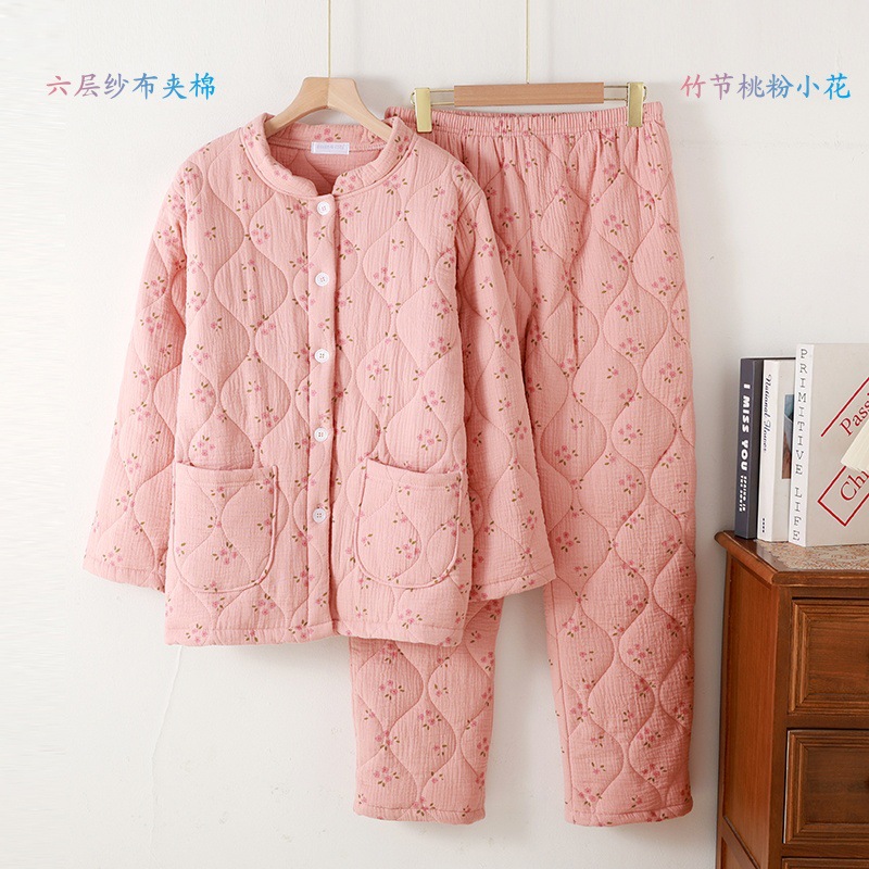 六层加厚绉纹纱布立领开衫纽扣女士套装