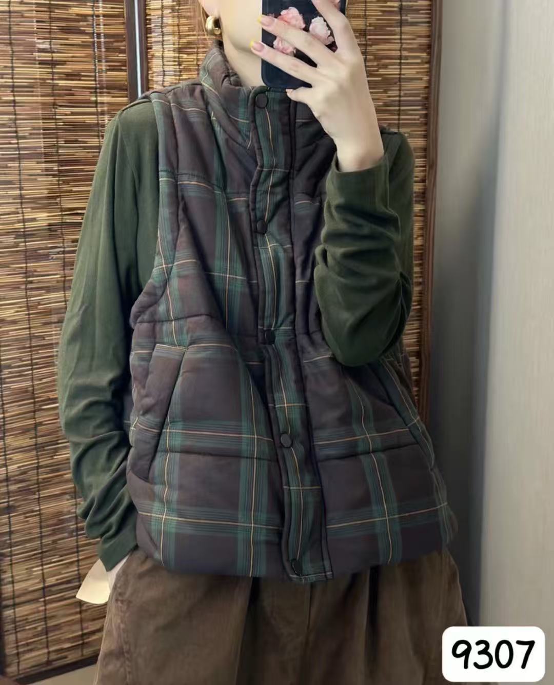 2024 가을과 겨울 한국 스타일 느슨한 간단한 칼라 코튼 체크 조끼 모든 경기 캐주얼 민소매 최고 9307