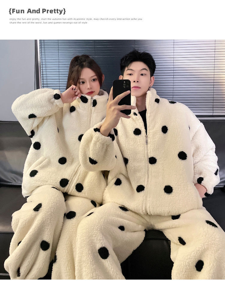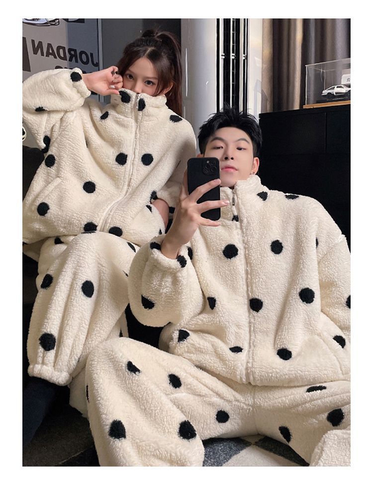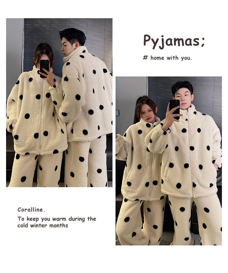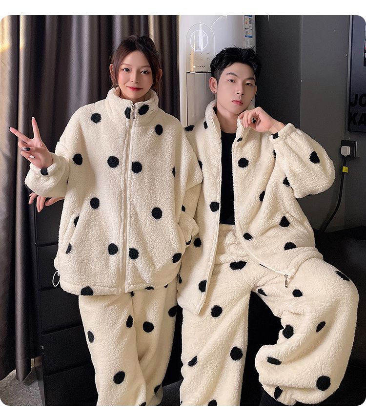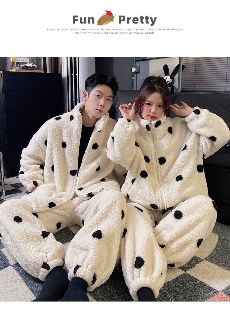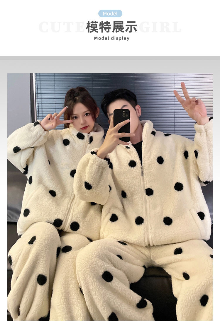 플러스 사이즈 폴카 닷 파자마 여성의 가을과 겨울 커플 플란넬 홈 옷 산호 양털 기모 지퍼 따뜻한 세트
