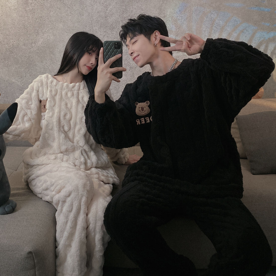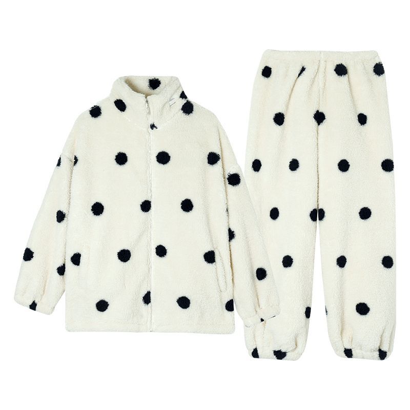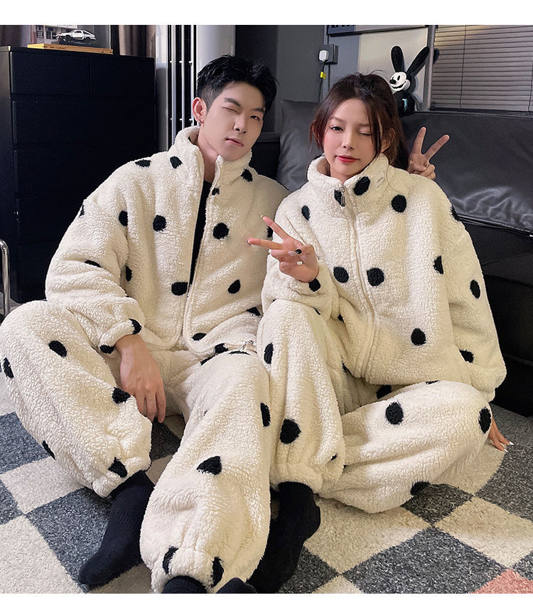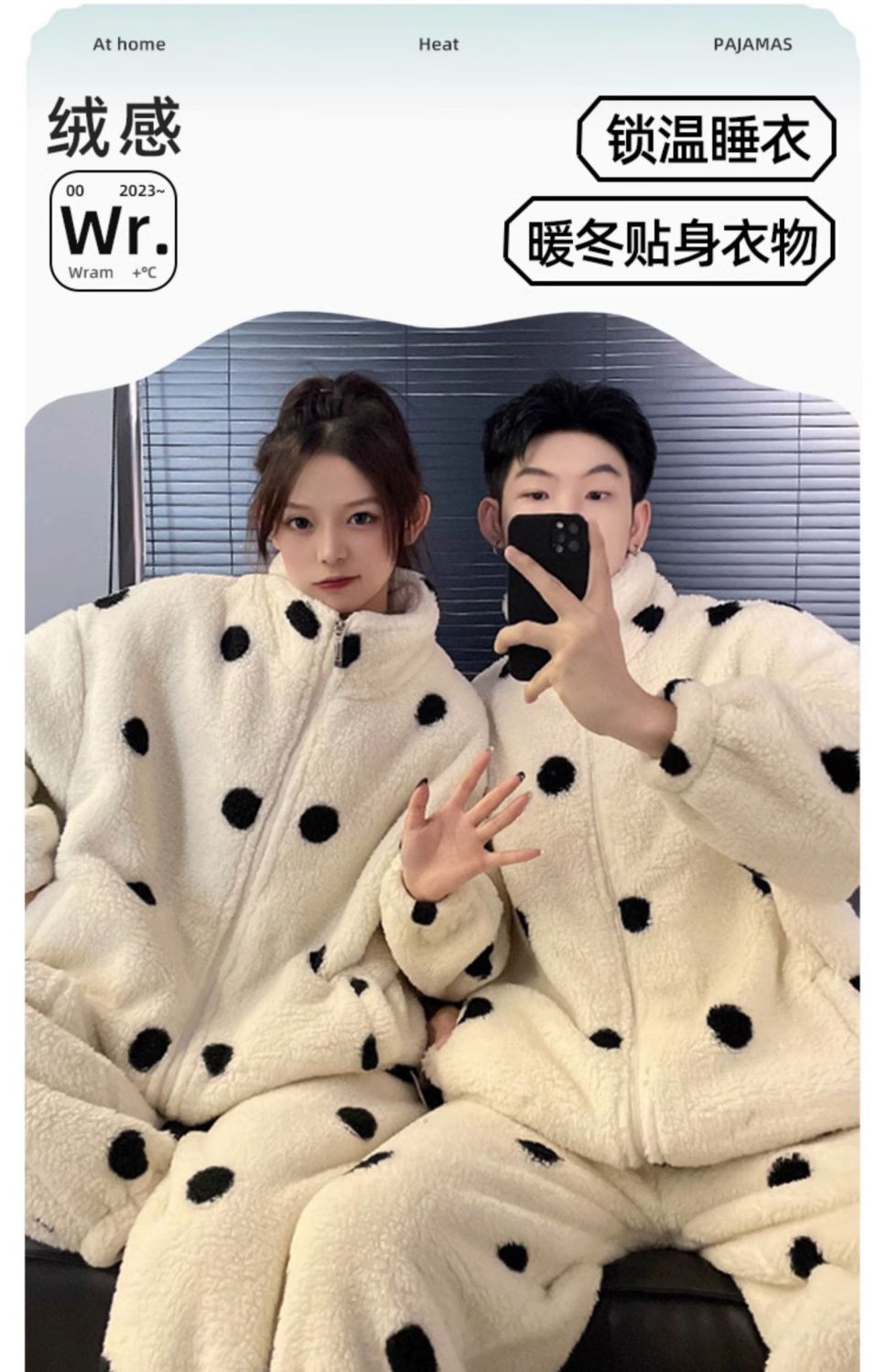 플러스 사이즈 폴카 닷 파자마 여성의 가을과 겨울 커플 플란넬 홈 옷 산호 양털 기모 지퍼 따뜻한 세트