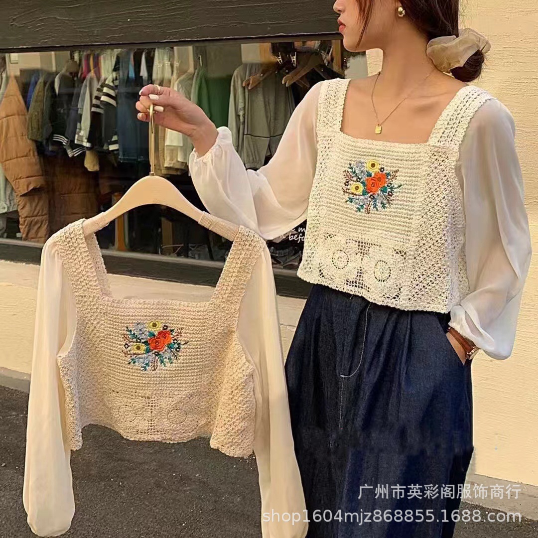 새로운 달콤한 시대 감소 스퀘어 칼라 쉬폰 셔츠 여성의 봄과 가을 디자인 센스 틈새 우아한 서양 스타일 중공 긴팔 셔츠스토어 가기