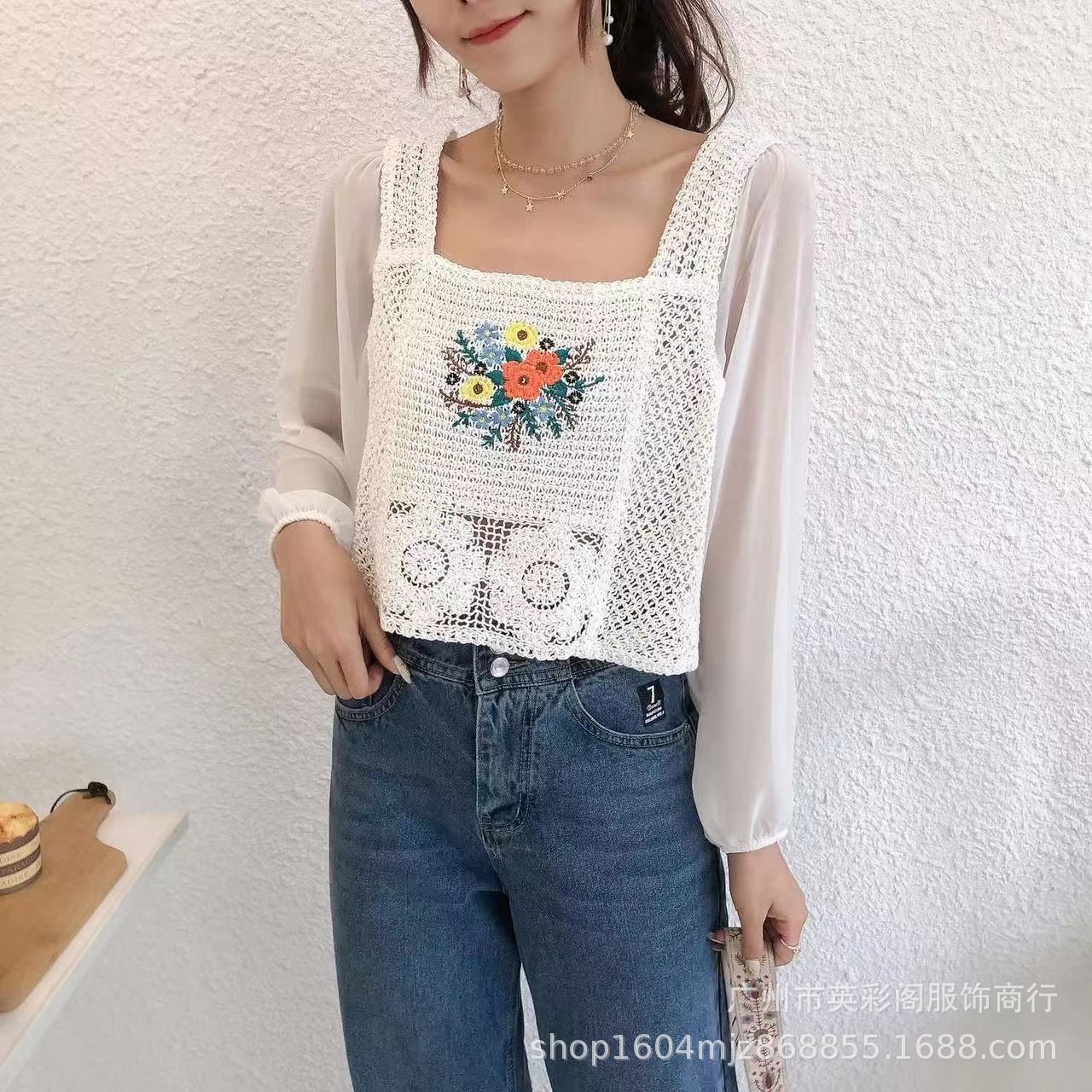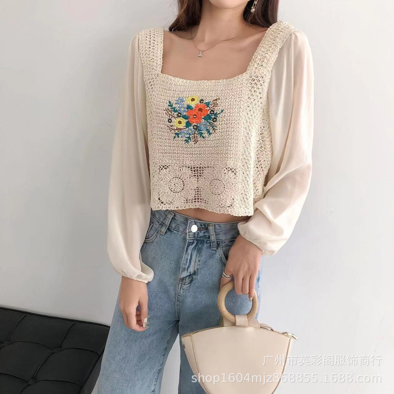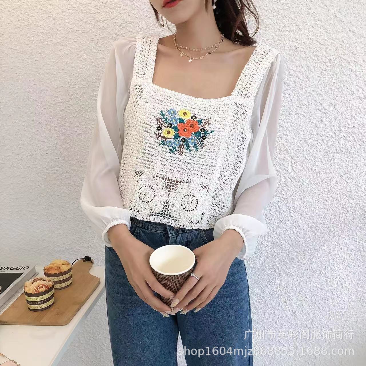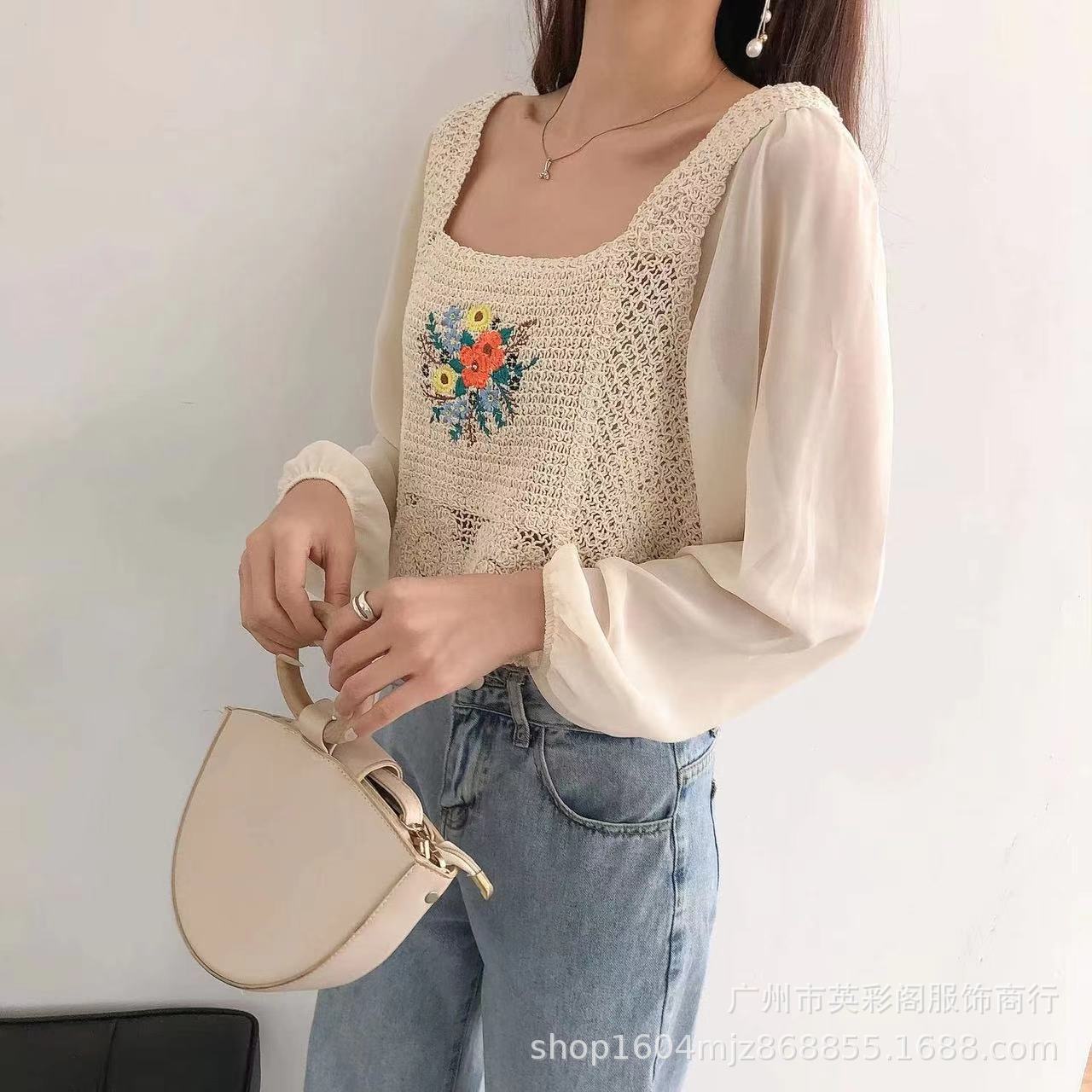새로운 달콤한 시대 감소 스퀘어 칼라 쉬폰 셔츠 여성의 봄과 가을 디자인 센스 틈새 우아한 서양 스타일 중공 긴팔 셔츠
