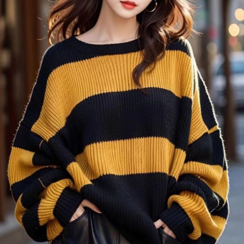 2024 가을/겨울 플러스 사이즈 새로운 긴 소매 줄무늬 스웨터 크루 넥 느슨한 니트 콘트라스트 컬러 니트 스웨터 게으른 재킷