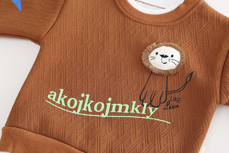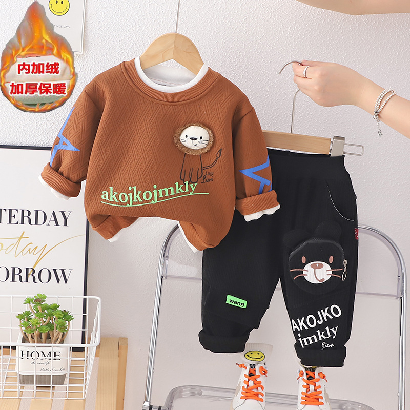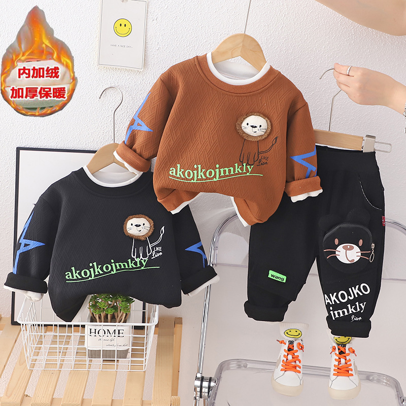 가을과 겨울 뉴 보이즈 기모 크루 넥 긴팔 세트 보이즈 기모 스웨터 따뜻한 바지 투피스 세트