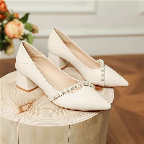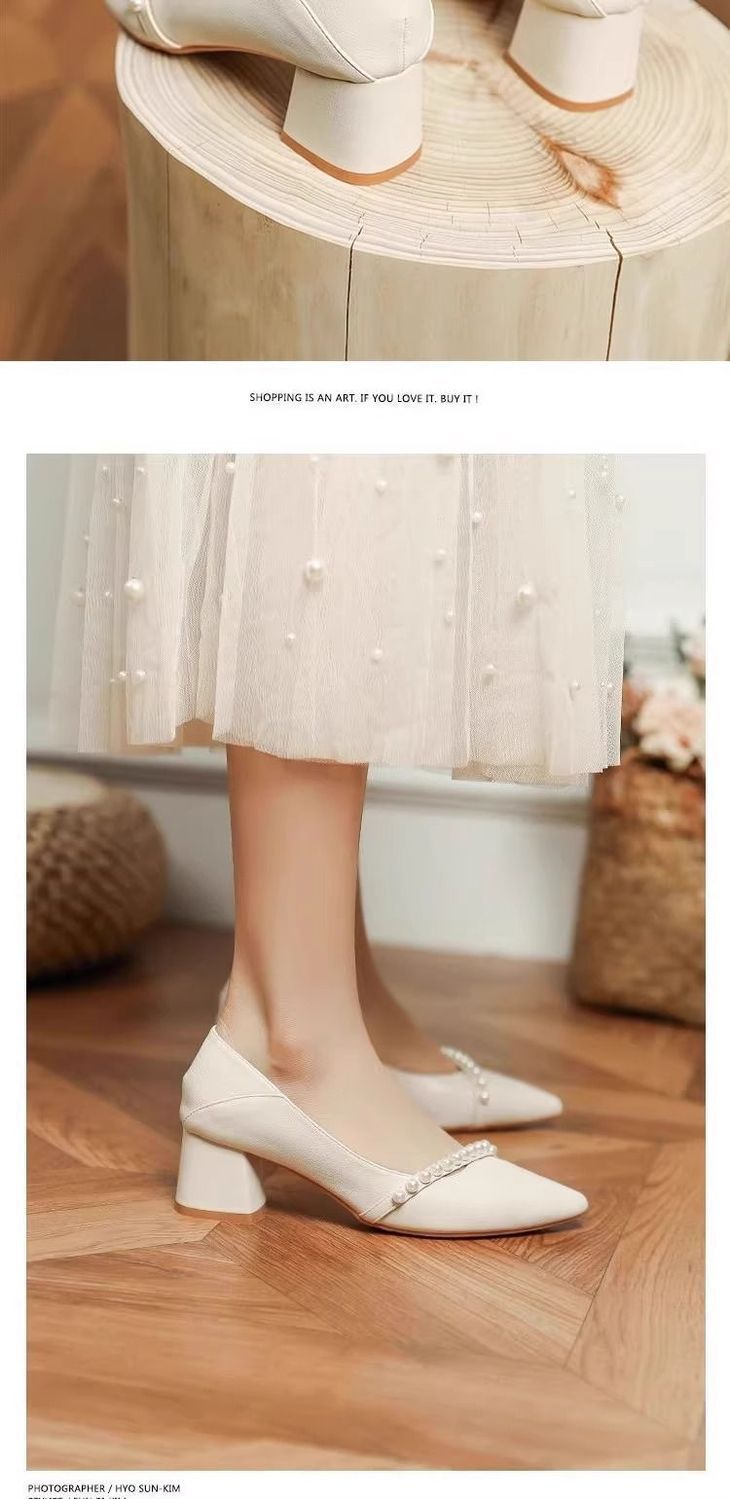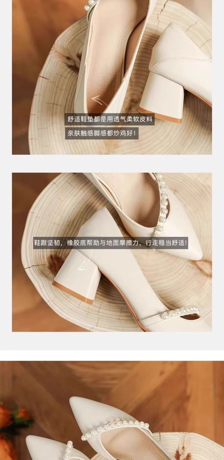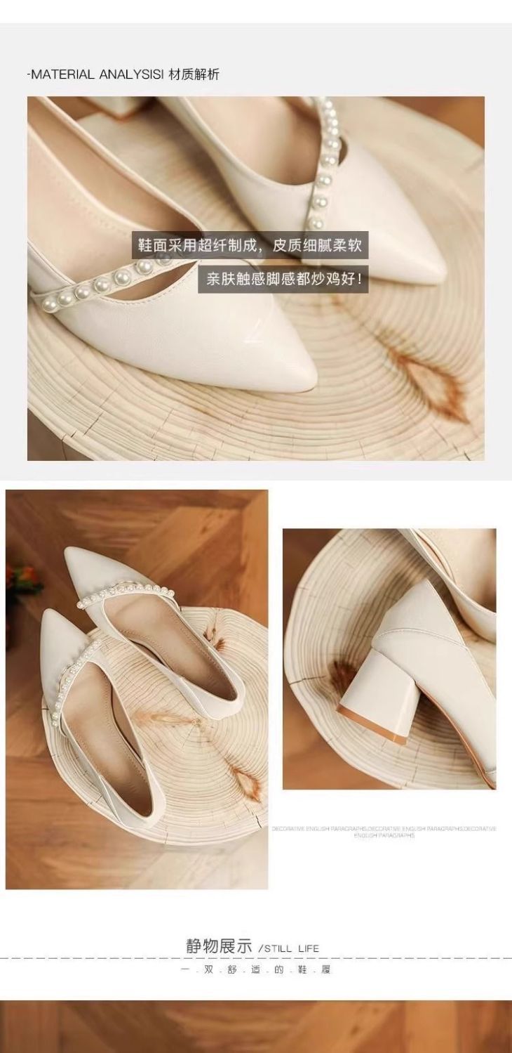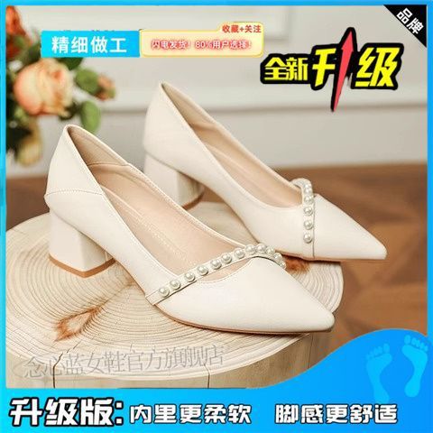 2025 봄 신상 얕은 입 뾰족한 부드러운 가죽 두꺼운 굽 중간 굽 저녁 바람 요정 부드럽고 다재다능한 여성용 하이힐스토어 가기