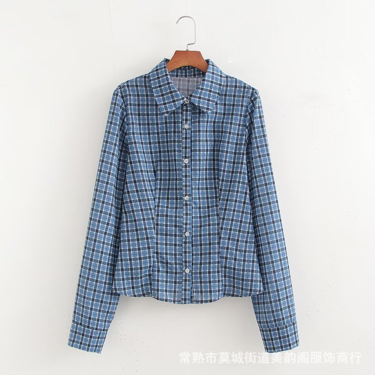 UC & ZA 국경 AliExpress 유럽 및 미국 여성 프랑스 복고풍 옷깃 체크 슬림 적합 슬림 긴 소매 캐주얼 셔츠스토어 가기