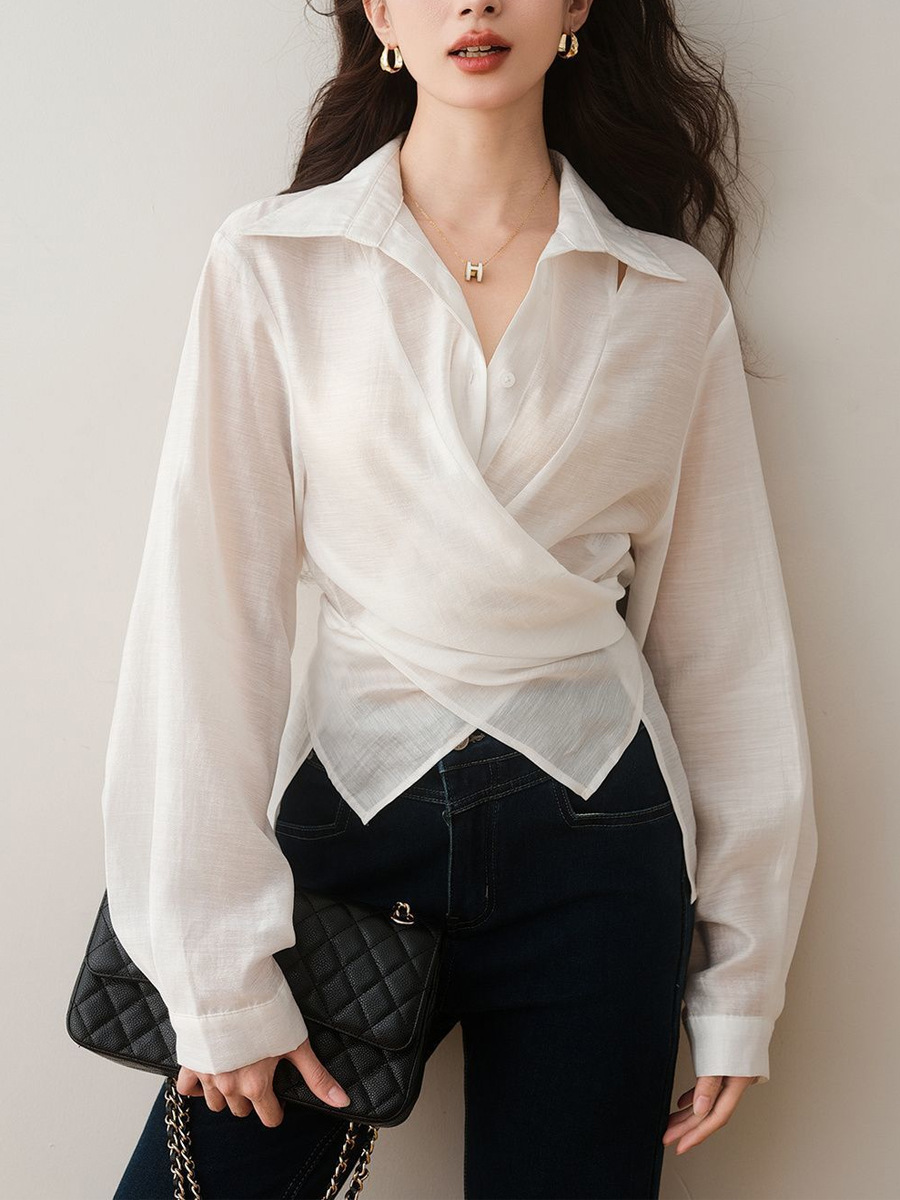 디자인 크로스 스트랩 긴 소매 셔츠 이른 가을 새로운 프랑스 허리 셔츠 옷깃 우아한 탑스토어 가기