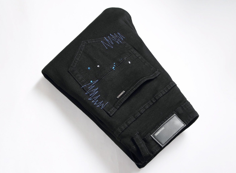 유럽과 미국의 하이 스트리트 블랙 크로스 배지 핫 드릴링 리핑 청바지 남성 슬림 핏 작은 다리 캐주얼 긴 바지 트렌디 브랜드