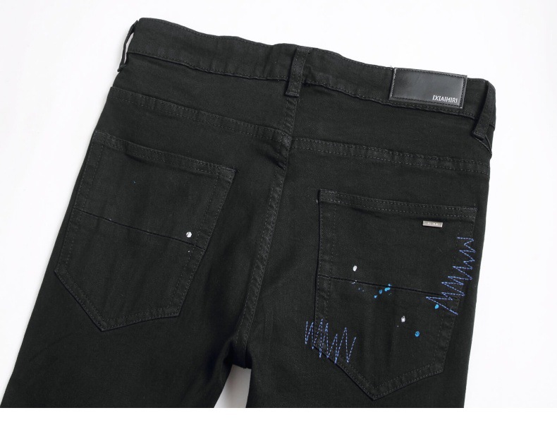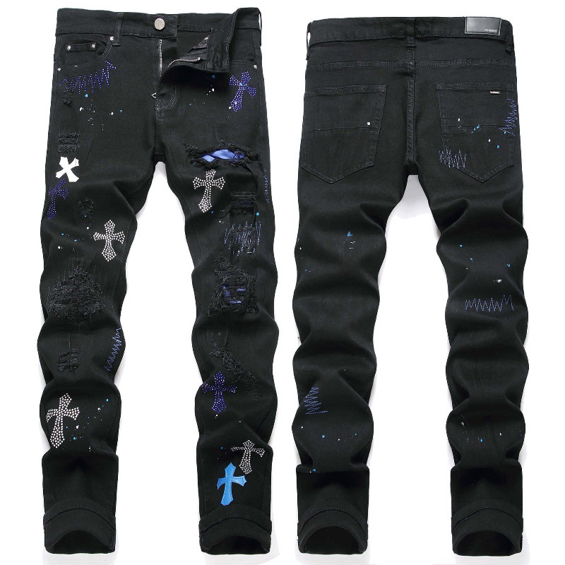 유럽과 미국의 하이 스트리트 블랙 크로스 배지 핫 드릴링 리핑 청바지 남성 슬림 핏 작은 다리 캐주얼 긴 바지 트렌디 브랜드스토어 가기