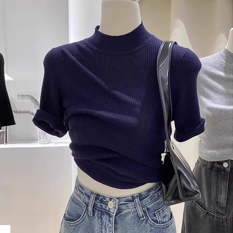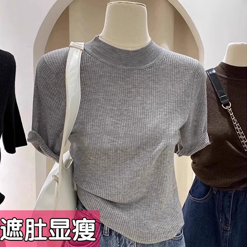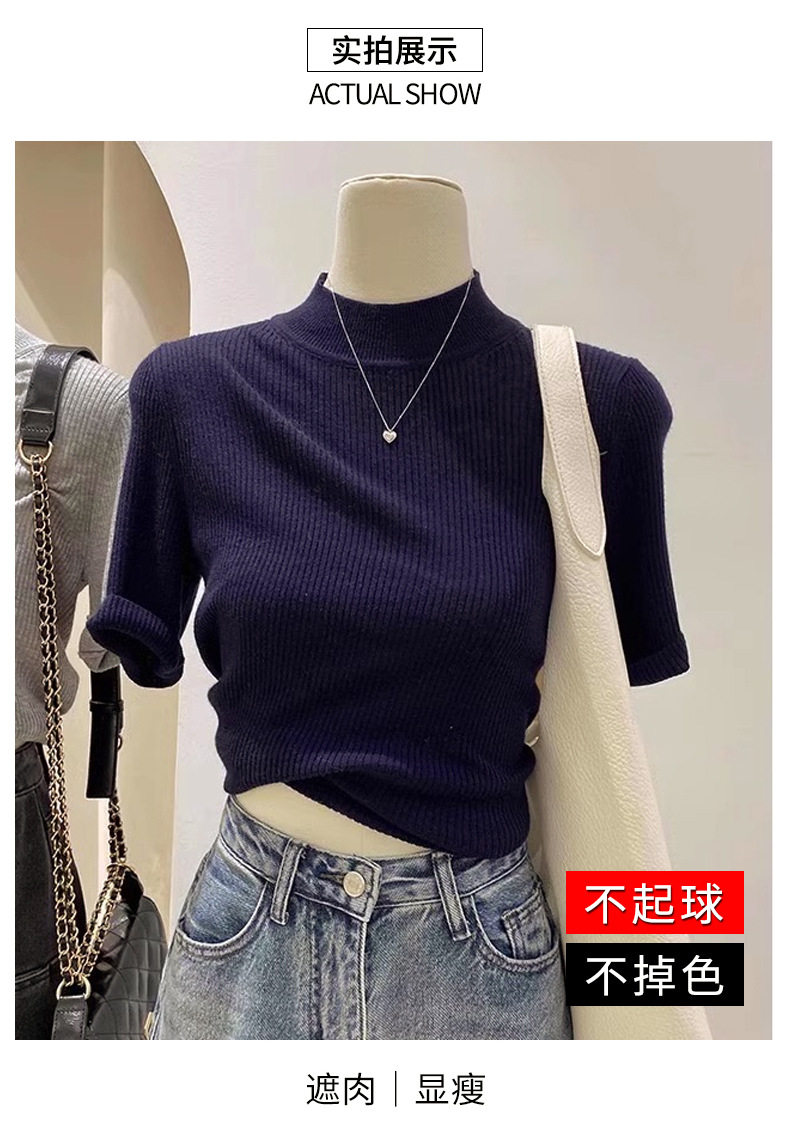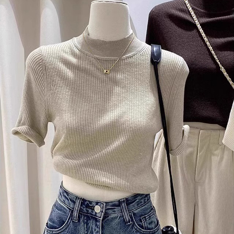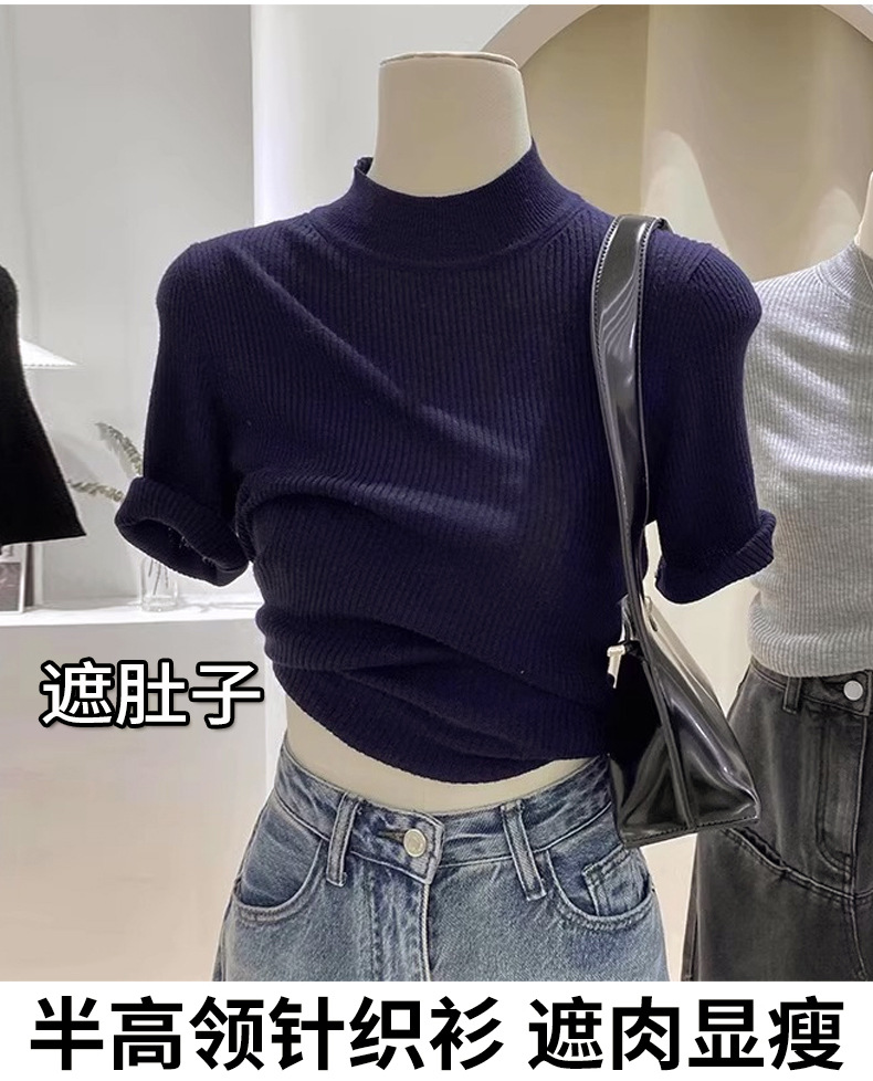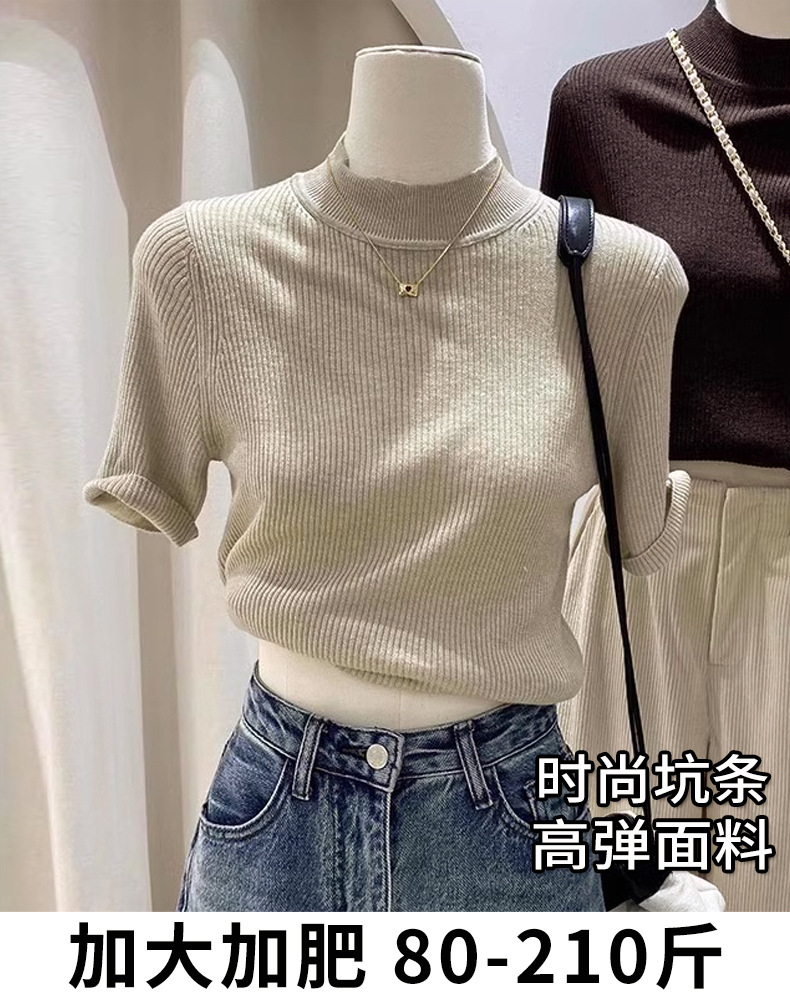 플러스 사이즈 모의 높이 칼라 니트 스웨터 여자 봄 가을 올 매치 하프 슬리브 우아한베이스 레이어 셔츠 소프트 왁스 쇼트 슬리브 웨스턴 스타일 탑 통통녀