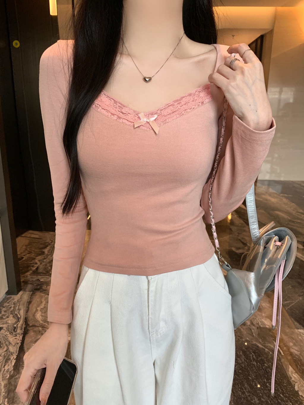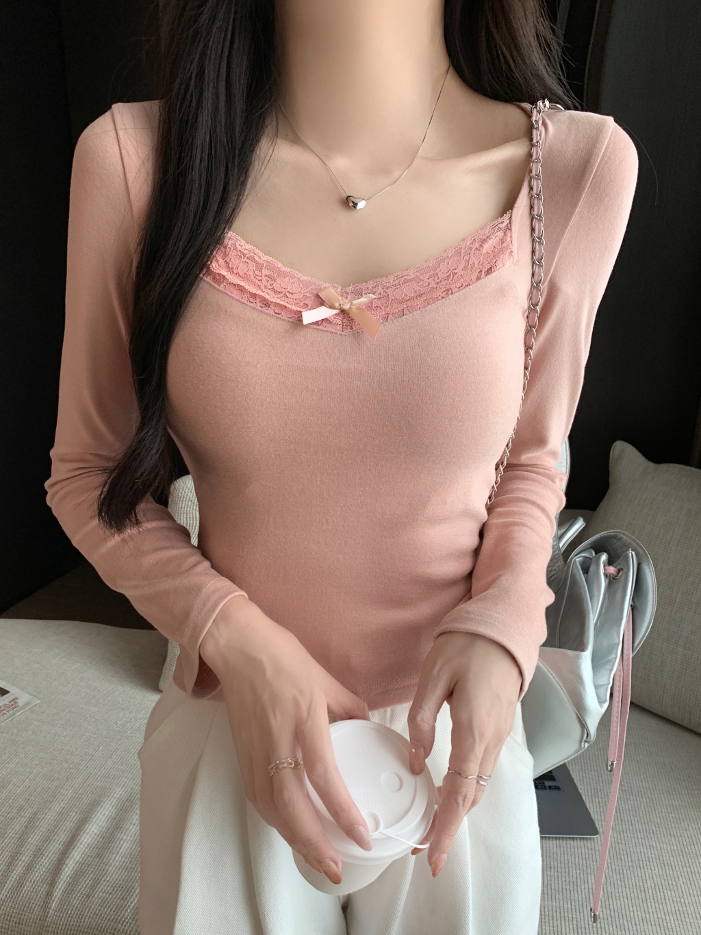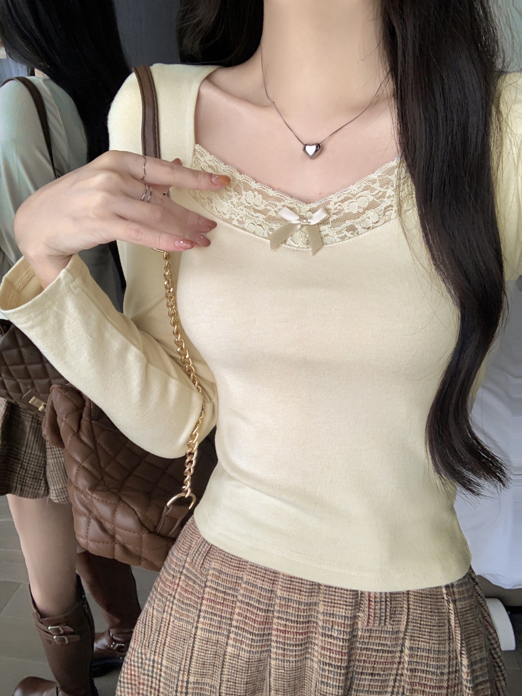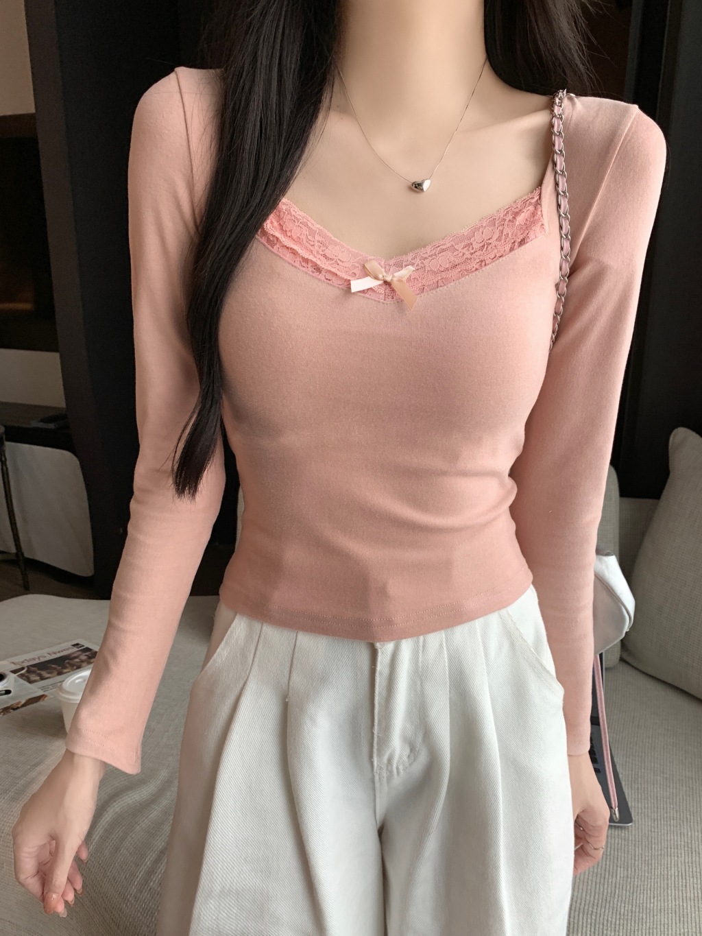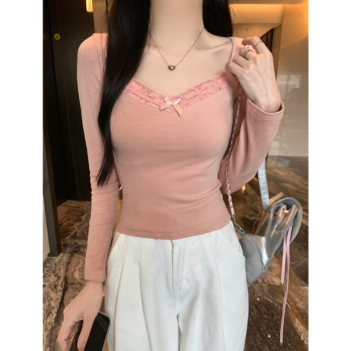 가을과 겨울 실 드 벨벳 샌딩 패딩 따뜻한 기질 레이스 긴팔 티셔츠 여성베이스 셔츠