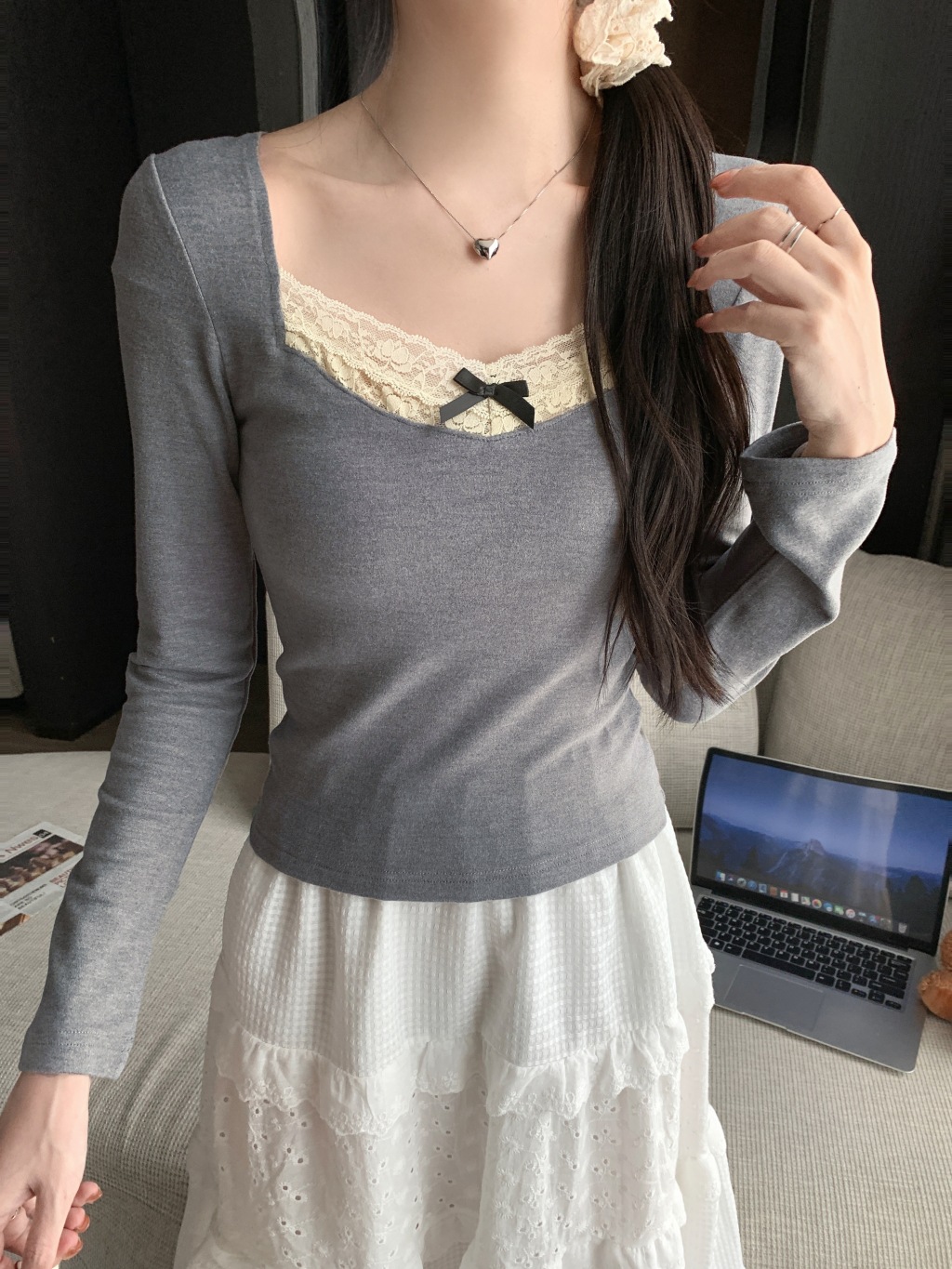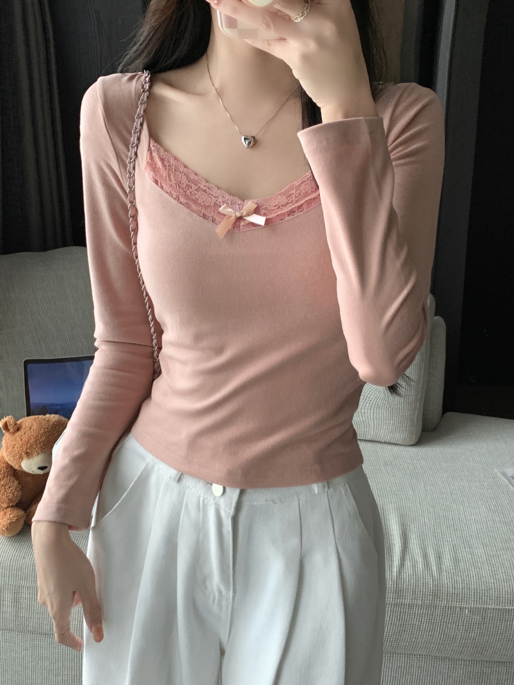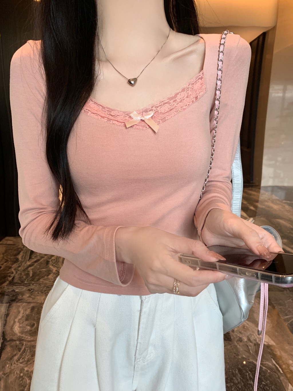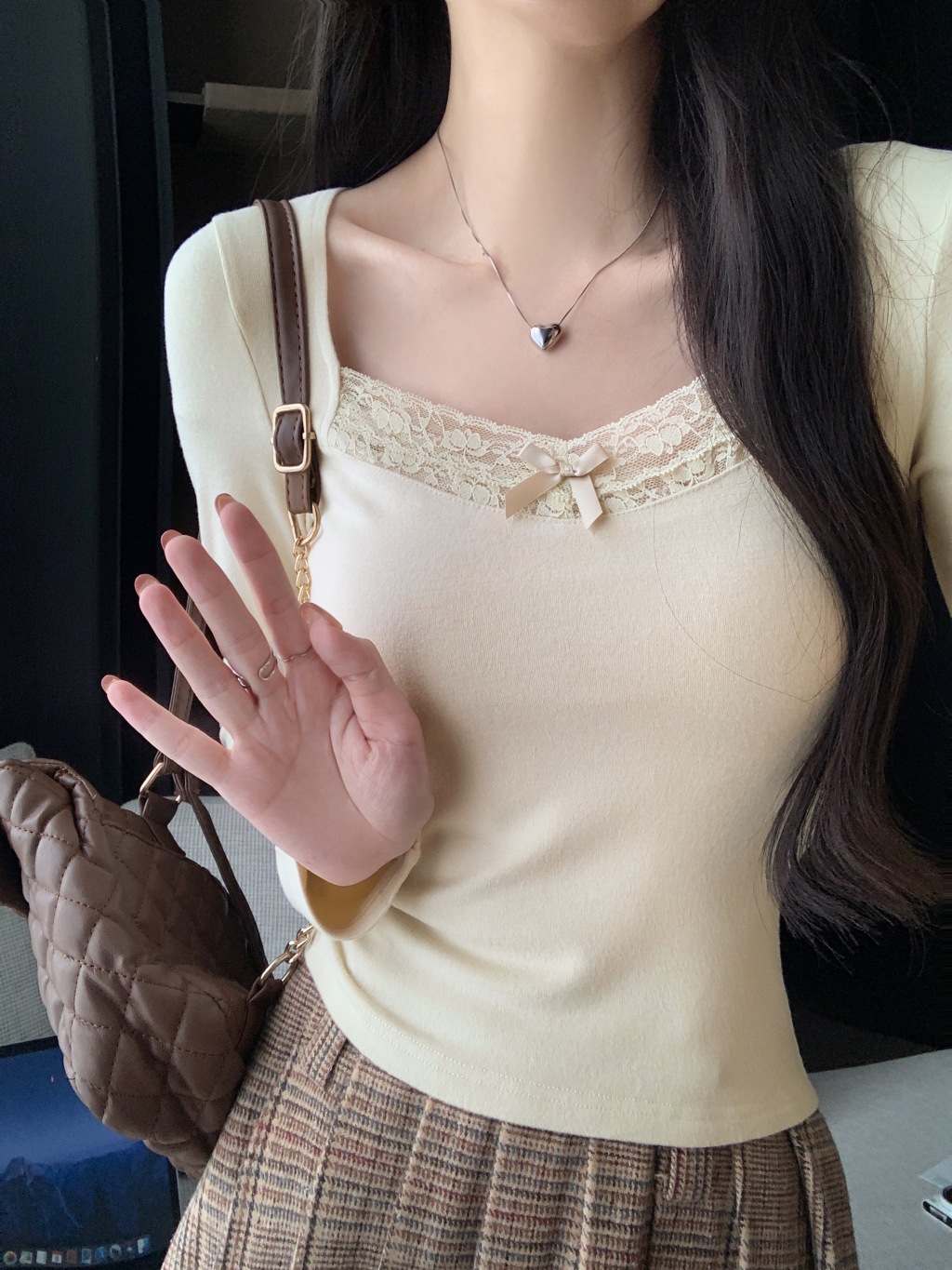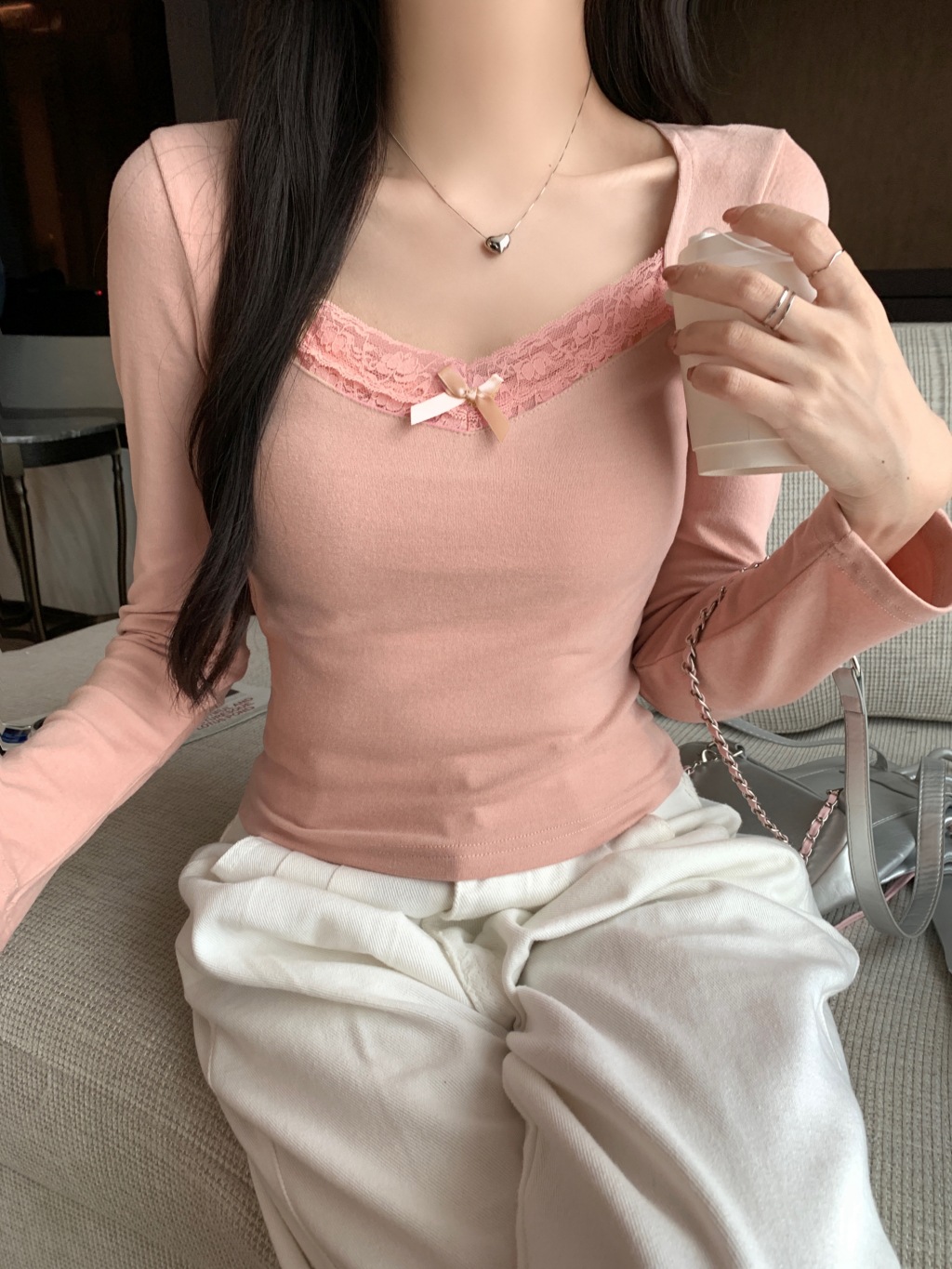가을과 겨울 실 드 벨벳 샌딩 패딩 따뜻한 기질 레이스 긴팔 티셔츠 여성베이스 셔츠