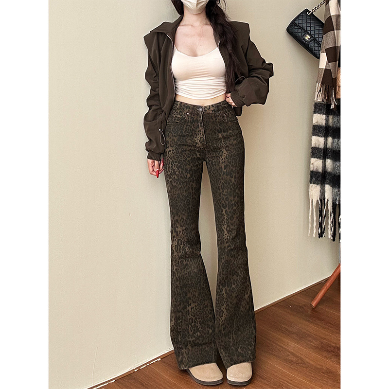 미국 레트로 높은 허리 레오파드 무늬 마이크로 라르 청바지 여성의 2024 가을 새로운 디자인 센스 플래 팬츠