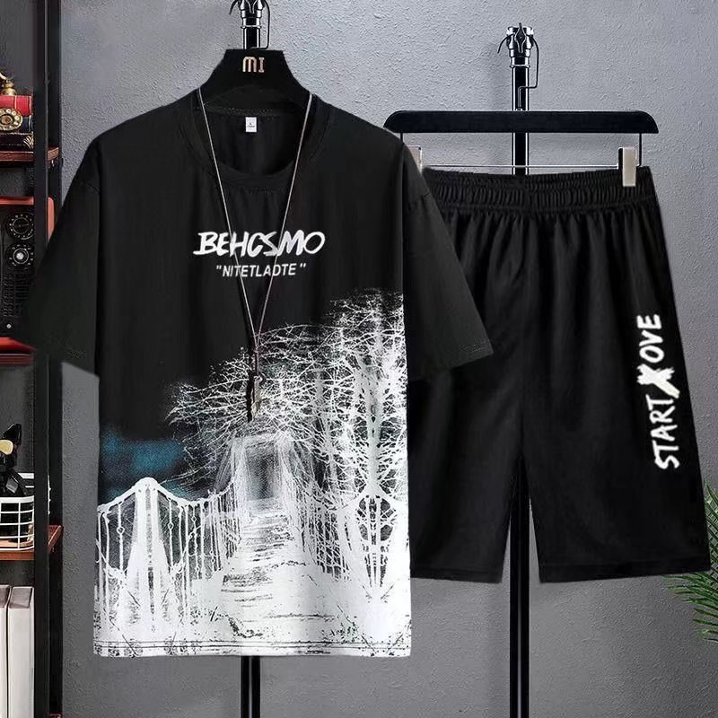 반팔 세트 남자 2024 년 여름 새로운 캐주얼 스포츠 반바지 투피스 세트 플러스 사이즈 십대 트렌드