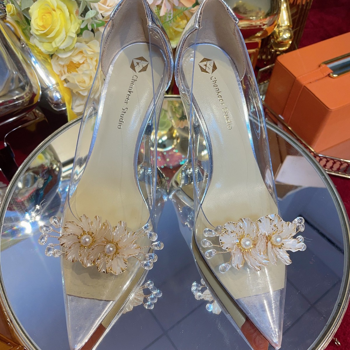 프랑스 투명 하이힐 여성용 스틸레토 힐 2024 여름 새로운 도착 아름다운 크리스탈 웨딩 신발 라인스톤 포인팅 신발스토어 가기