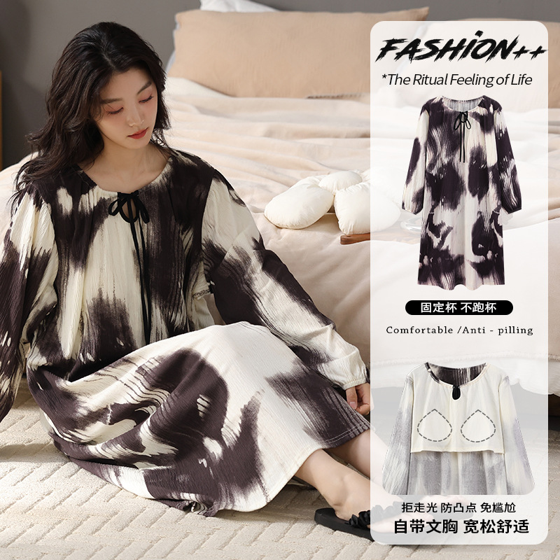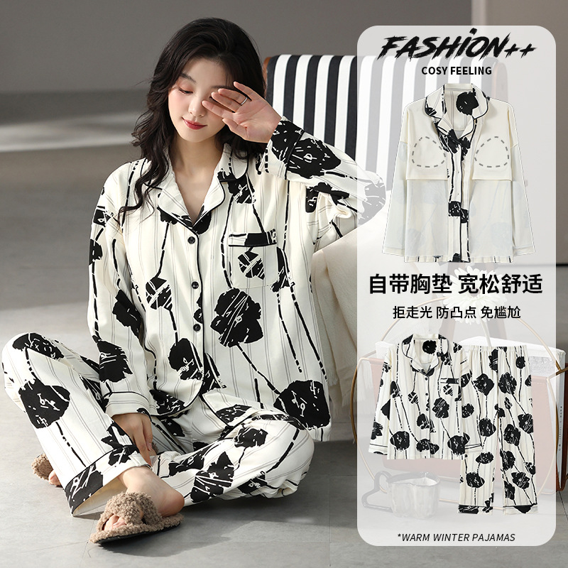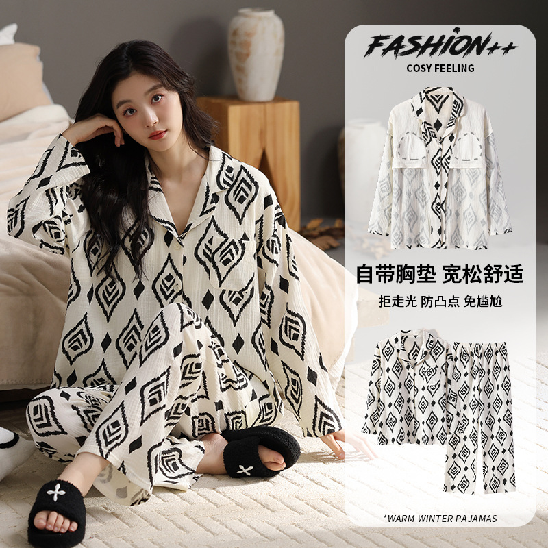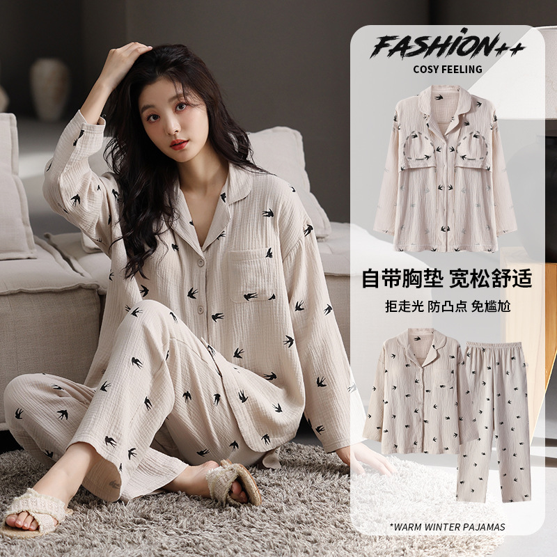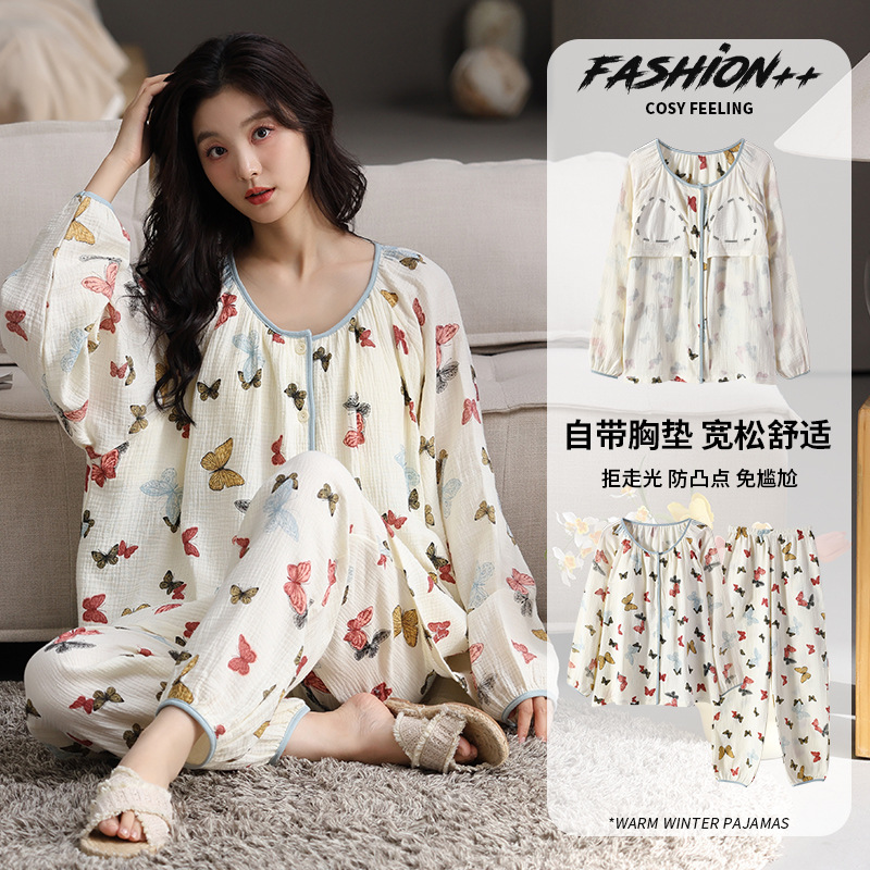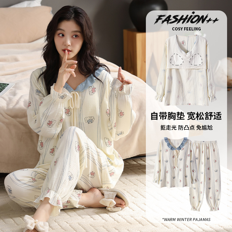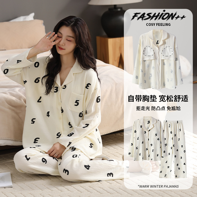 흐린 크레페 면사 6040 가슴 패드와 잠옷 여성 가을 카디건 긴 소매 바지 간단한 홈 의류 세트스토어 가기