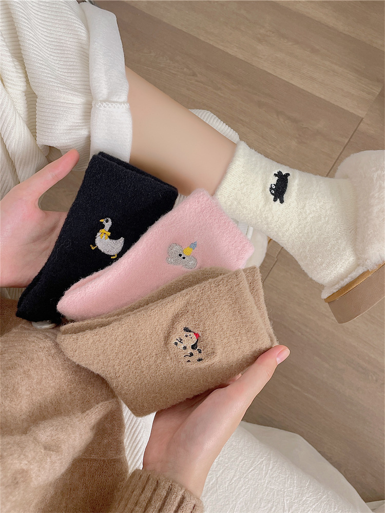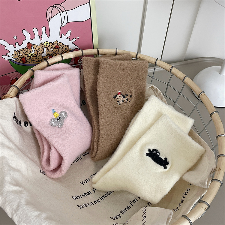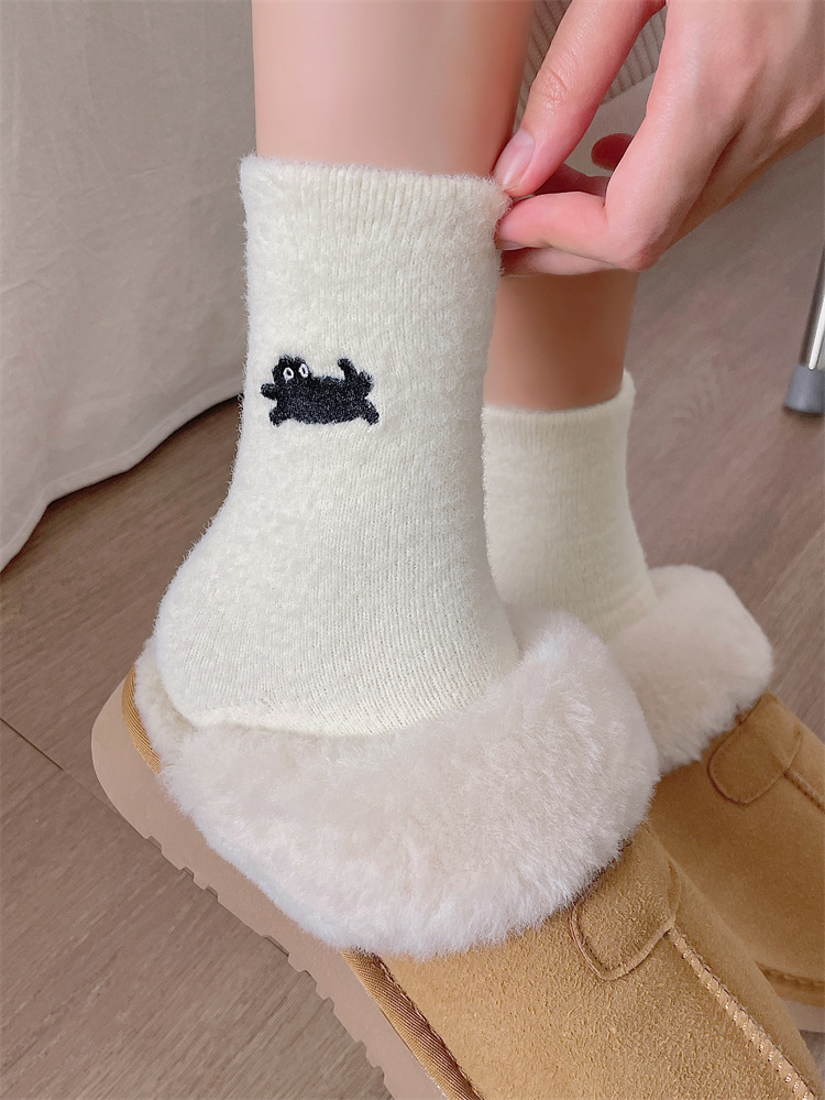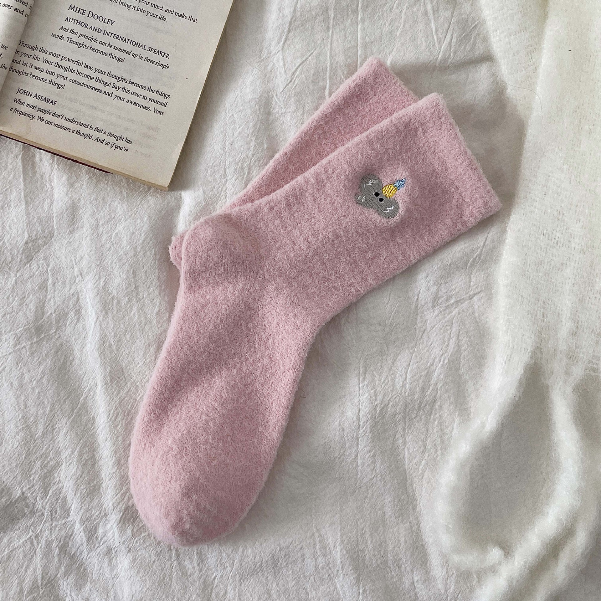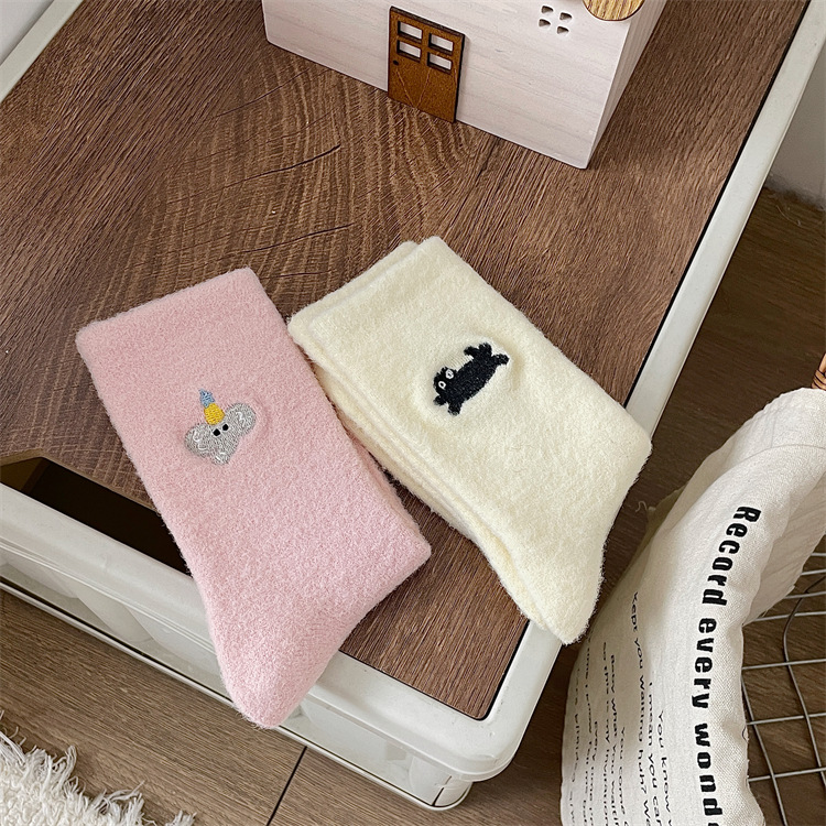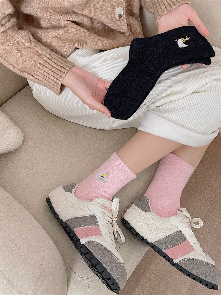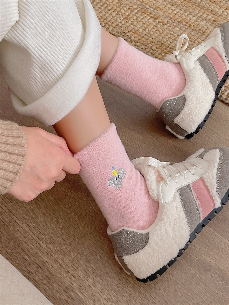 겨울 기모 두꺼운 따뜻한 양말 어린이 귀여운 만화 중간 길이 양말 한국 스타일 호주 벨벳 수면 양말 솔리드 컬러 문 양말