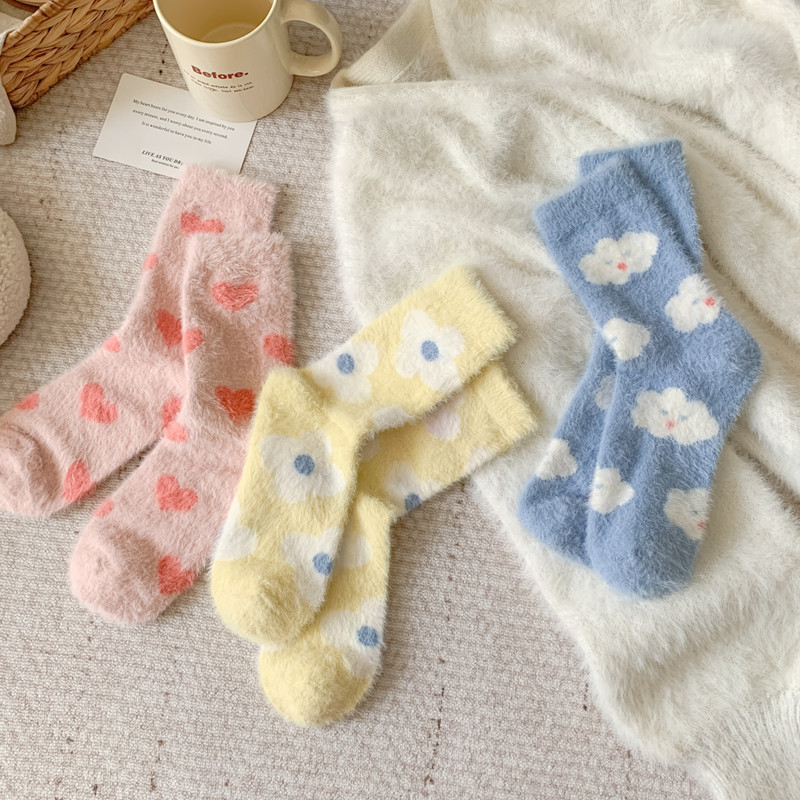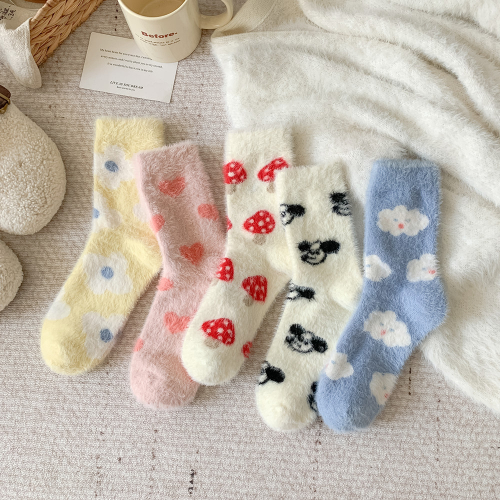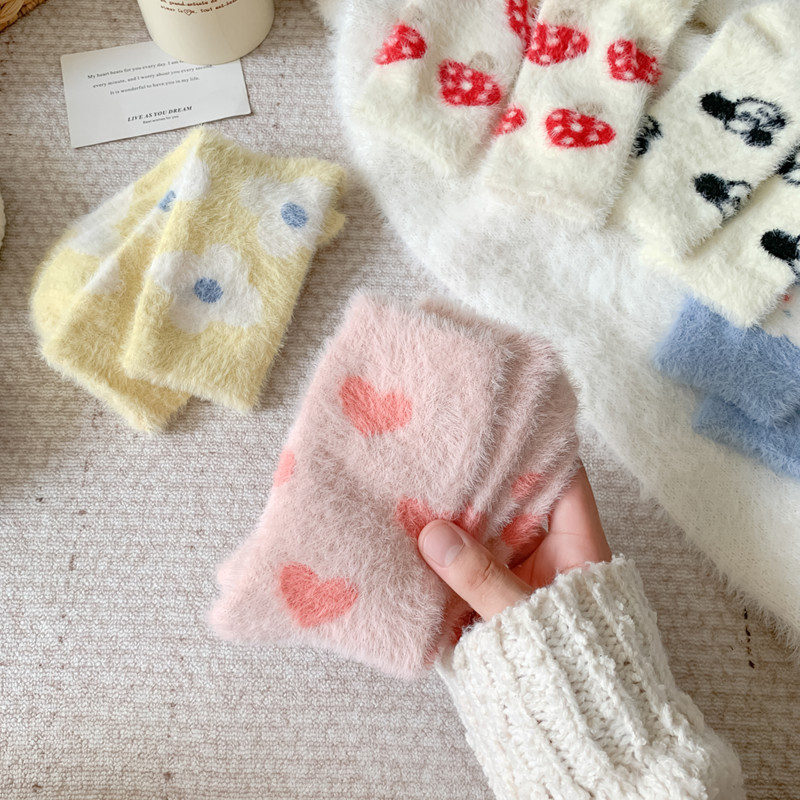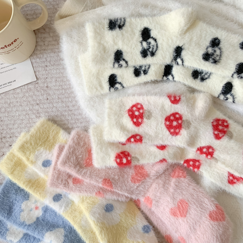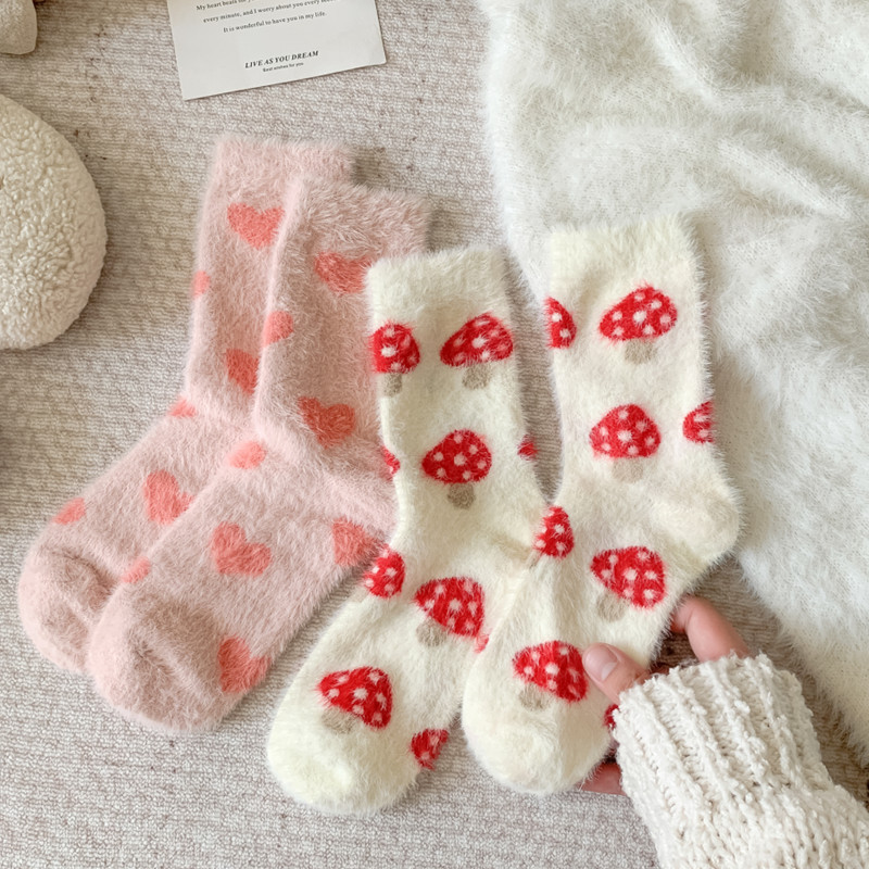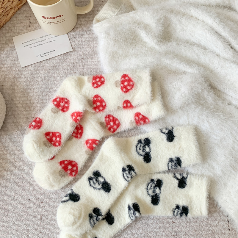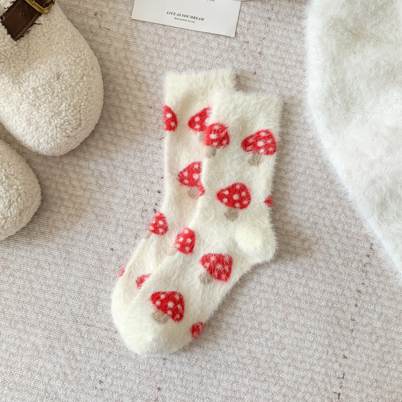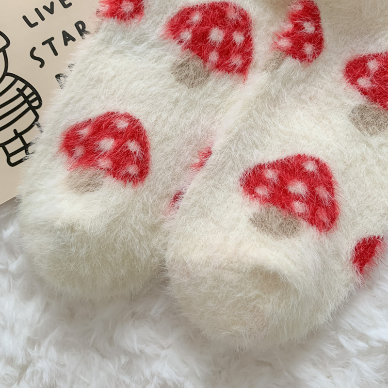 가을 겨울 신상 밍크 벨벳 종아리 양말 대학 스타일 사랑 버섯 두꺼운 따뜻한 밍크 벨벳 산후 양말 여성용