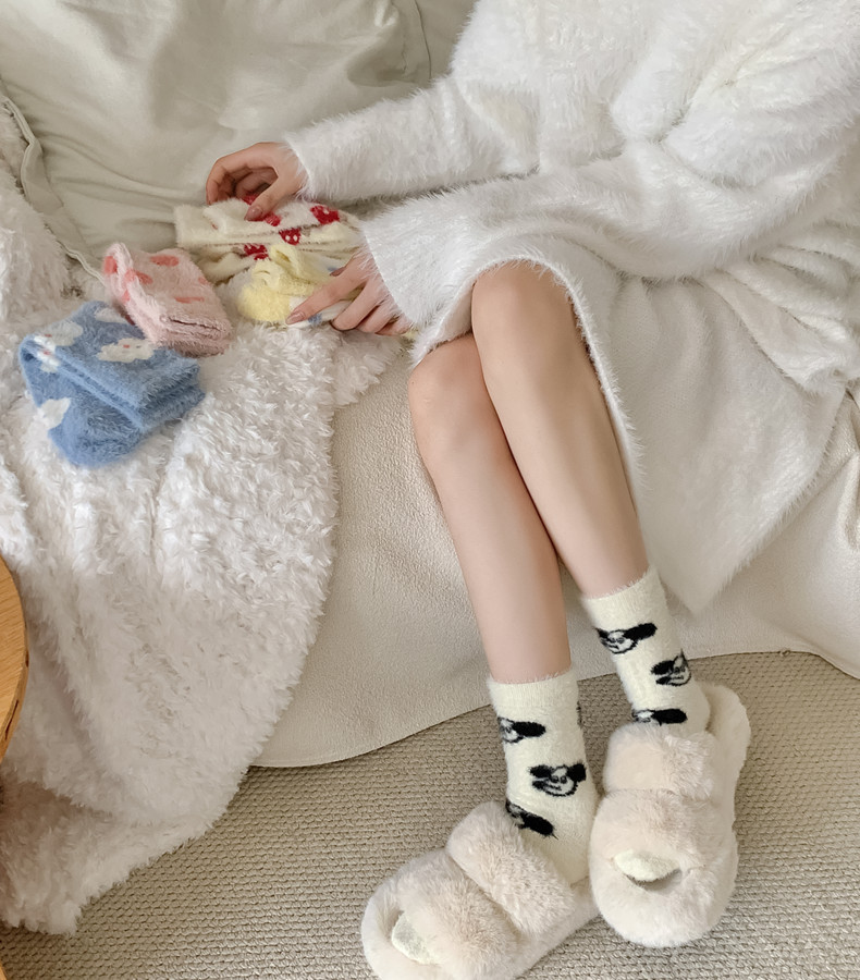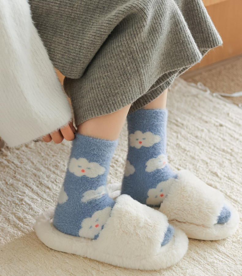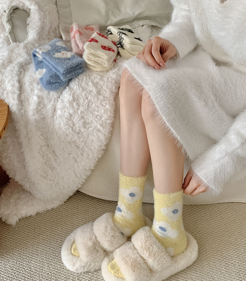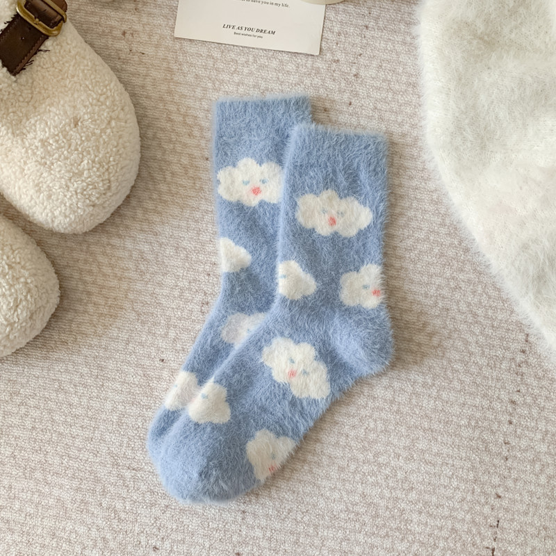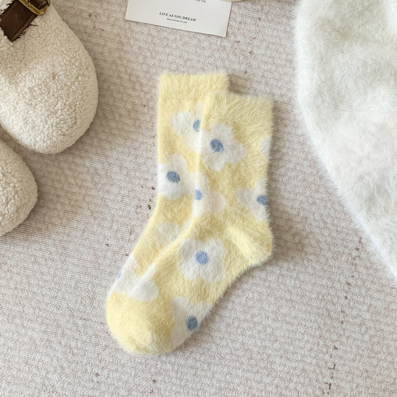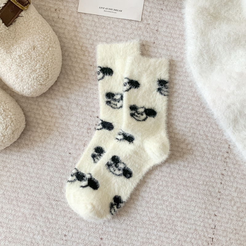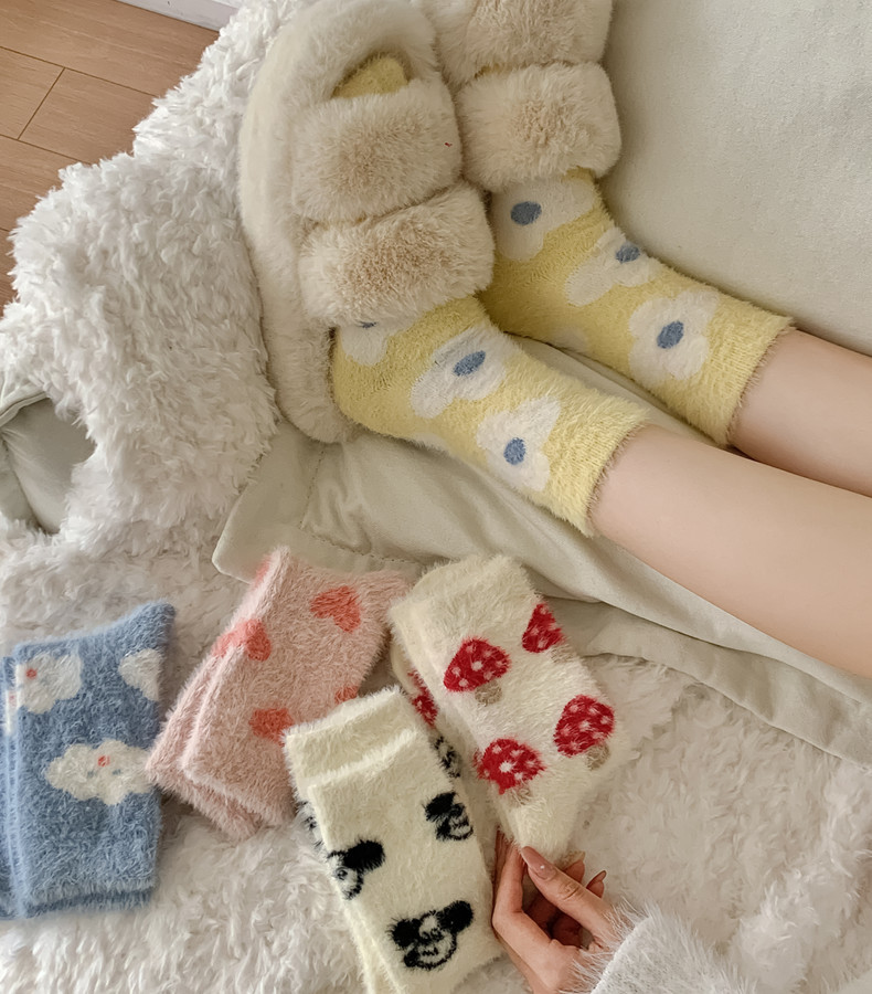 가을 겨울 신상 밍크 벨벳 종아리 양말 대학 스타일 사랑 버섯 두꺼운 따뜻한 밍크 벨벳 산후 양말 여성용