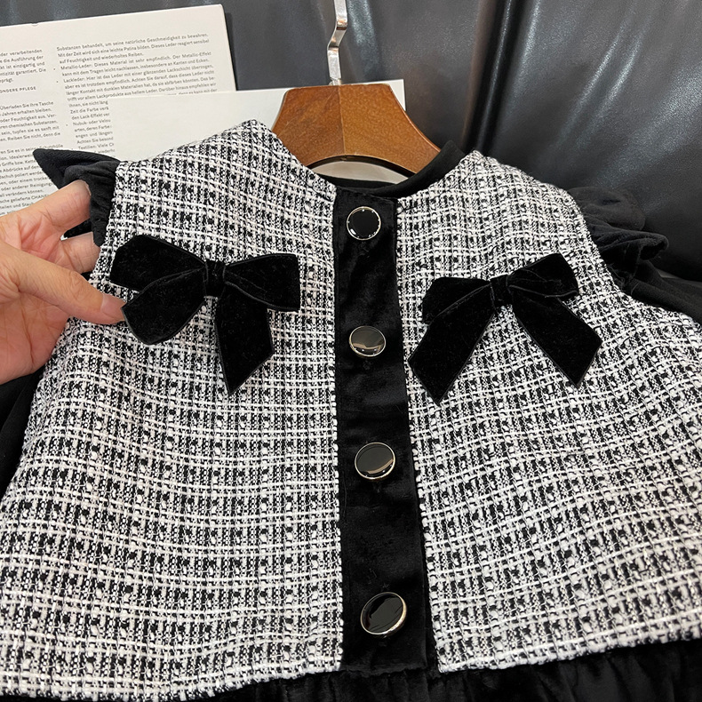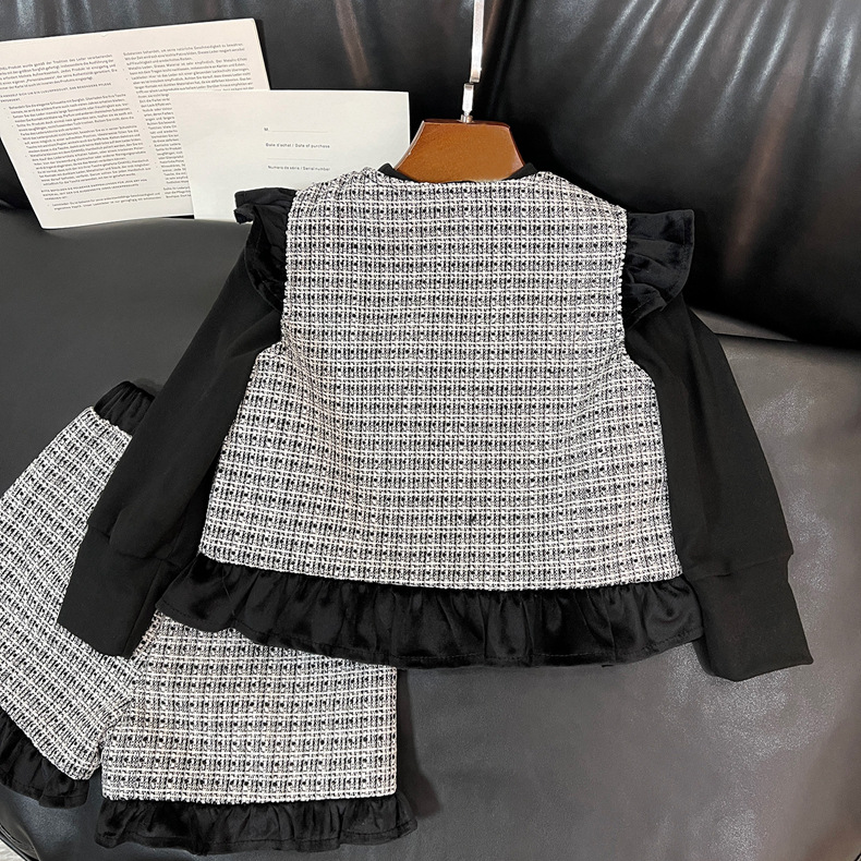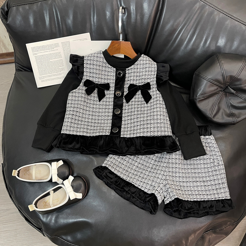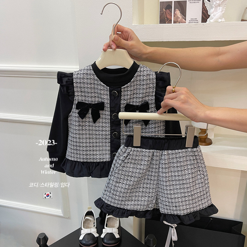 가을 2024 소녀 격자 무늬 샤넬 스타일 세트 활 어린이 조끼 긴 소매베이스 의류 및 반바지 3 종 세트스토어 가기