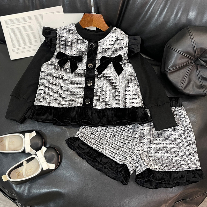 가을 2024 소녀 격자 무늬 샤넬 스타일 세트 활 어린이 조끼 긴 소매베이스 의류 및 반바지 3 종 세트