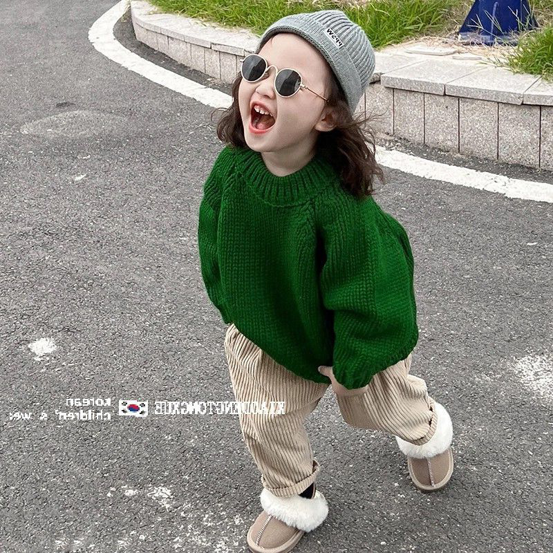 한국식 아동복 소녀 그린 스웨터 2024 가을 서양식 올매치 스웨터 보이 라운드 넥 롱 슬리브 탑스토어 가기